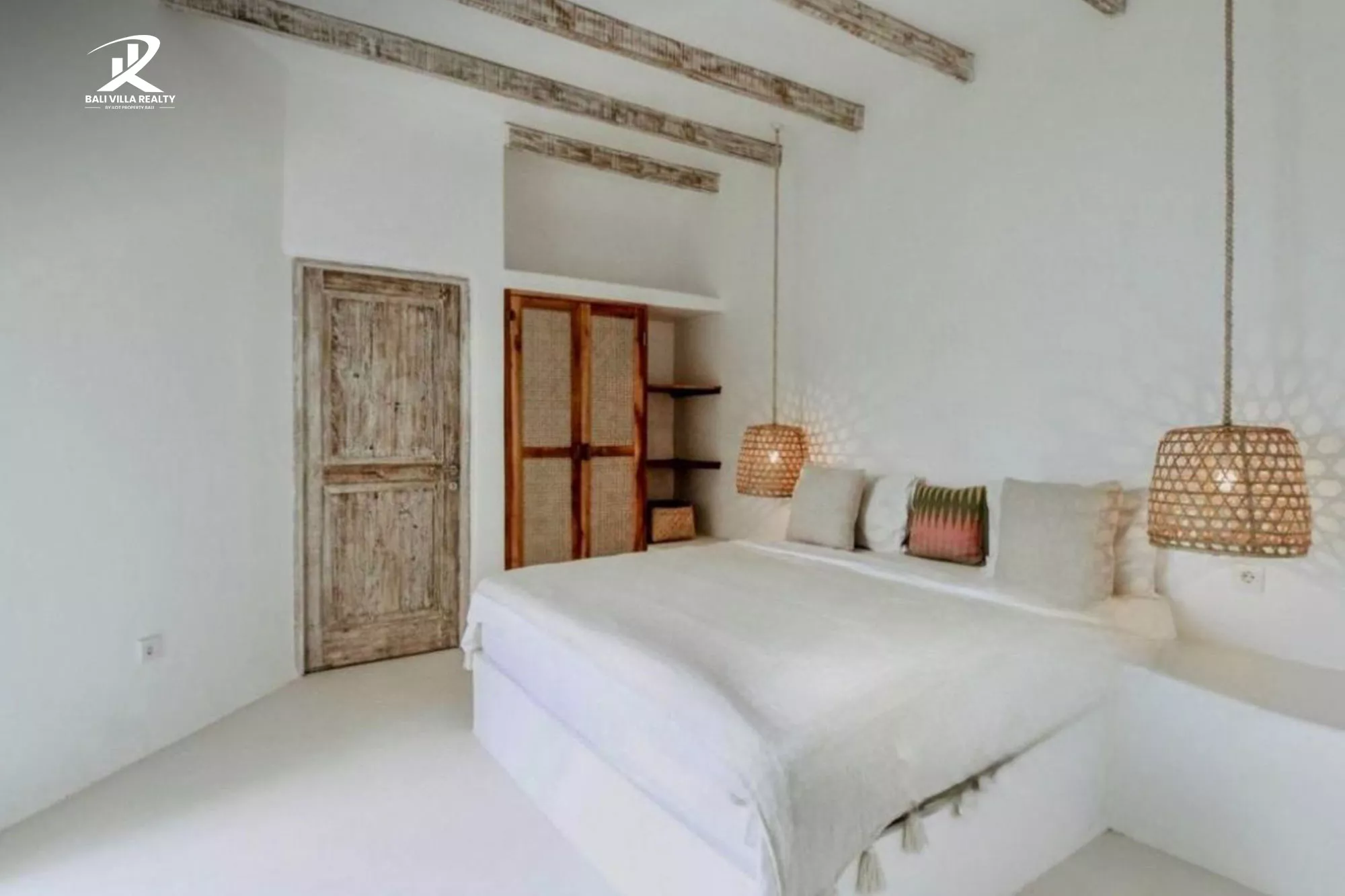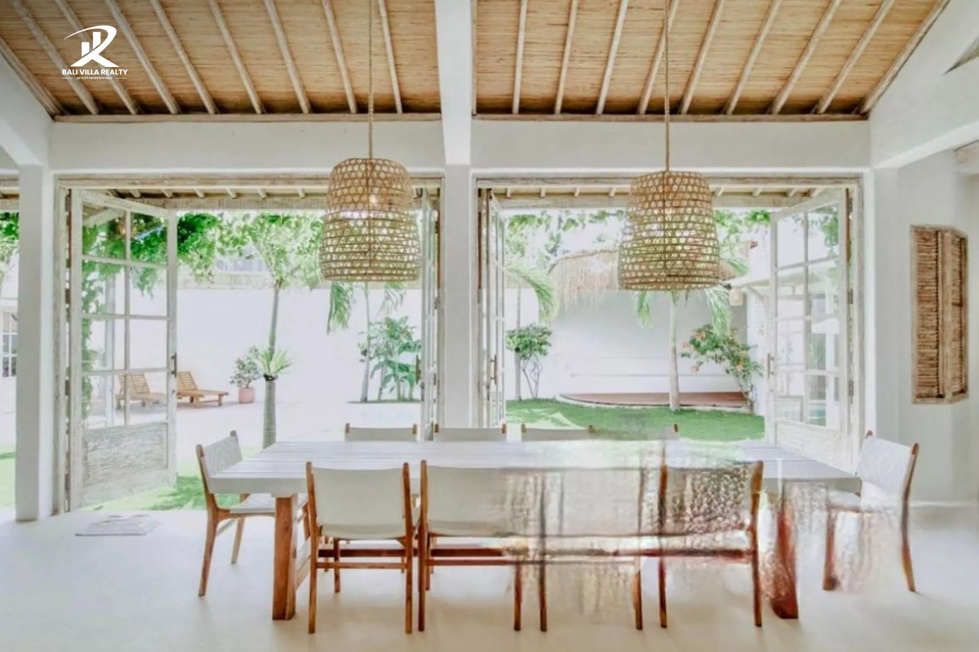 Step into a world of serene luxury at this breathtaking 4-bedroom villa, perfectly situated in the tranquil, sought-after neighborhood of Bumbak, Umalas. This property effortlessly captures the essence of Bali living, blending crisp, white architecture with natural textures like the magnificent rattan light fixtures, exposed wooden beams, and a stunning thatched (or bamboo-lined) high roof.