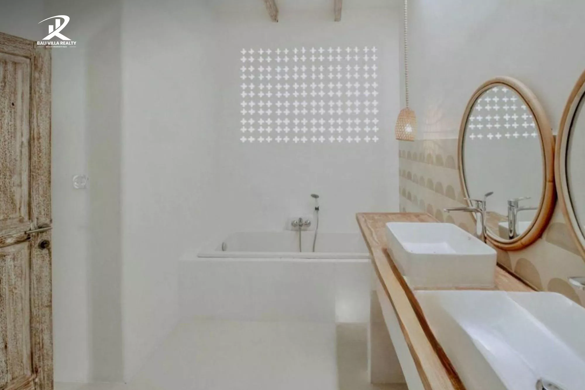Each of the four bedrooms is a quiet, minimalist sanctuary, designed for ultimate rest. The bathrooms feature a clean, spa-like feel with natural wood accents and a deep soaking tub in the master suite. With its prime location—peaceful and secluded yet just a quick drive to the trendy cafes of Canggu and the chic boutiques of Seminyak—this villa is the perfect base for your unforgettable Bali escape, whether you’re seeking a family holiday or a stunning group retreat.
