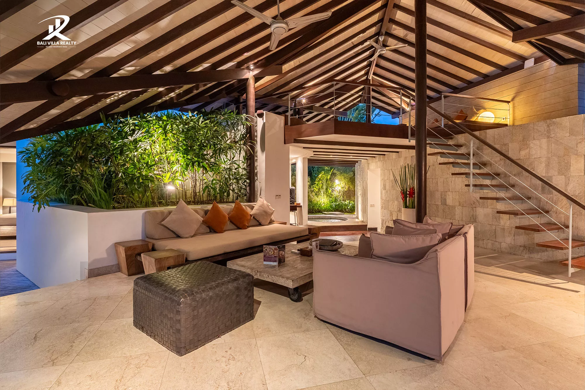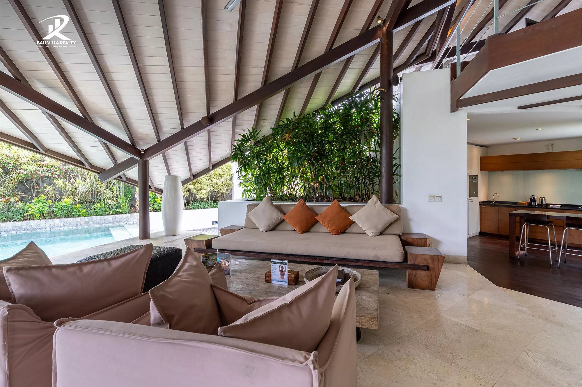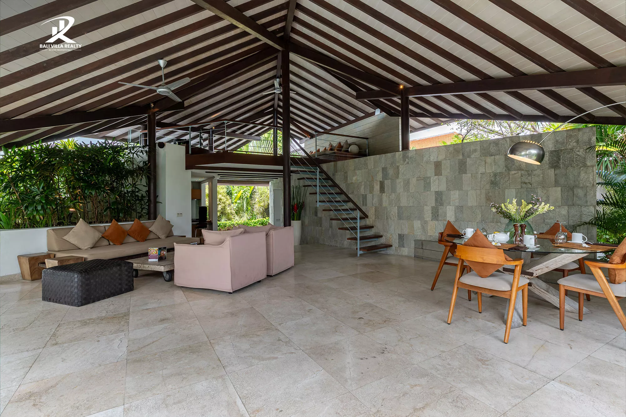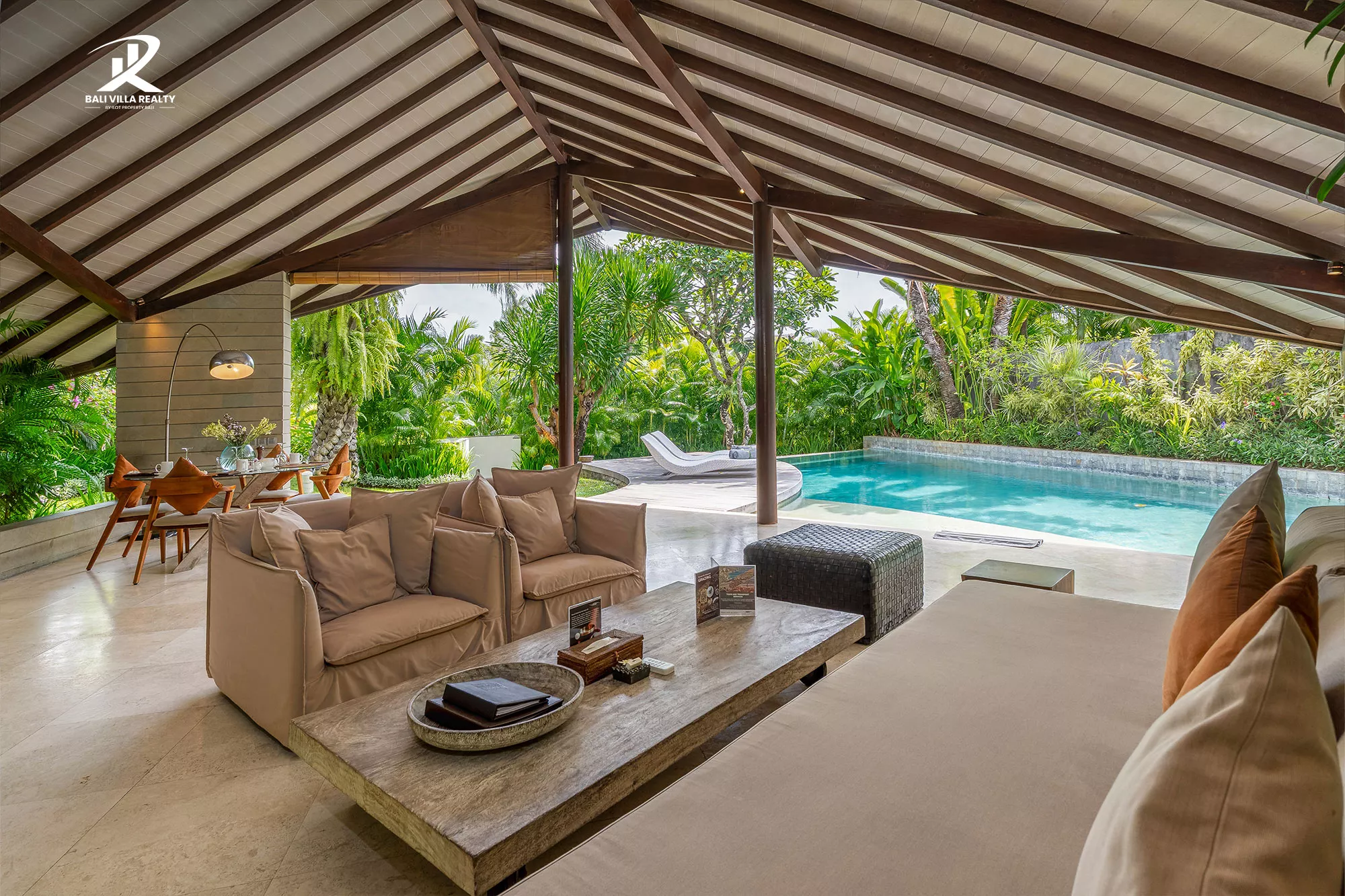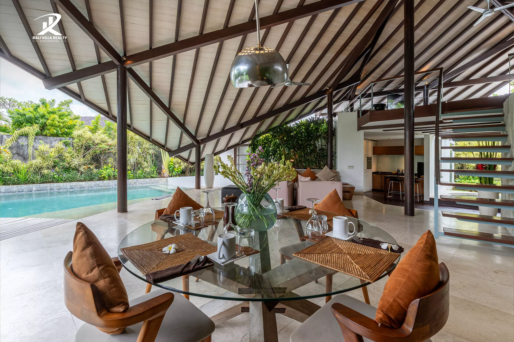 Designed for true indoor-outdoor living, the villa features a magnificent high, vaulted roof (Joglo-style) over the main living pavilion, allowing for constant breezes and tropical views. The open-plan area includes a stylish dining space and a comfortable sunken lounge, all flowing seamlessly onto the sun deck.