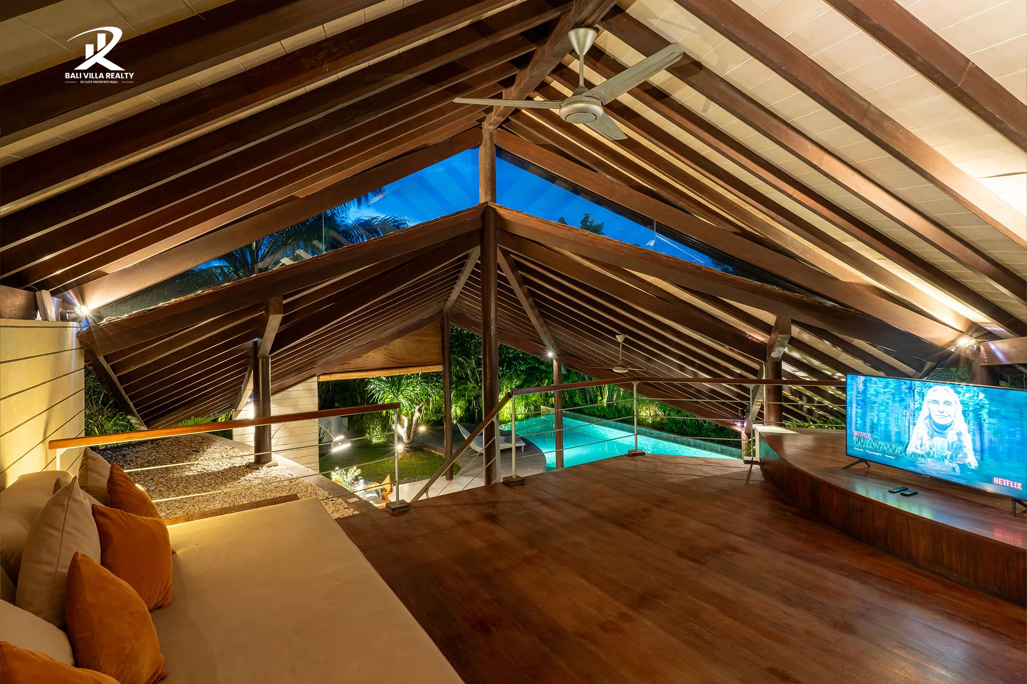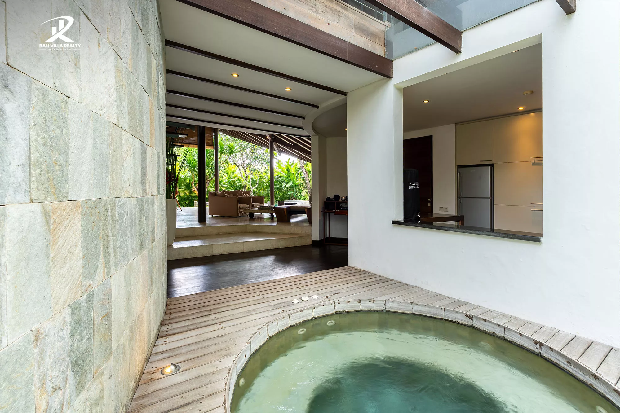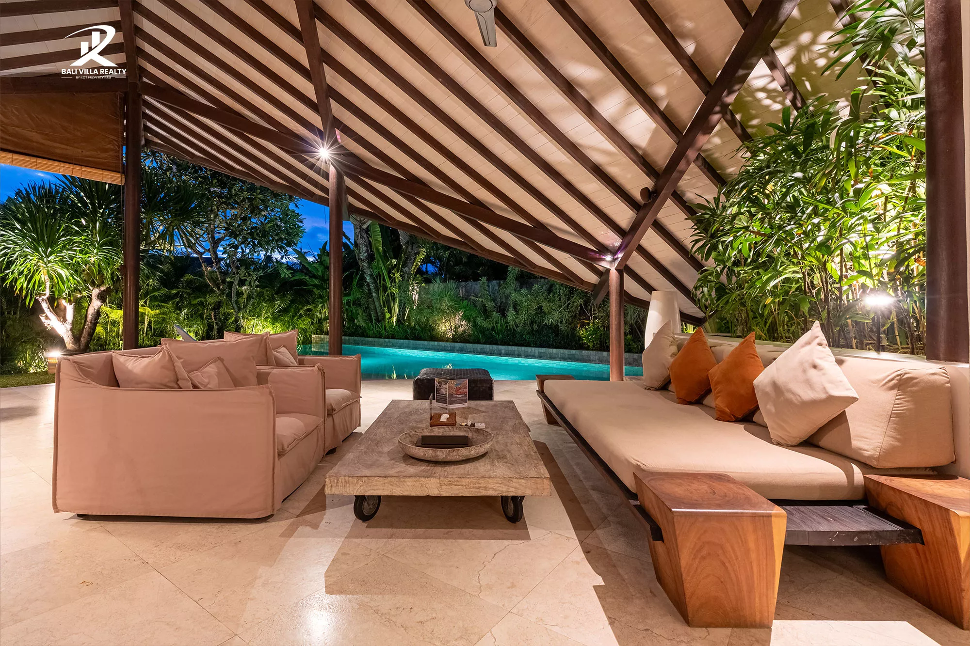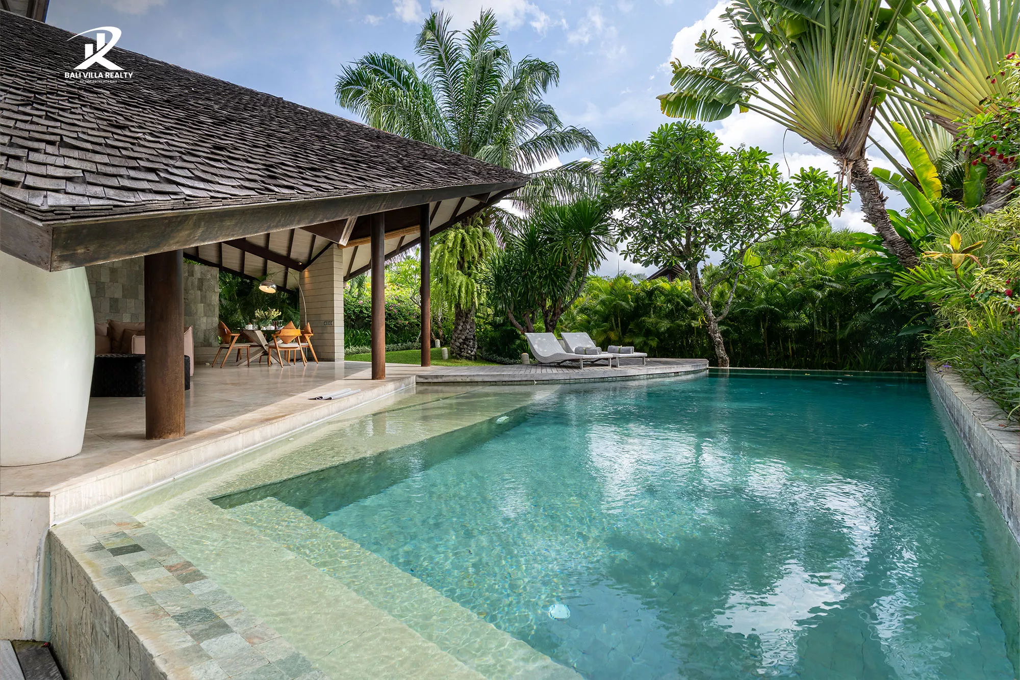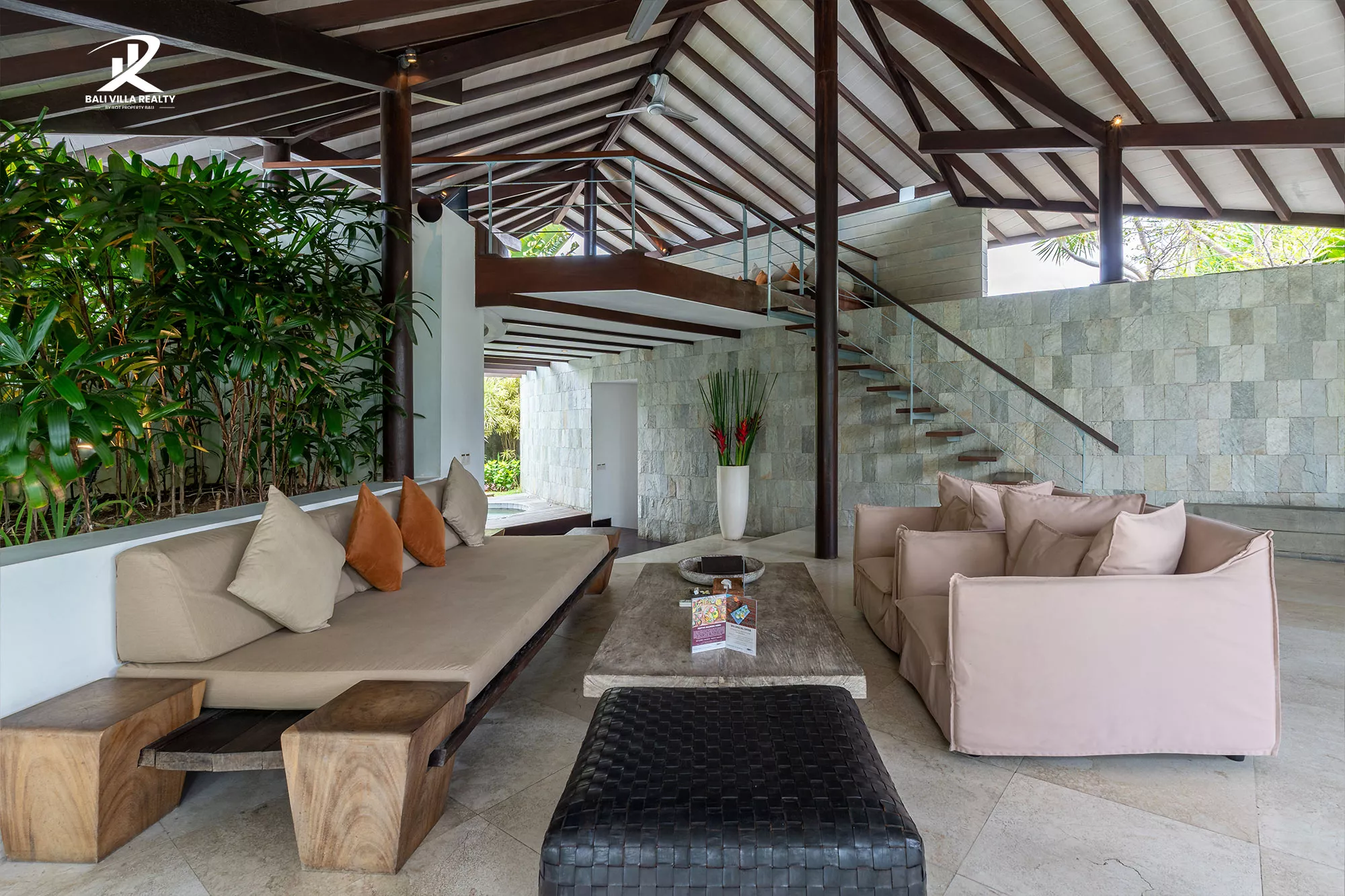 Designed for true indoor-outdoor living, the villa features a magnificent high, vaulted roof (Joglo-style) over the main living pavilion, allowing for constant breezes and tropical views. The open-plan area includes a stylish dining space and a comfortable sunken lounge, all flowing seamlessly onto the sun deck.