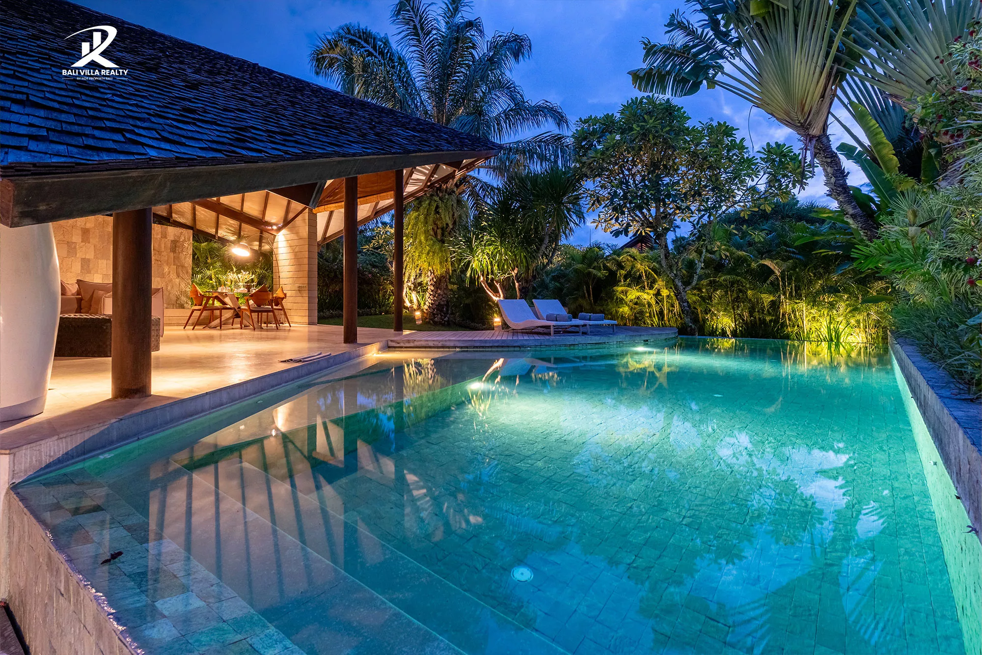 The stunning private swimming pool is the centerpiece, lined with gorgeous turquoise tile and framed by a rich wood deck and lush tropical foliage. High-quality finishes abound, including light marble flooring, contemporary stone feature walls, and sleek, modern kitchens.
