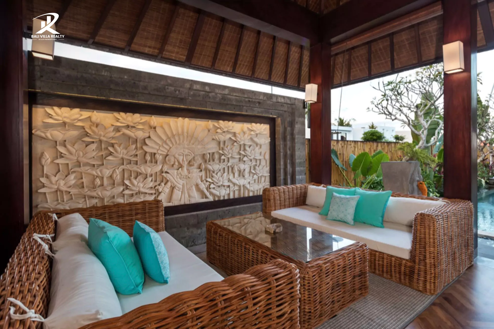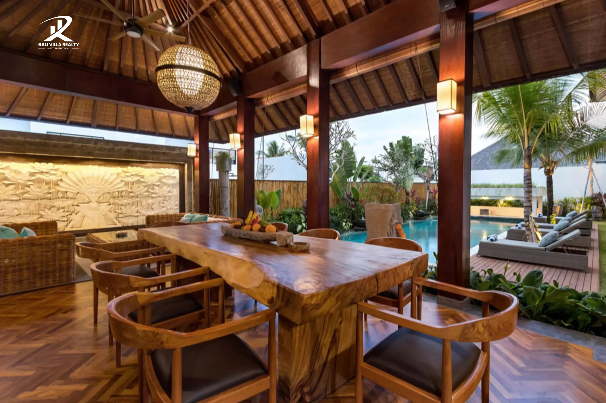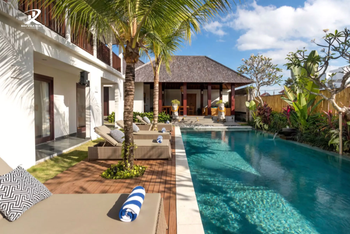 Surrounded by exotic plants and a bamboo privacy fence, the villa ensures peace and seclusion while still being close to nearby attractions. Relax under swaying palm trees by your sparkling private pool, surrounded by vibrant greenery and chic sun loungers. Whether you’re basking in the sun or enjoying a refreshing dip, the outdoor area is designed for pure indulgence.
