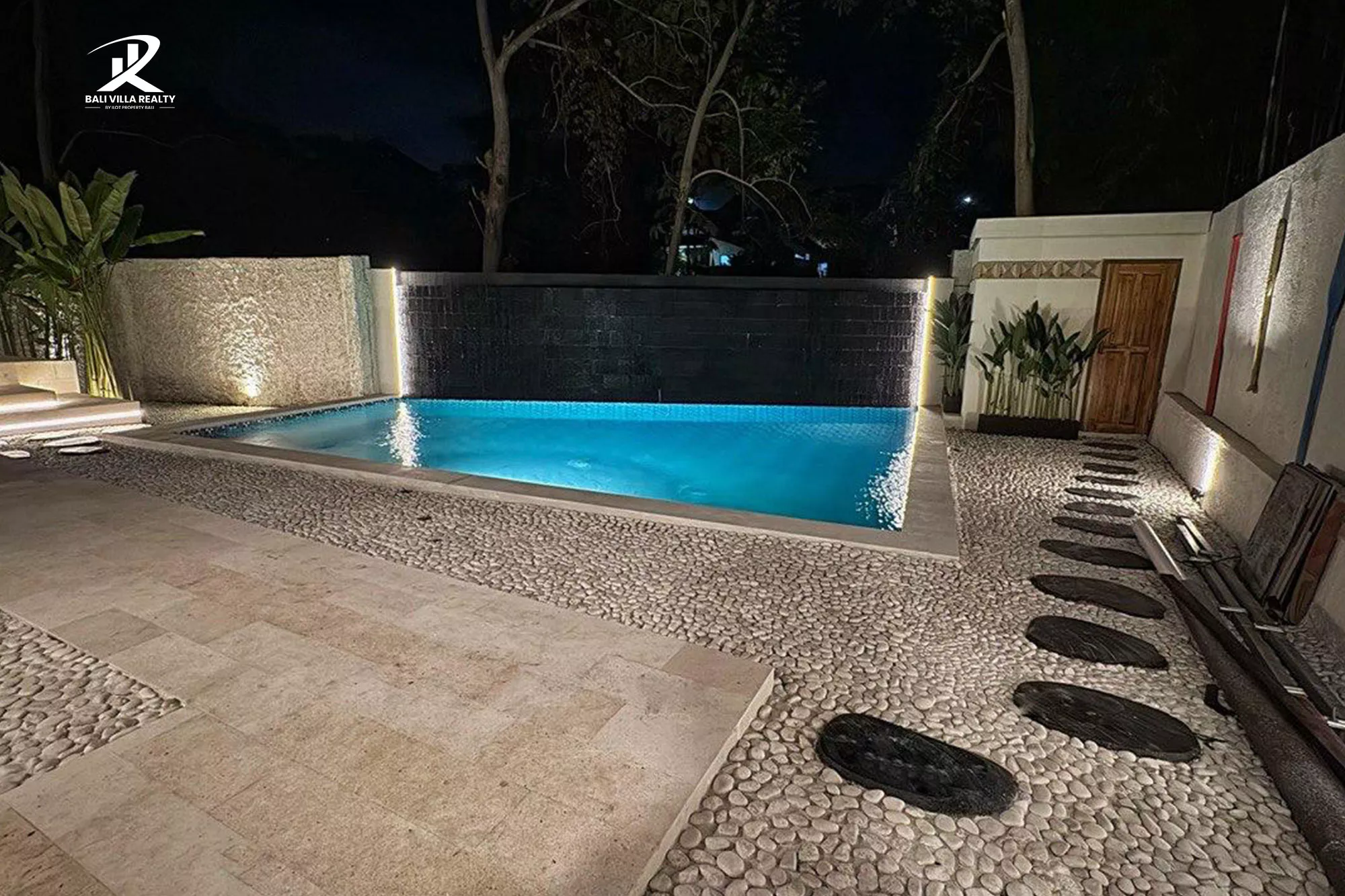 - Outdoor Living: Beautiful private swimming pool with a dramatic stone waterfall wall, surrounded by lush foliage and a mix of pebble and limestone decking.