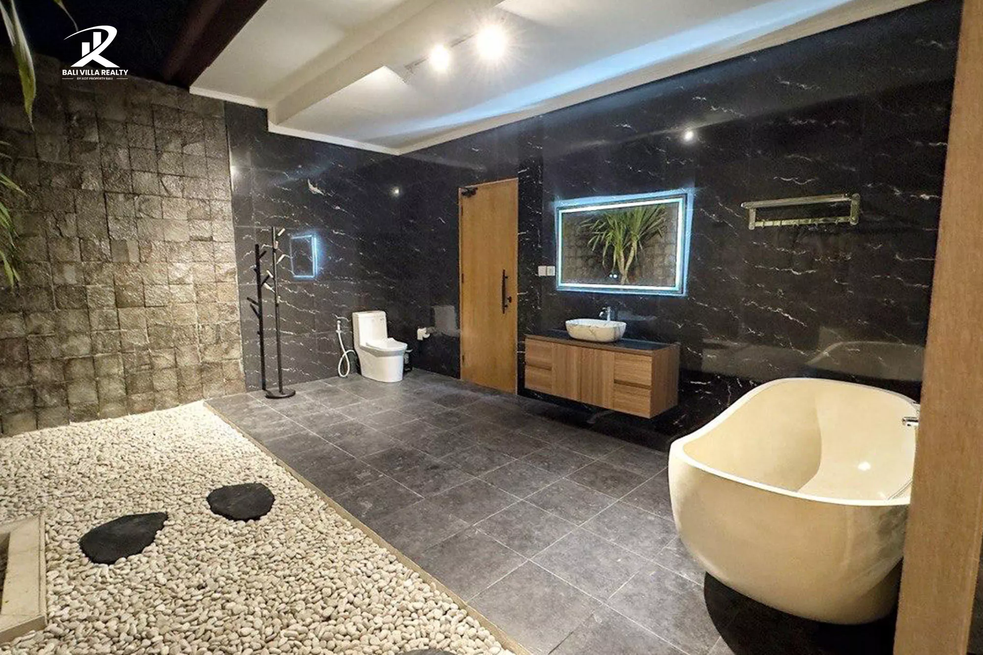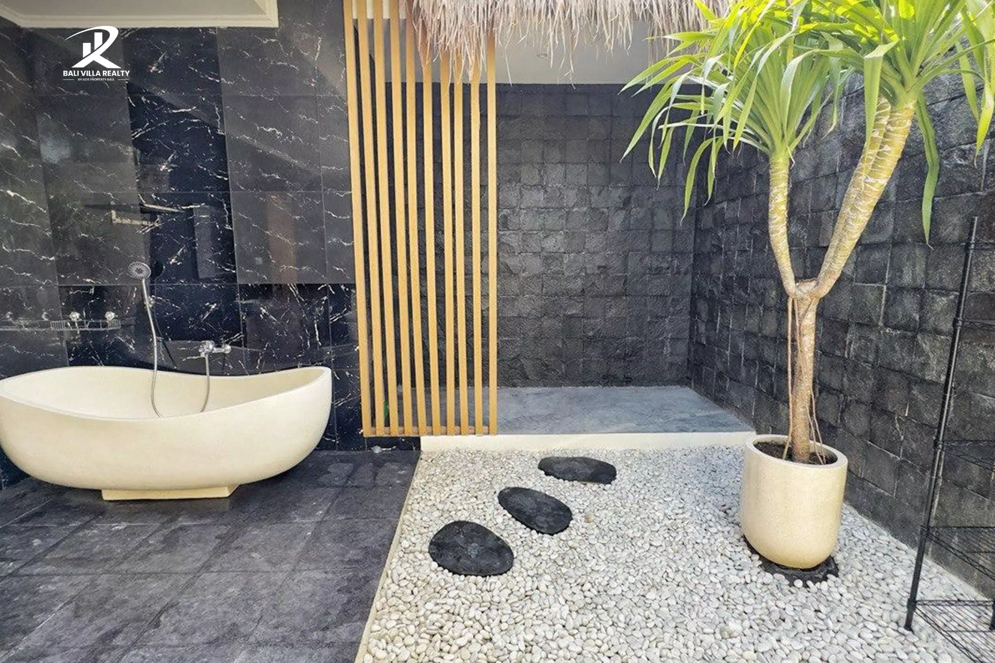 The bathrooms are a sanctuary of their own, featuring striking black marble walls, contemporary fittings, and tranquil outdoor shower areas with smooth white river stones, bringing the spa experience right to your home.
