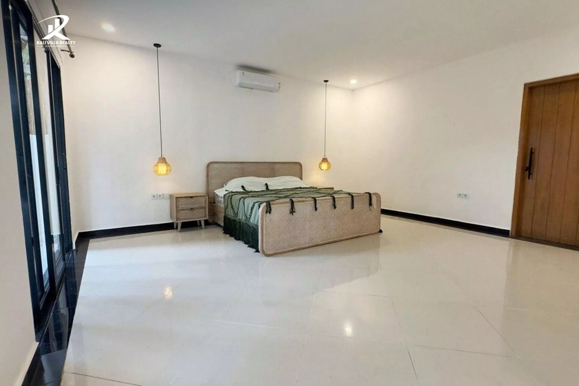 - Bedrooms: Two spacious, bright bedrooms featuring contemporary rattan-style beds and modern pendant lighting.