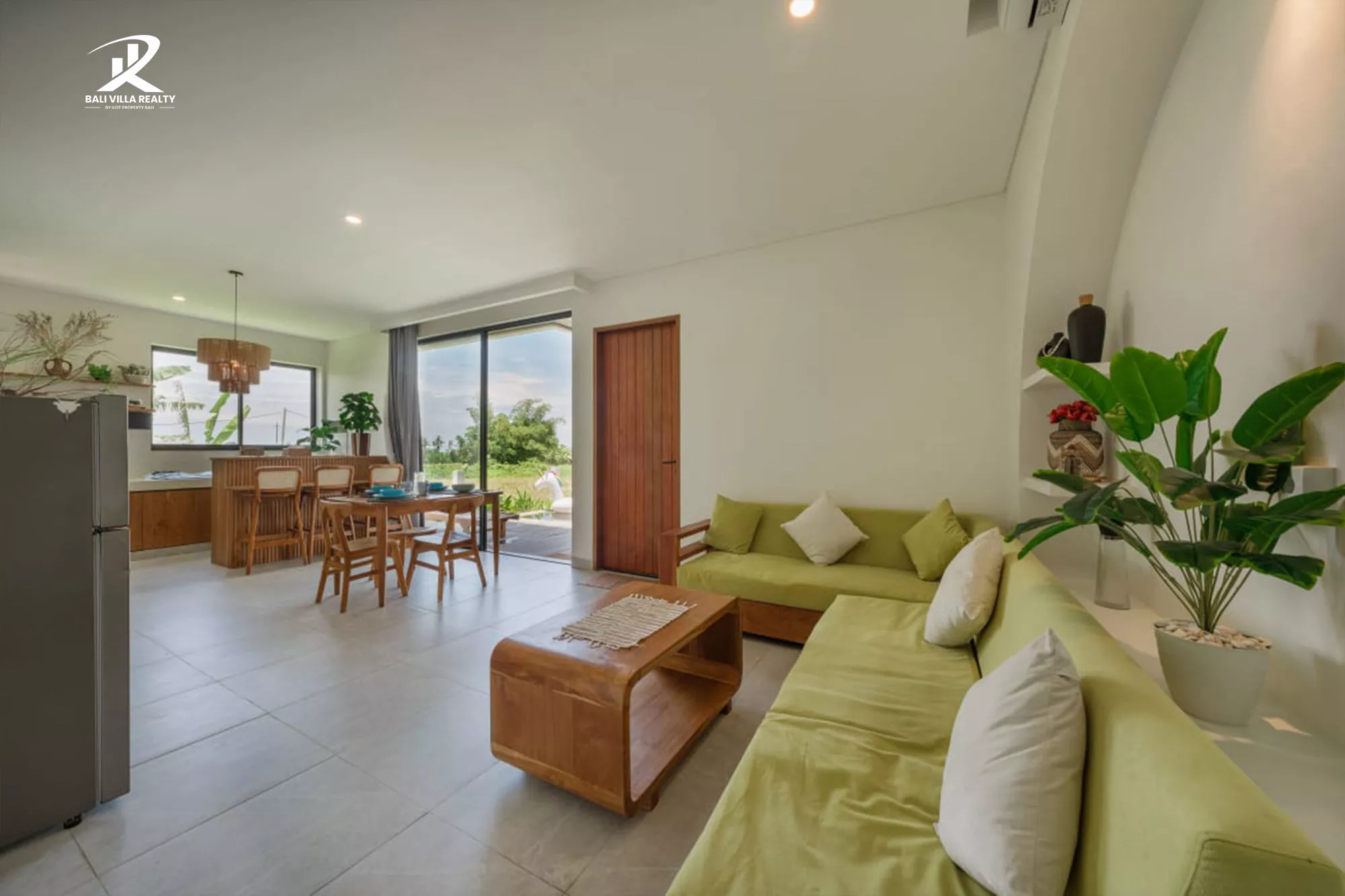 The interiors are finished in a clean, contemporary style with warm wooden accents, including beautiful custom furniture and paneling that contrasts perfectly with the bright, white walls. The open-plan living area and kitchen flow seamlessly via large sliding doors to the private pool, connecting guests directly to the tranquil Balinese environment.