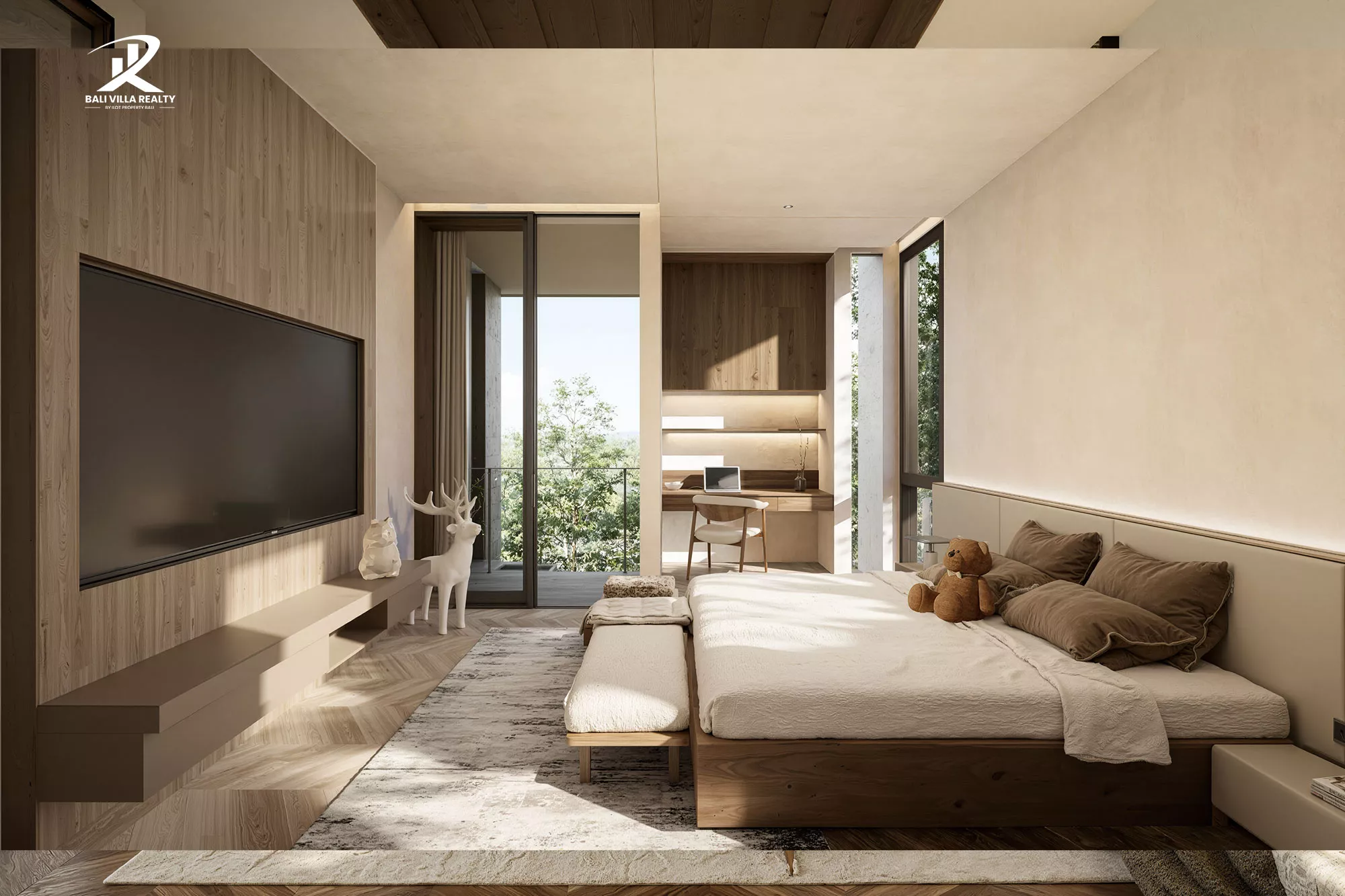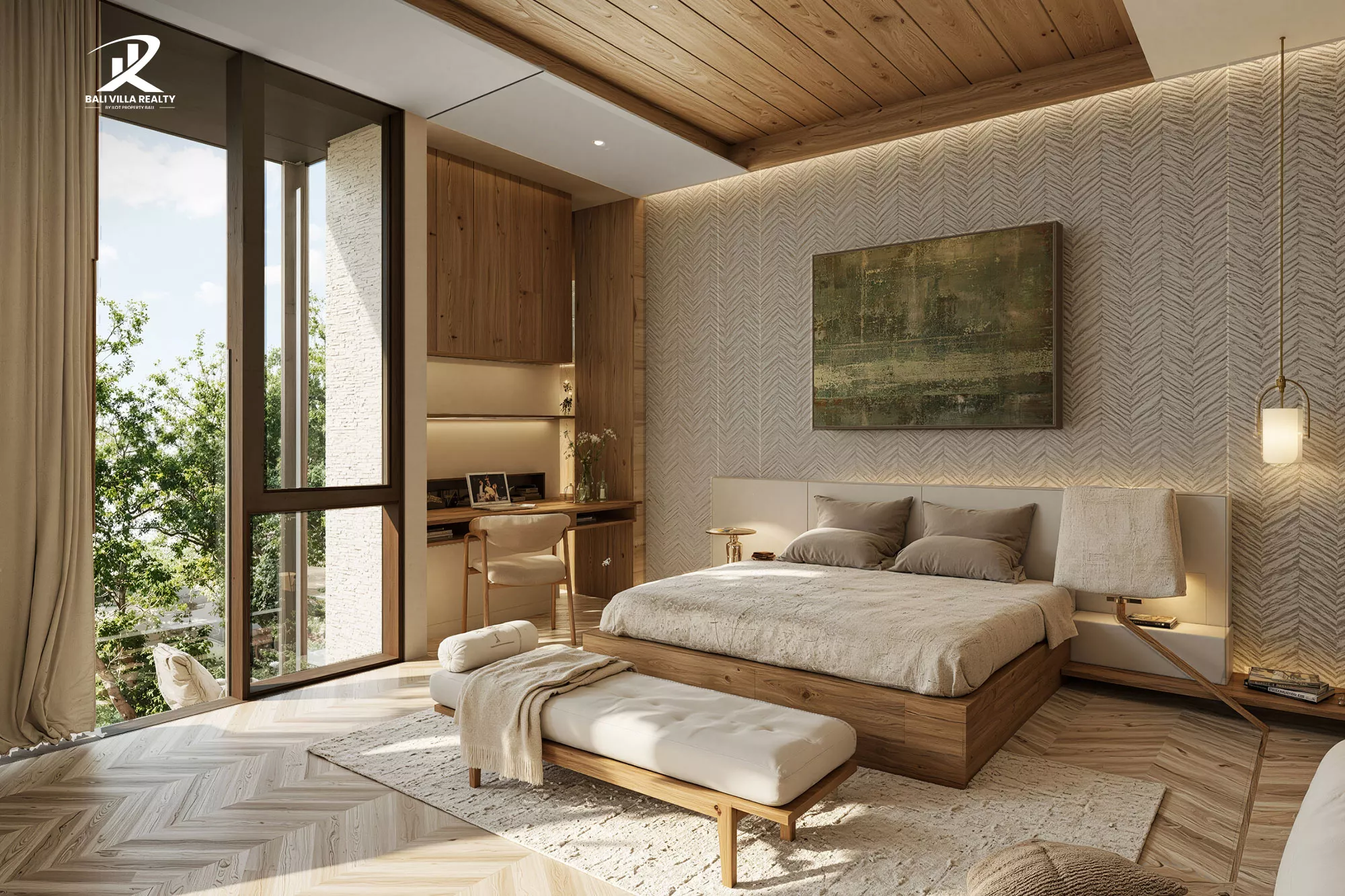 Premium Interiors and Amenities: The kitchen is a dedicated space for the chef, featuring a grand marble island, premium appliances, and artistic pendant lighting. The Master Bedroom is designed as a sanctuary, boasting warm wood floors and ceilings, a hidden desk area, and direct views of the greenery. The primary bathroom includes a lavish freestanding bathtub for a private, spa-like experience.