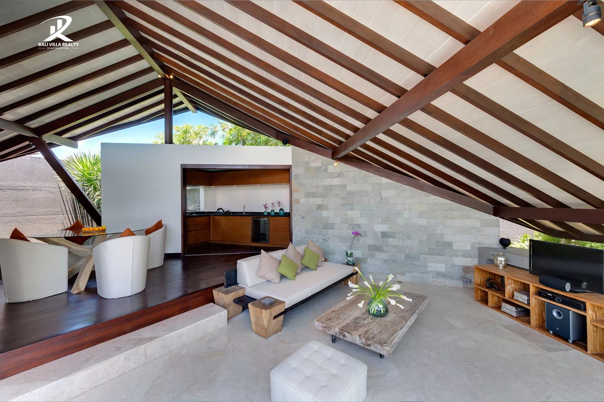 The magnificent main pavilion features a high-vaulted, exposed timber roof, creating a breezy, open-air living space that seamlessly integrates with the lush tropical gardens. This area includes a comfortable lounge, a sleek dining space, and a modern, fully-equipped kitchen.