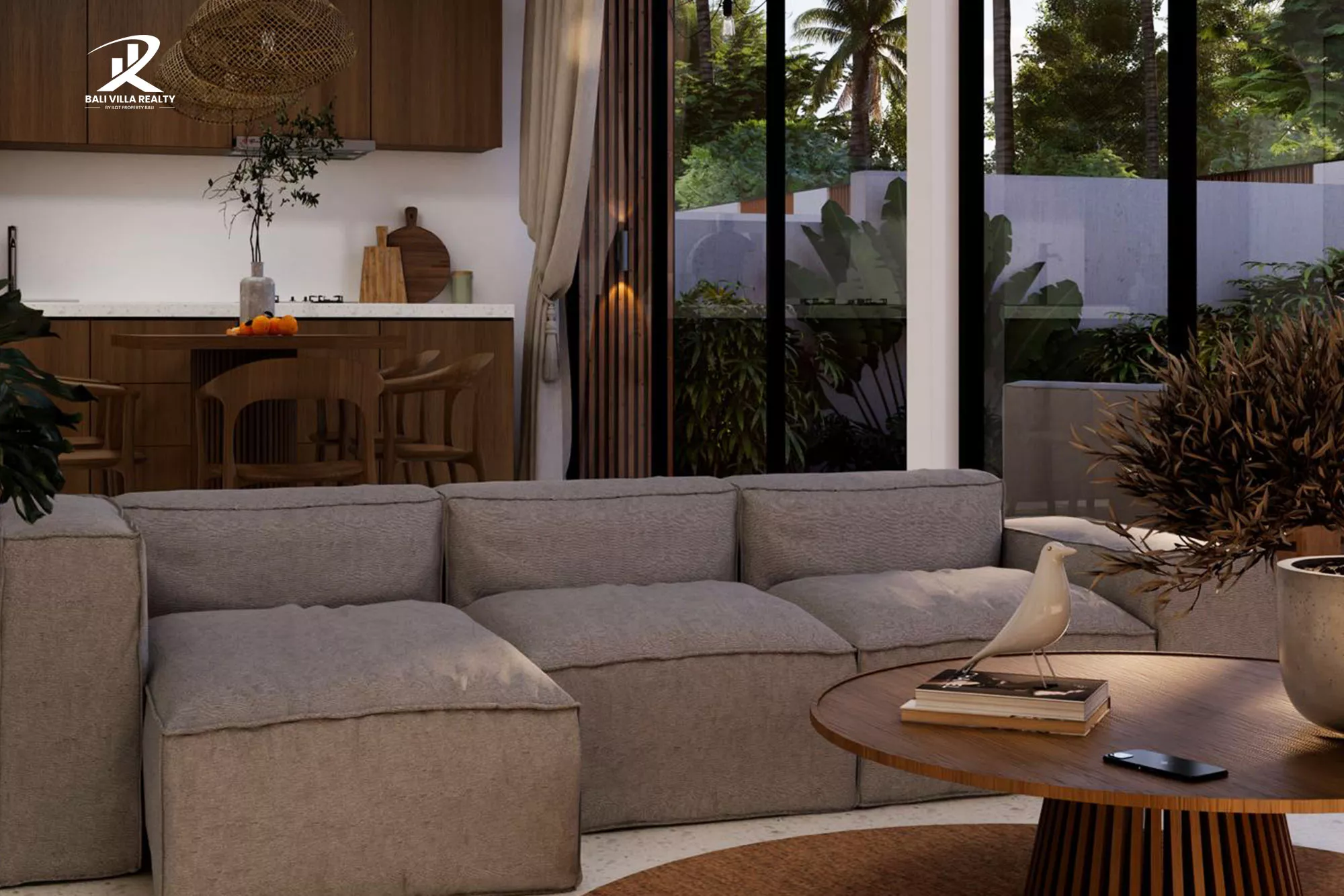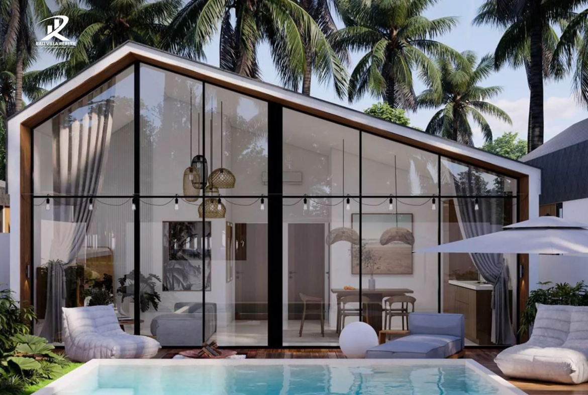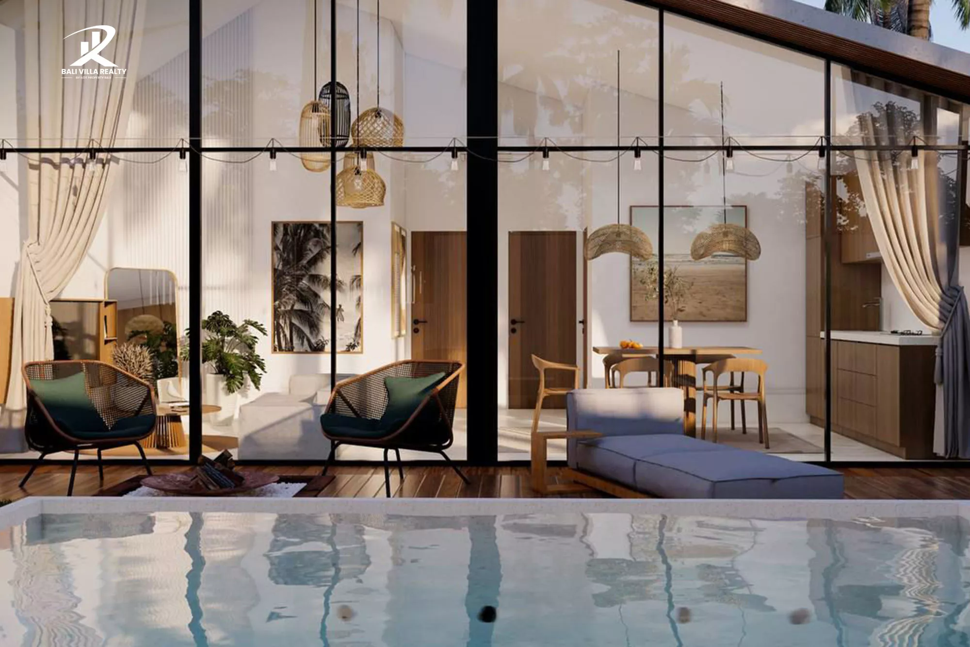 Step into a world of sophisticated comfort where expansive glass walls invite the lush Balinese outdoors in, creating a seamless connection with nature. The elegantly furnished interiors feature a spacious open-plan living and dining area, complete with a state-of-the-art kitchen, all bathed in natural light and adorned with tasteful, contemporary decor.