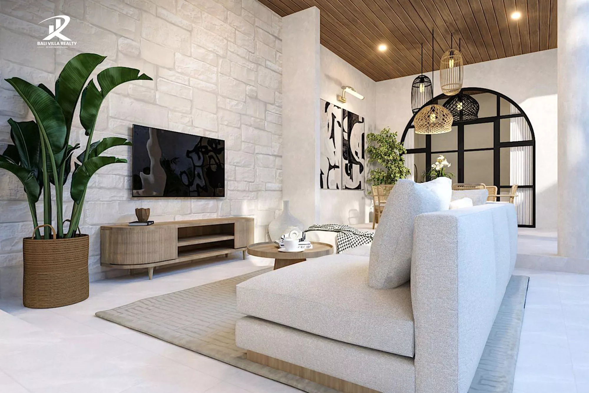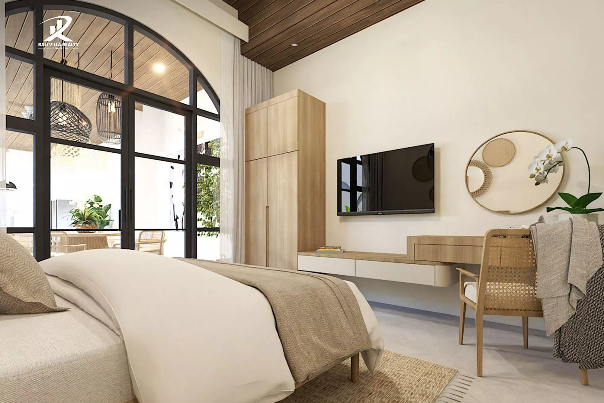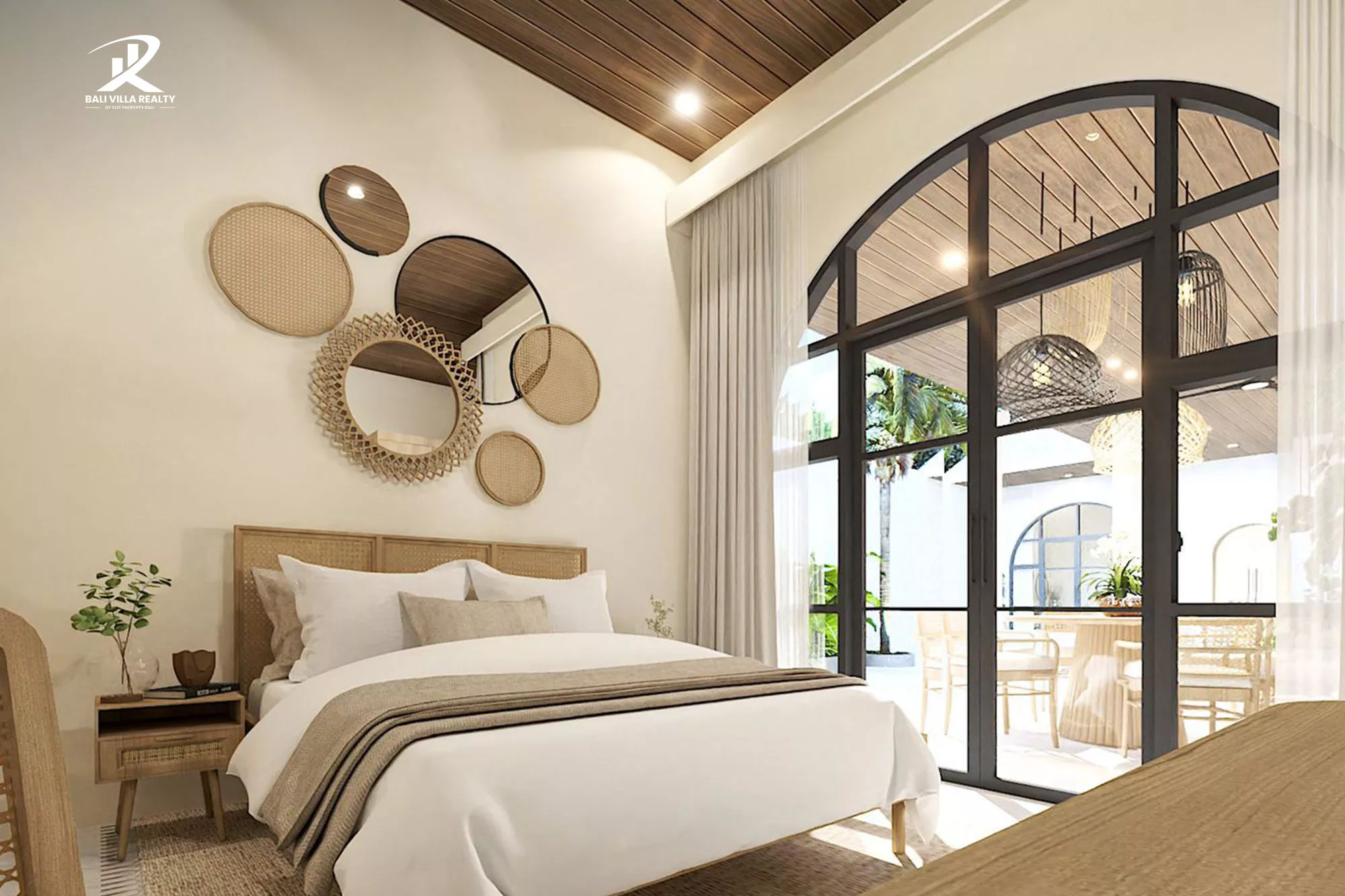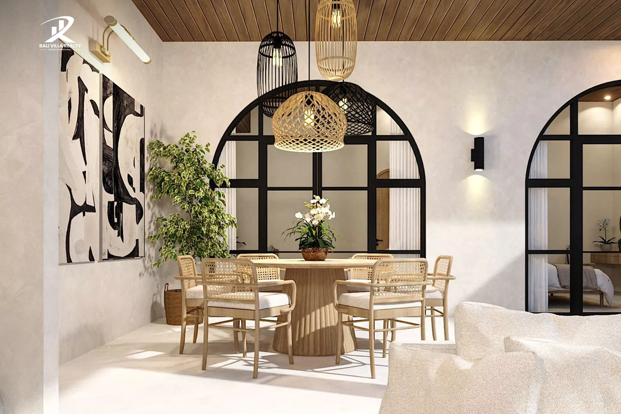 - Architecture: Unique Mediterranean-Balinese design with iconic arched windows and clean white stucco.