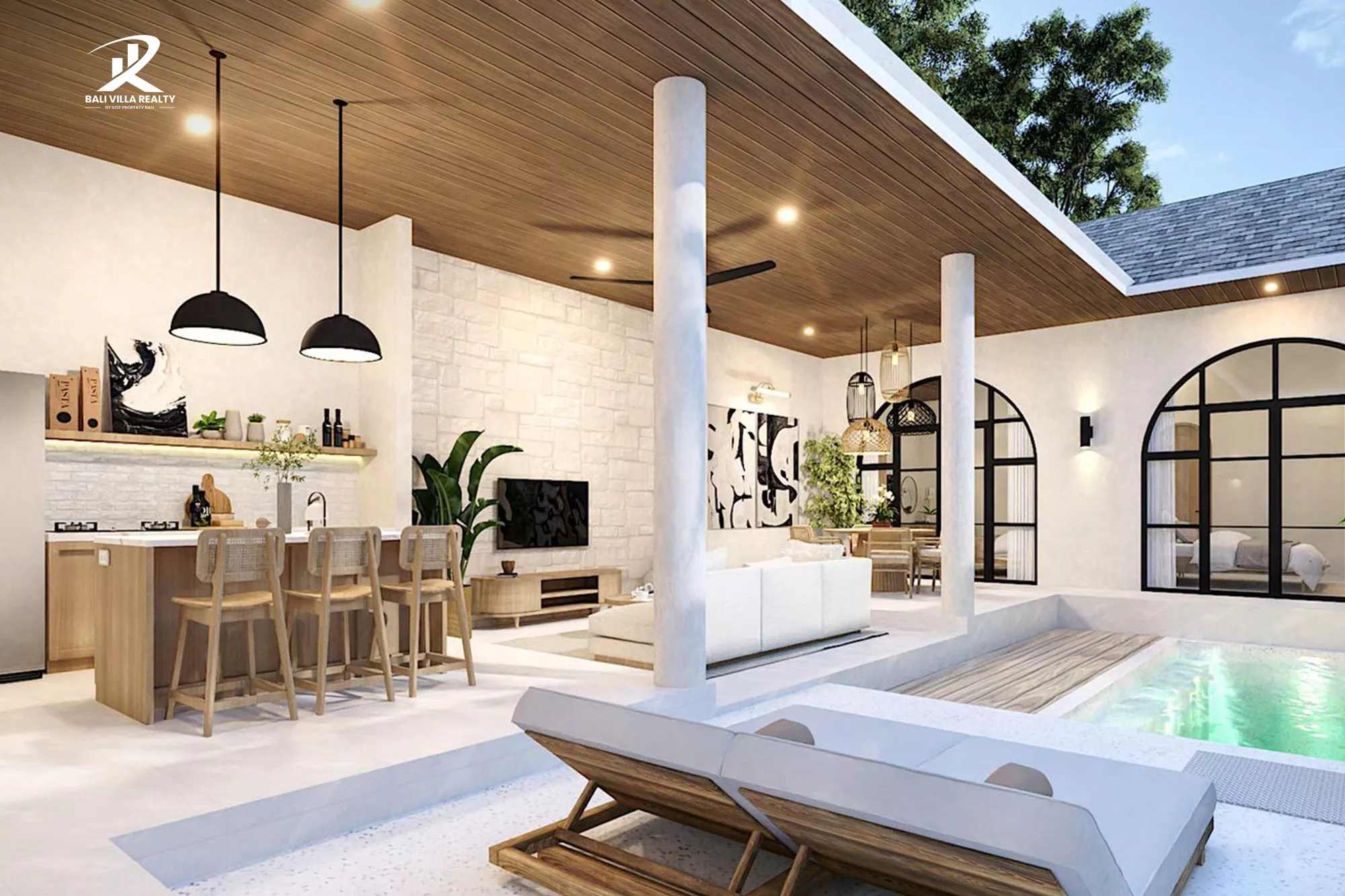 This property immediately captivates with its signature features: majestic arched windows, textured white walls, and warm timber accents. The villa is designed around a stunning central courtyard, where the sparkling swimming pool acts as the heart of the home, framed by sun loungers and a cozy arched seating niche. The open sky above and the clean,geometric lines create an atmosphere of expansive elegance.