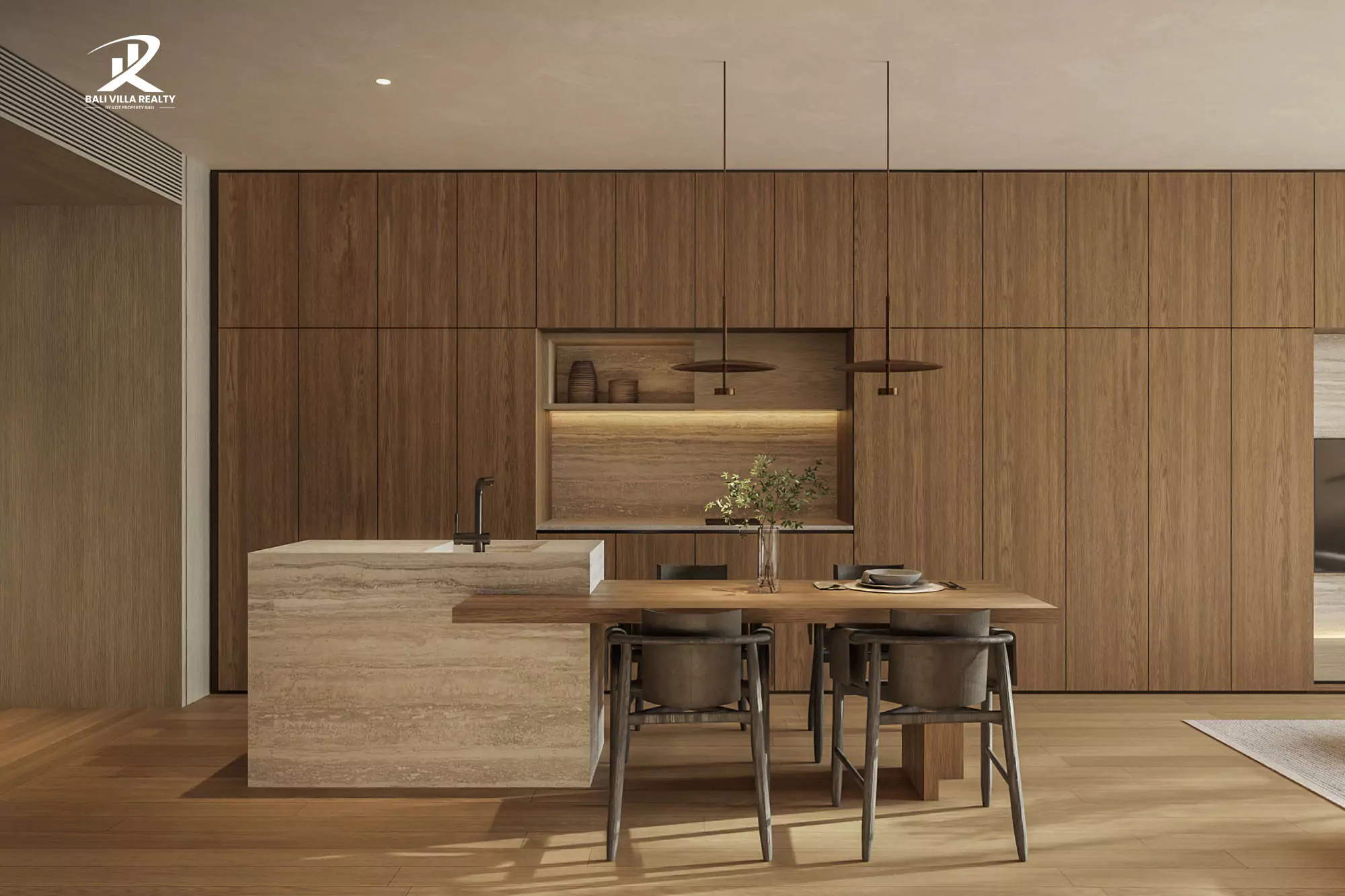 The gourmet kitchen showcases seamless cabinetry and a sleek island of travertine stone—perfect for entertaining or intimate dinners. Every corner balances comfort and sophistication, from the soft lighting to the airy flow between living, dining, and private spaces.