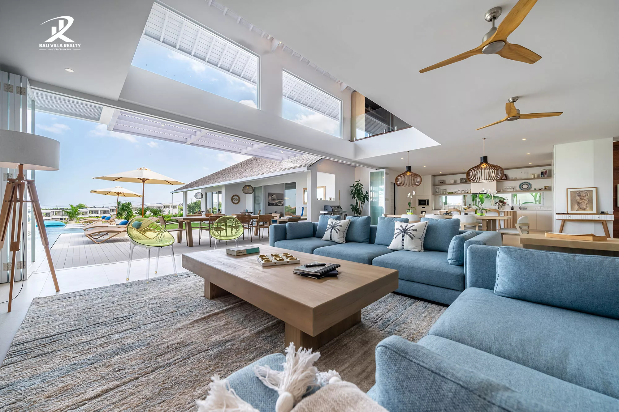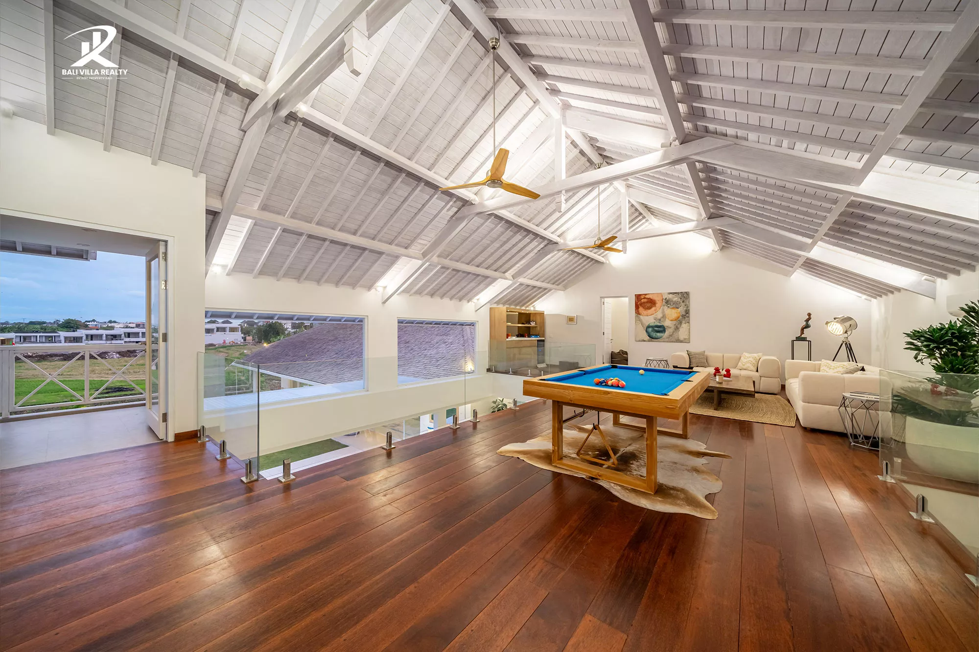 This villa is designed to impress. The ground floor features a massive, open-plan living and dining area with glass walls that disappear to merge the interior with the pool deck. The upper-level mezzanine offers a sophisticated entertainment space with a pool table, overlooking the double-height lounge.