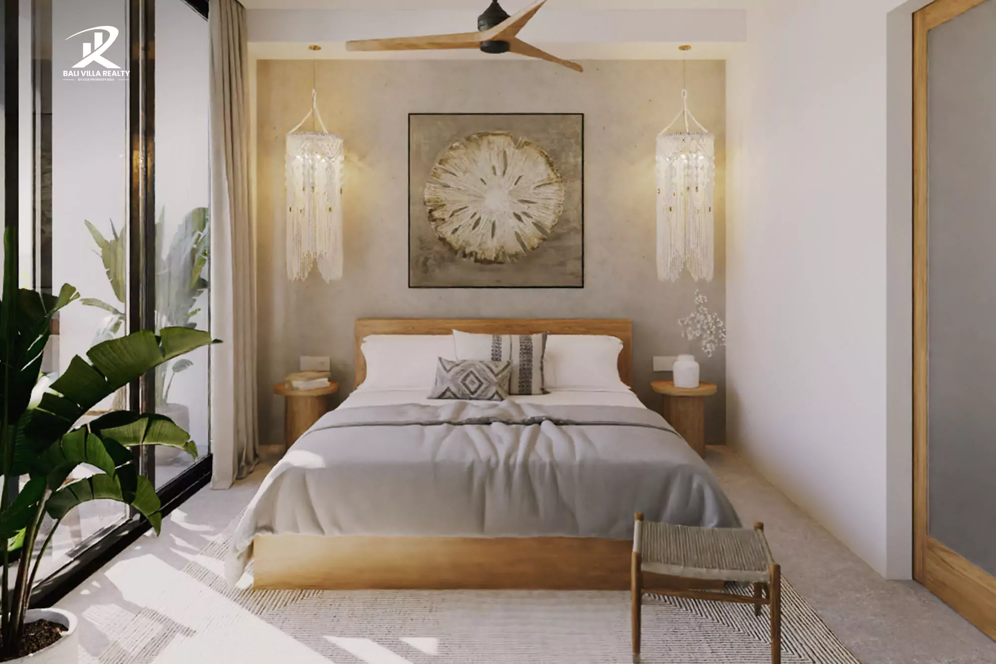 • A stylish bedroom with balcony access, offering lush green views.