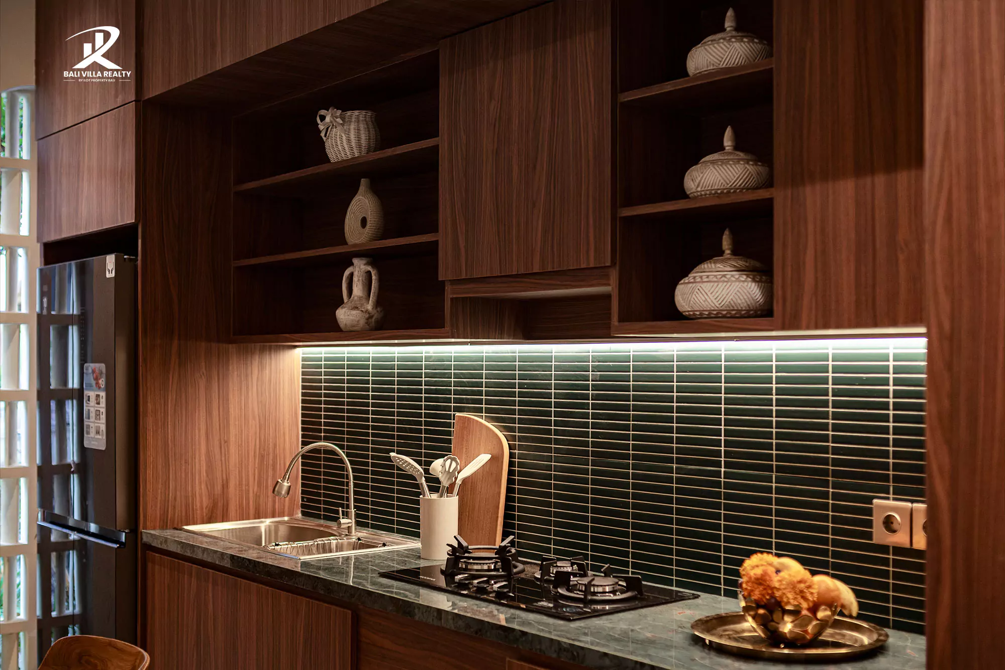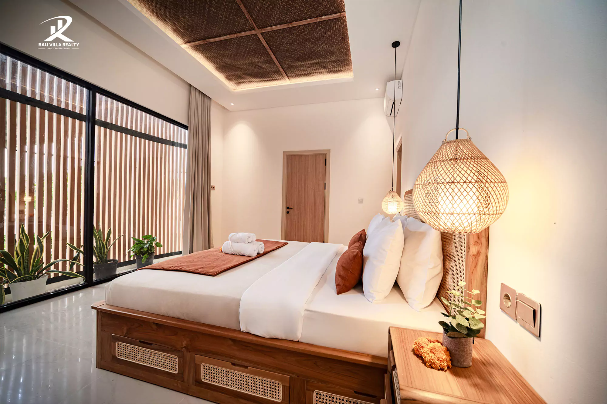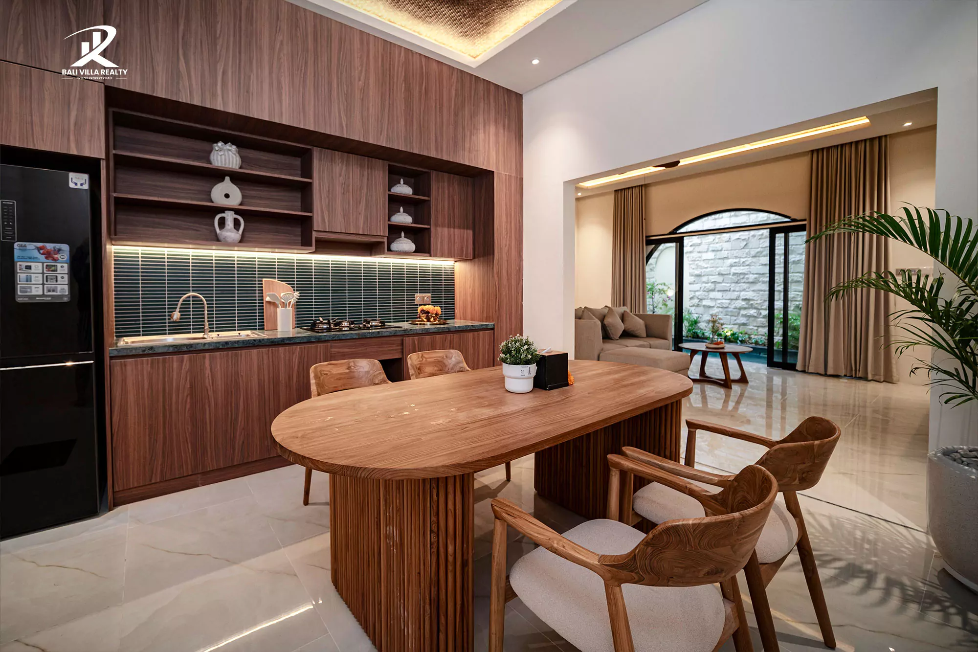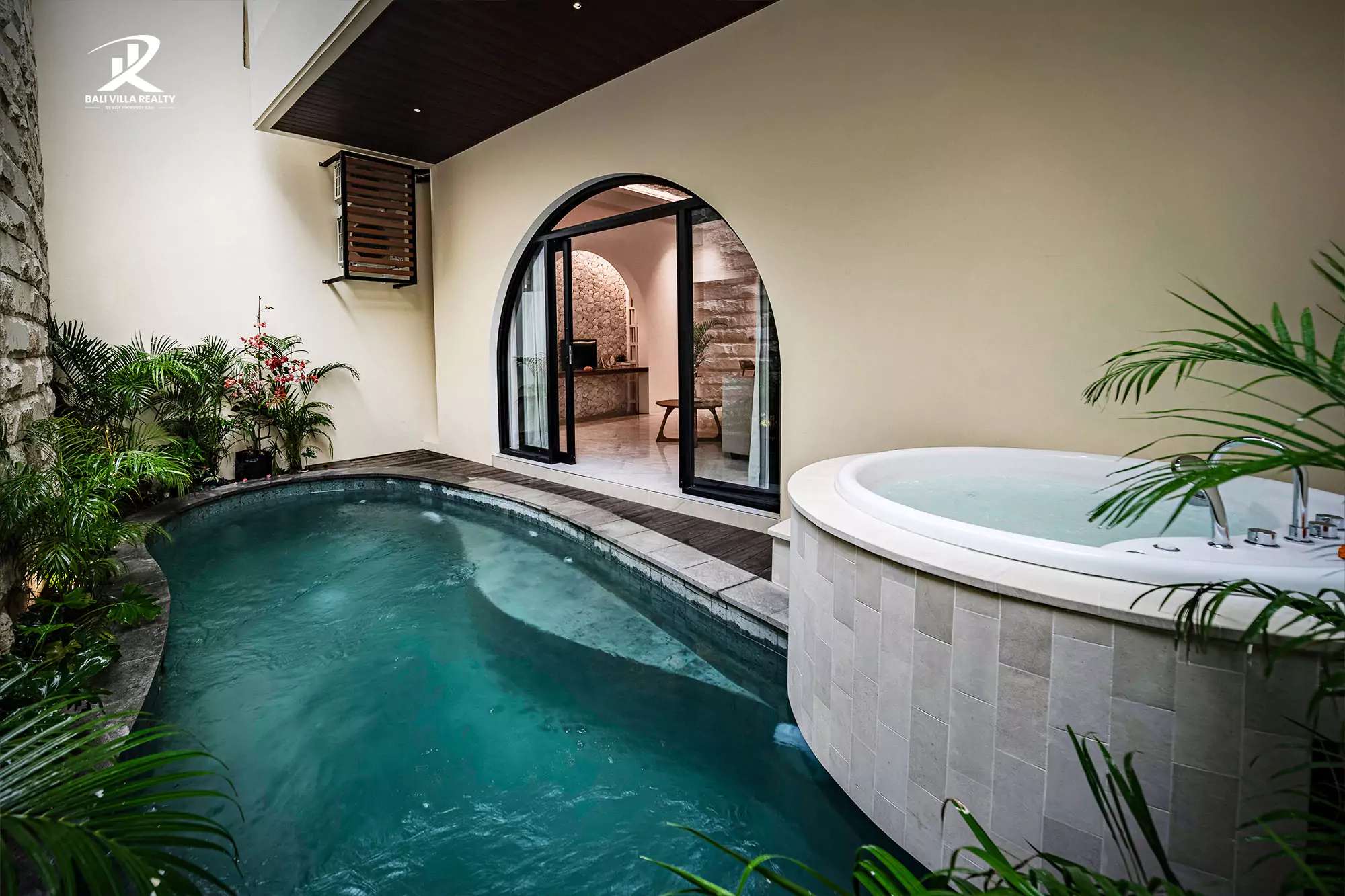 Step into pure elegance at this stunning villa, where modern design meets tropical tranquility. The contemporary façade with natural wooden accents and lush greenery welcomes you into a serene retreat. Inside, expansive glass doors open up to a private sanctuary featuring a refreshing pool and a luxurious jacuzzi corner surrounded by tropical plants — perfect for unwinding in total privacy.