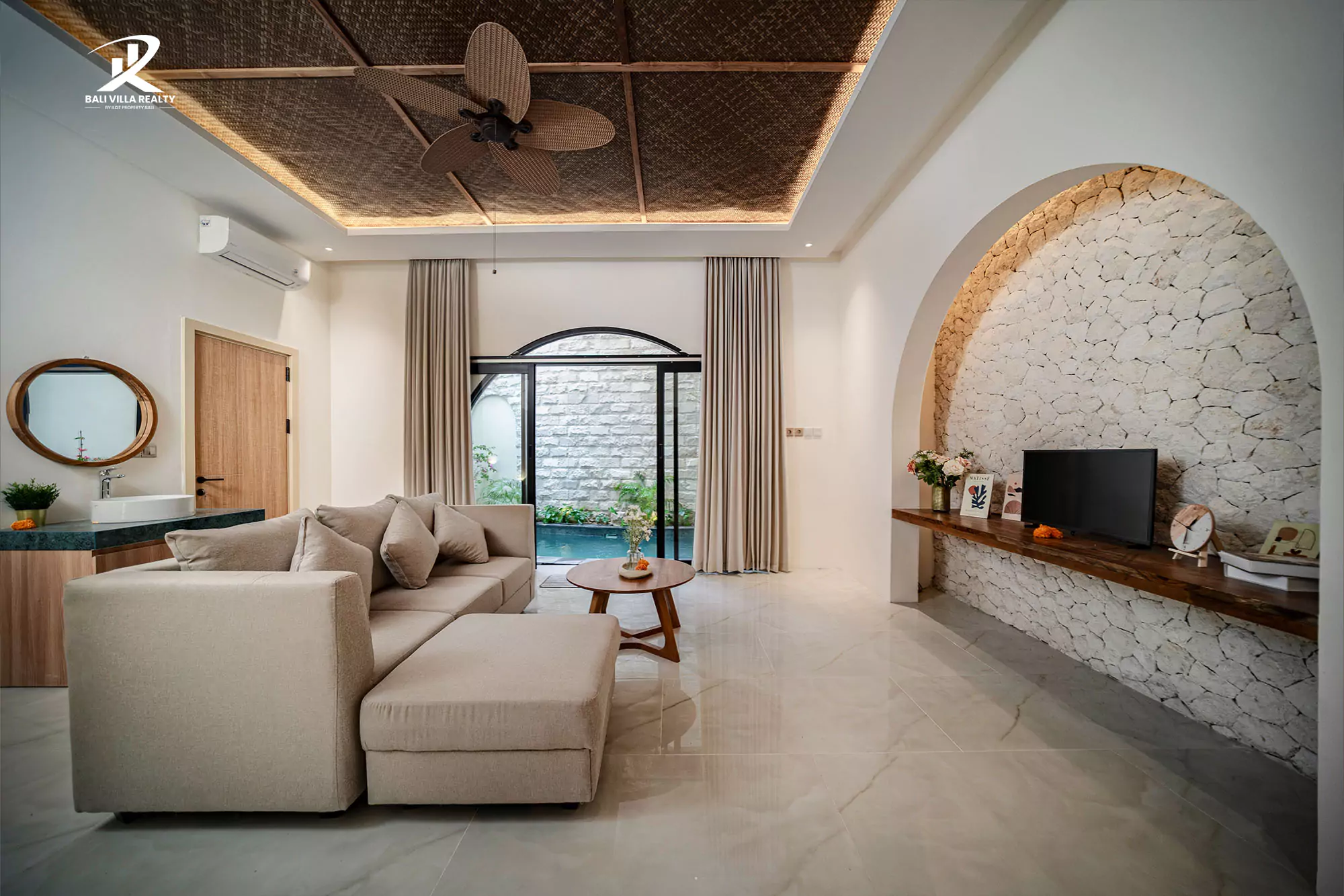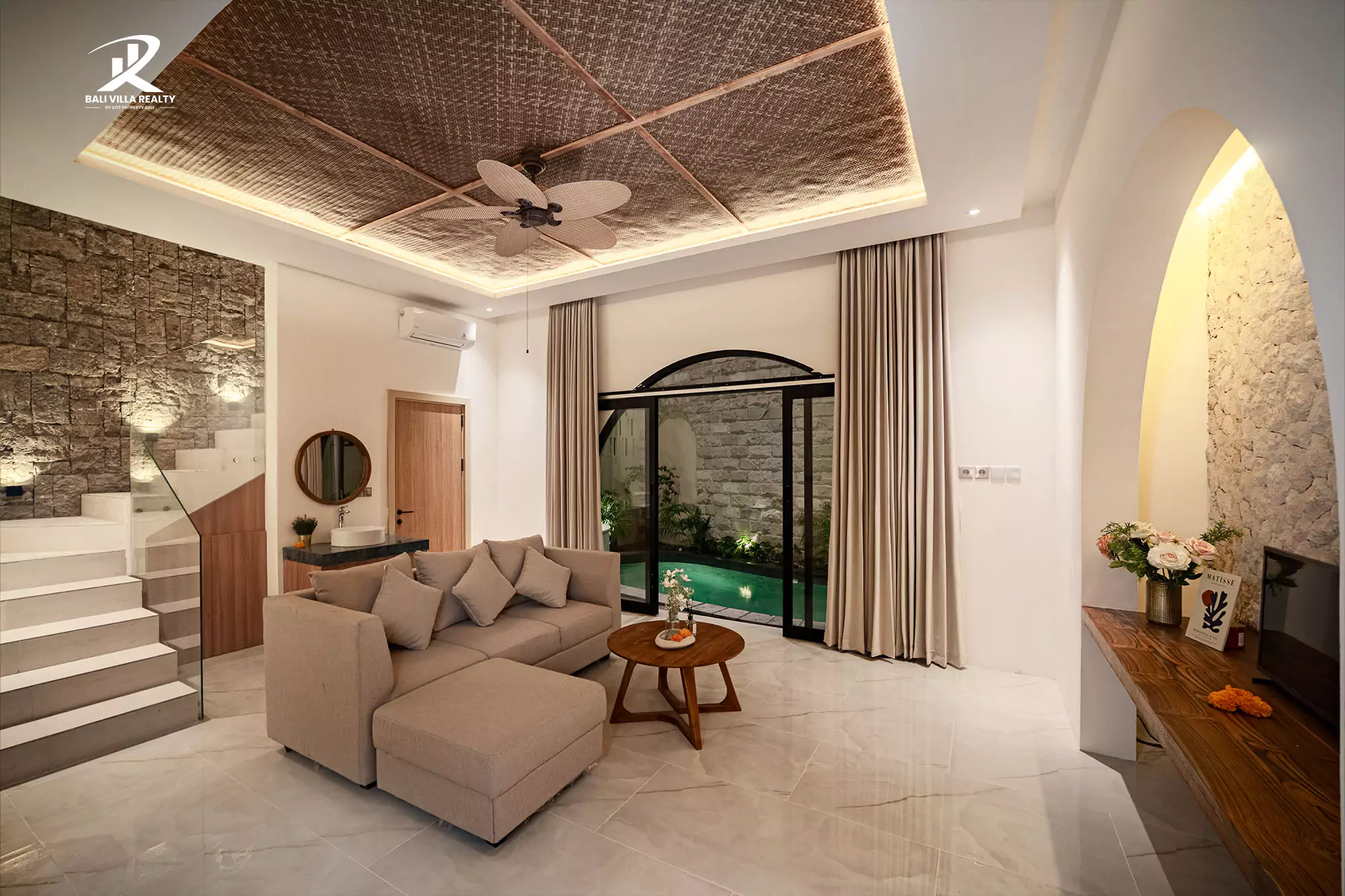 The villa’s sophisticated interiors combine warm textures, stone details, and natural light, creating a cozy yet upscale ambiance. Whether you’re lounging by the pool, enjoying a soak in the jacuzzi, or relaxing indoors, every corner is designed for comfort and style.