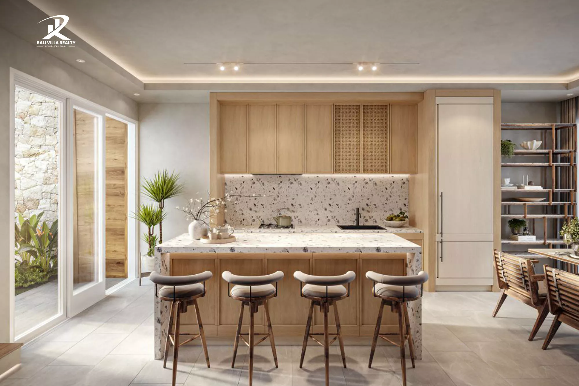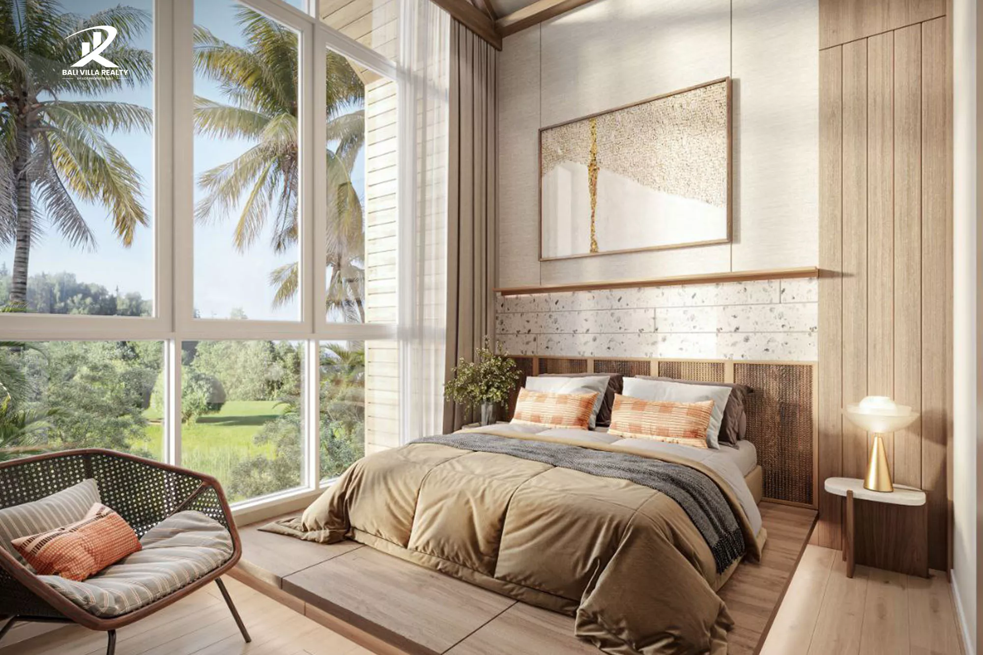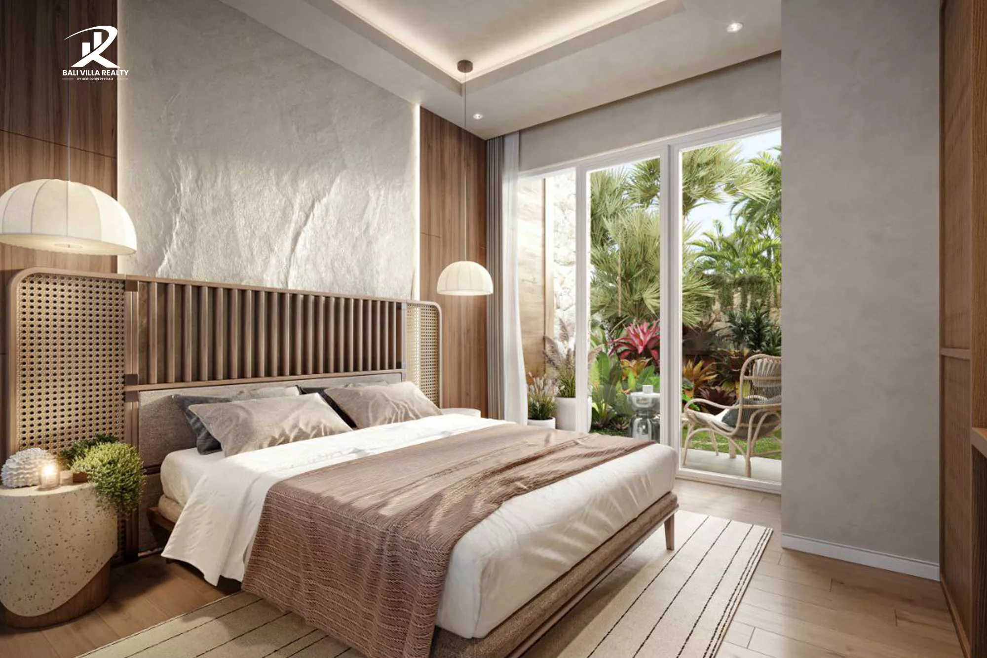- Warm wood, rattan, and stone textures throughout