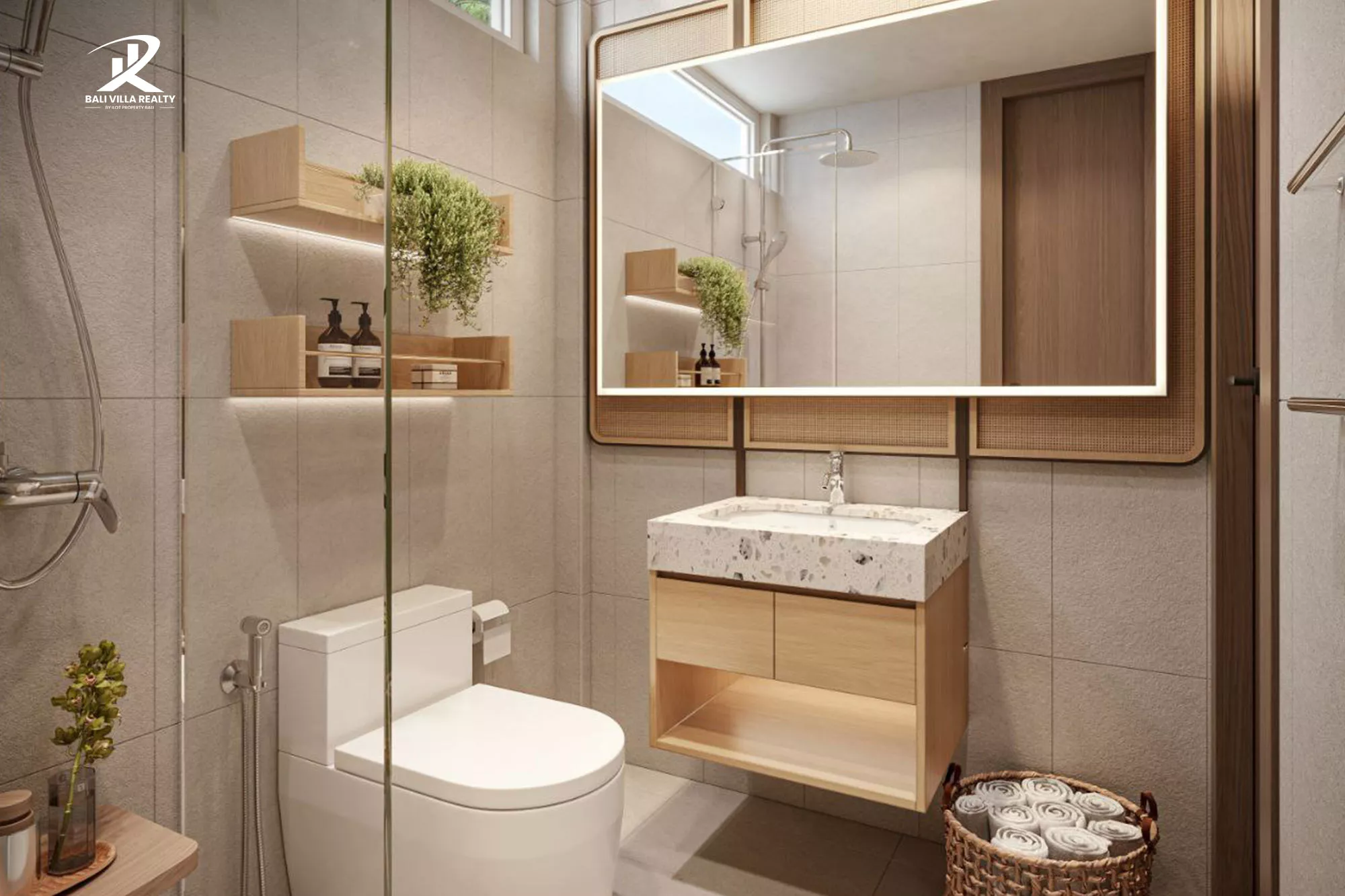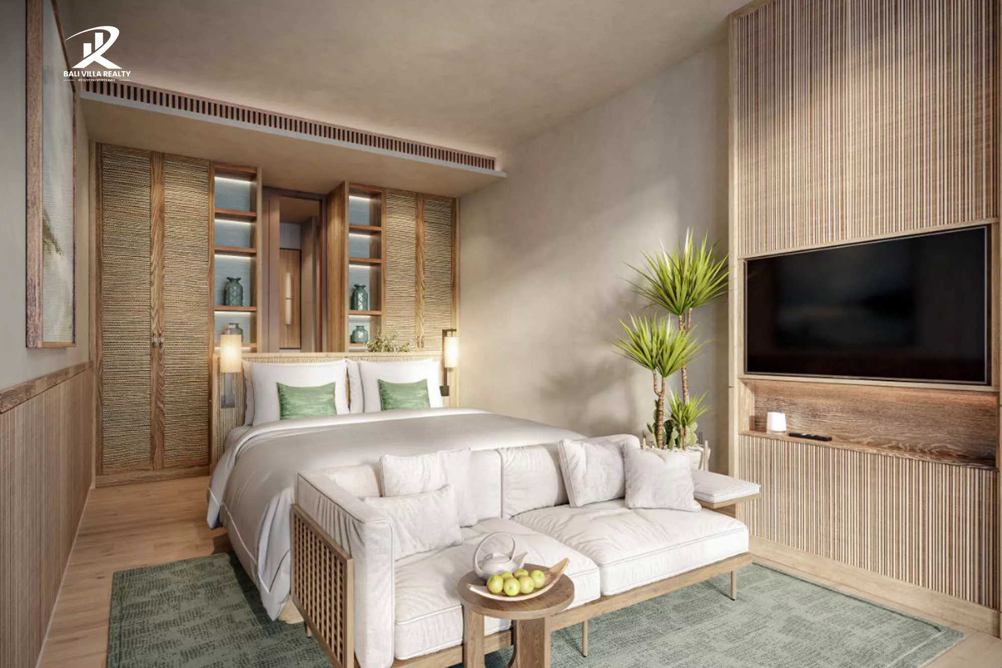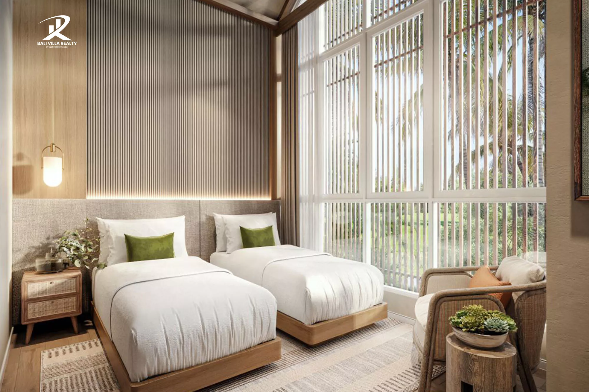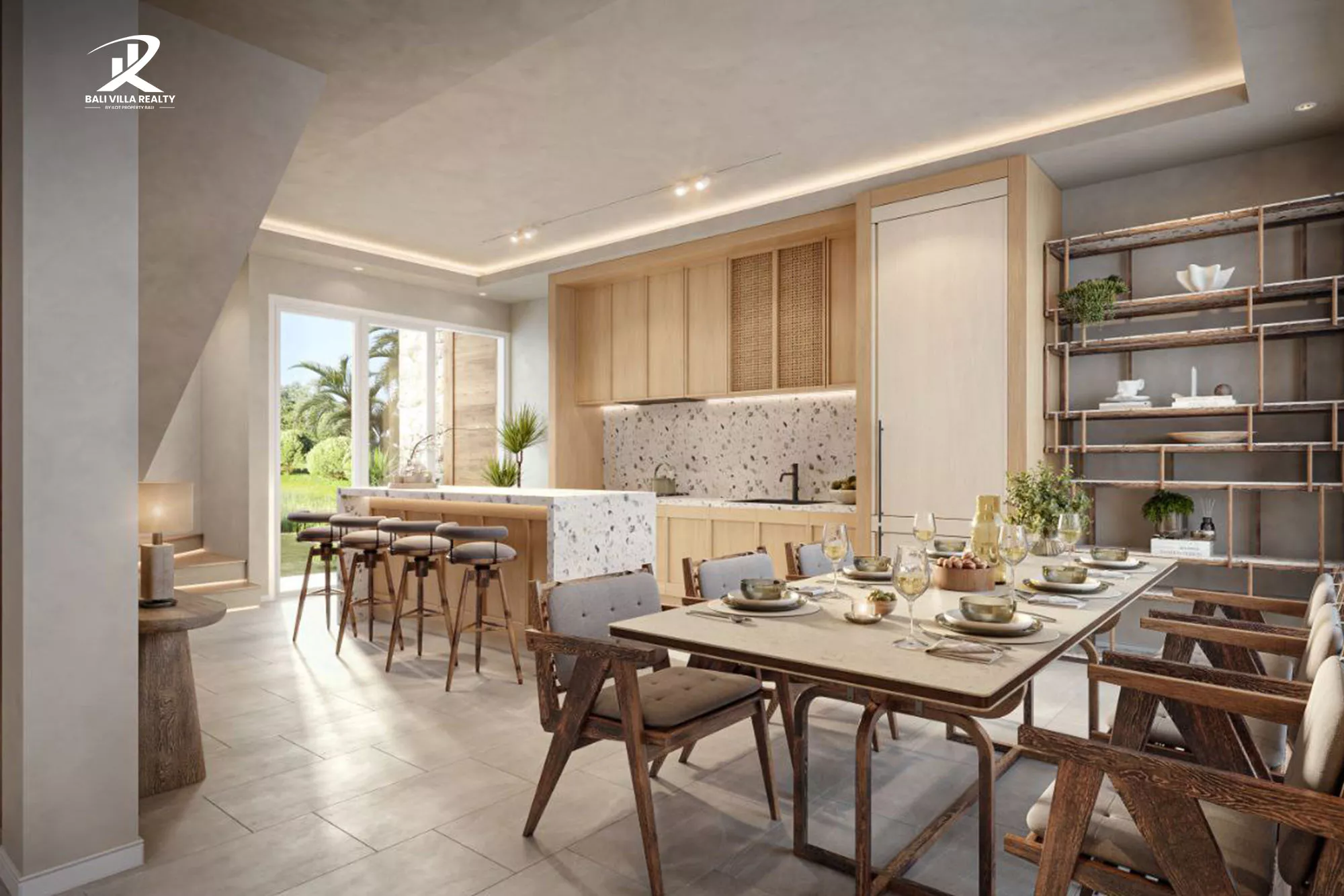 - Warm wood, rattan, and stone textures throughout