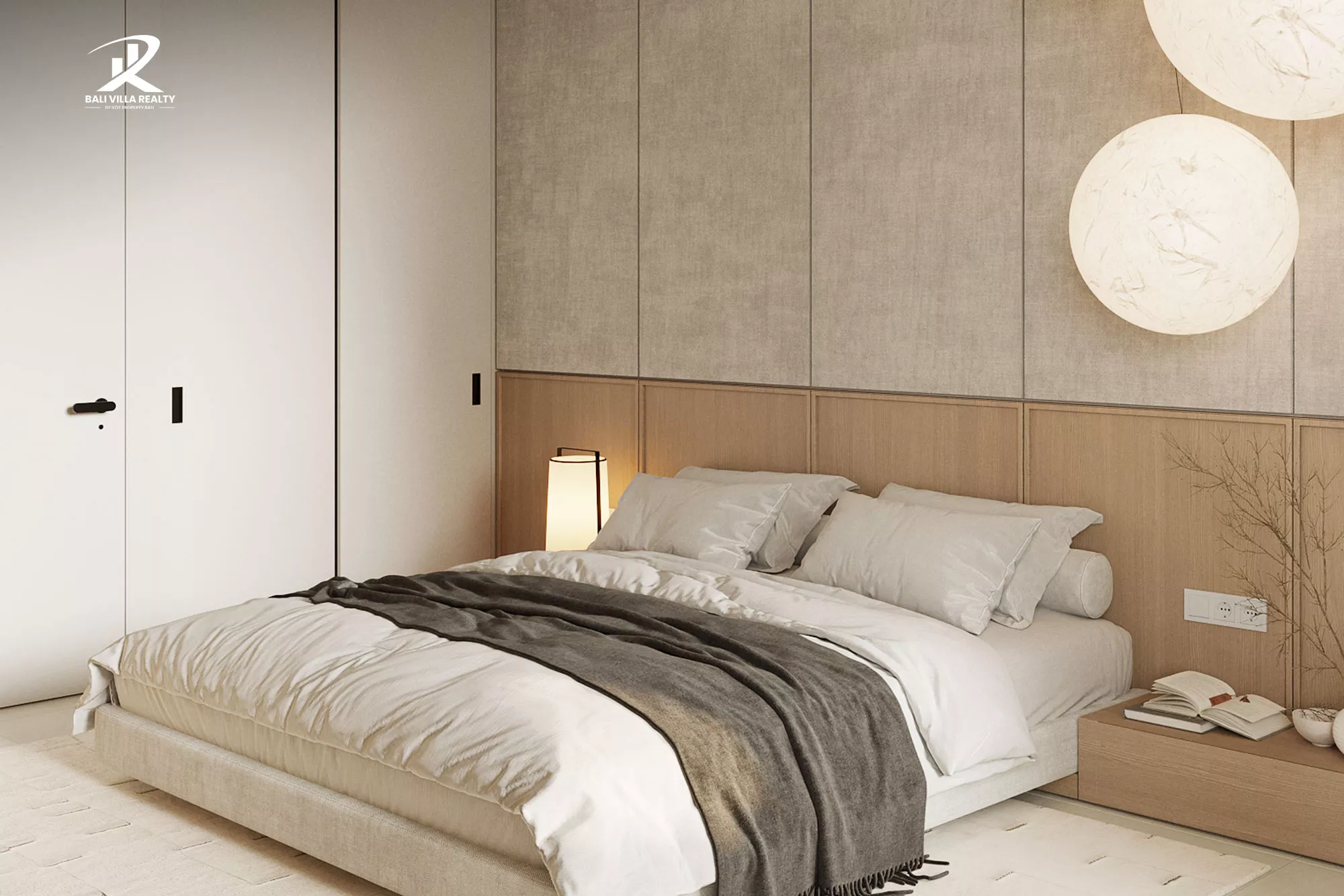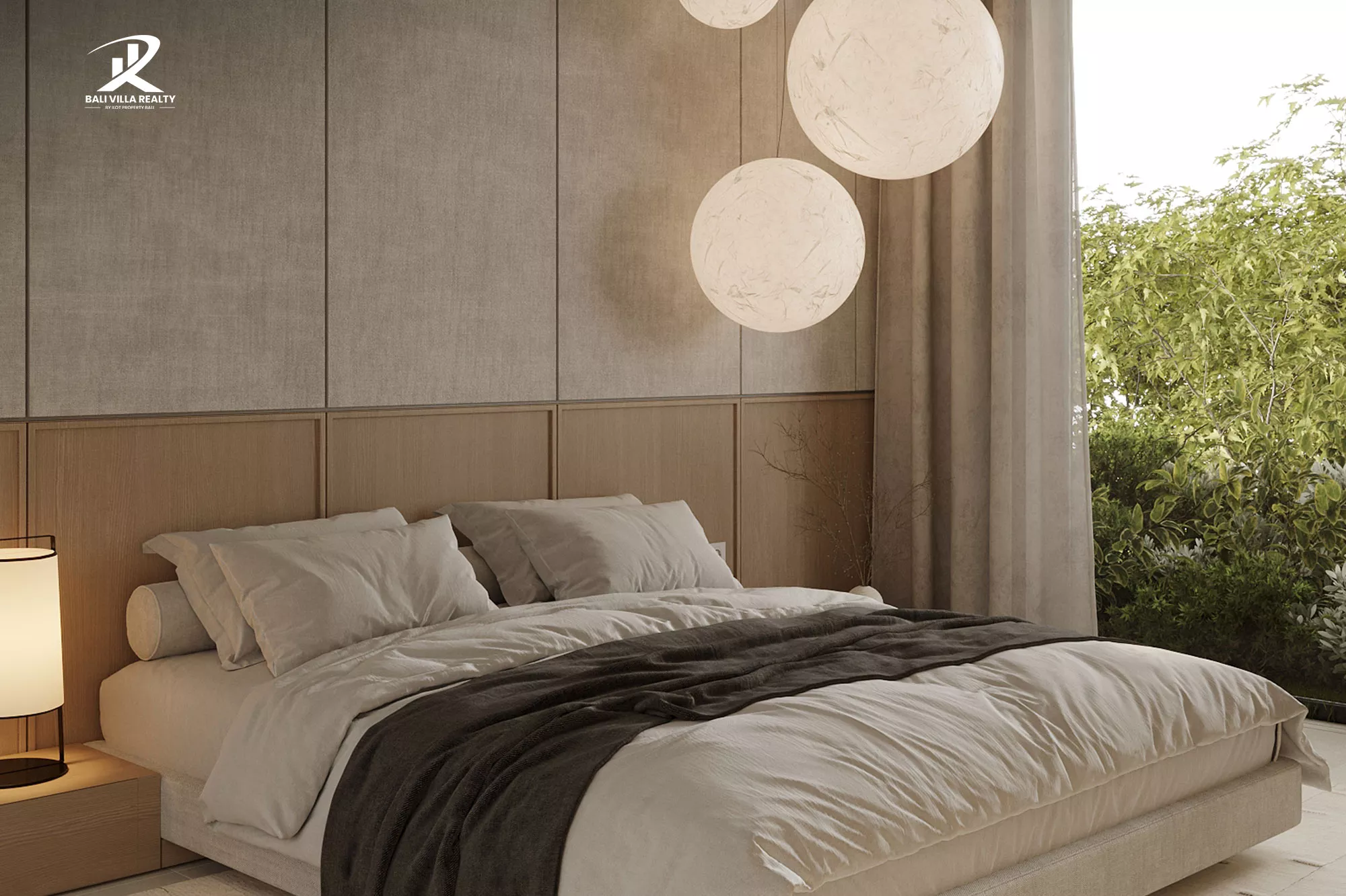 • Elegant bedrooms with floating beds, layered textures, and sculptural pendant lighting.