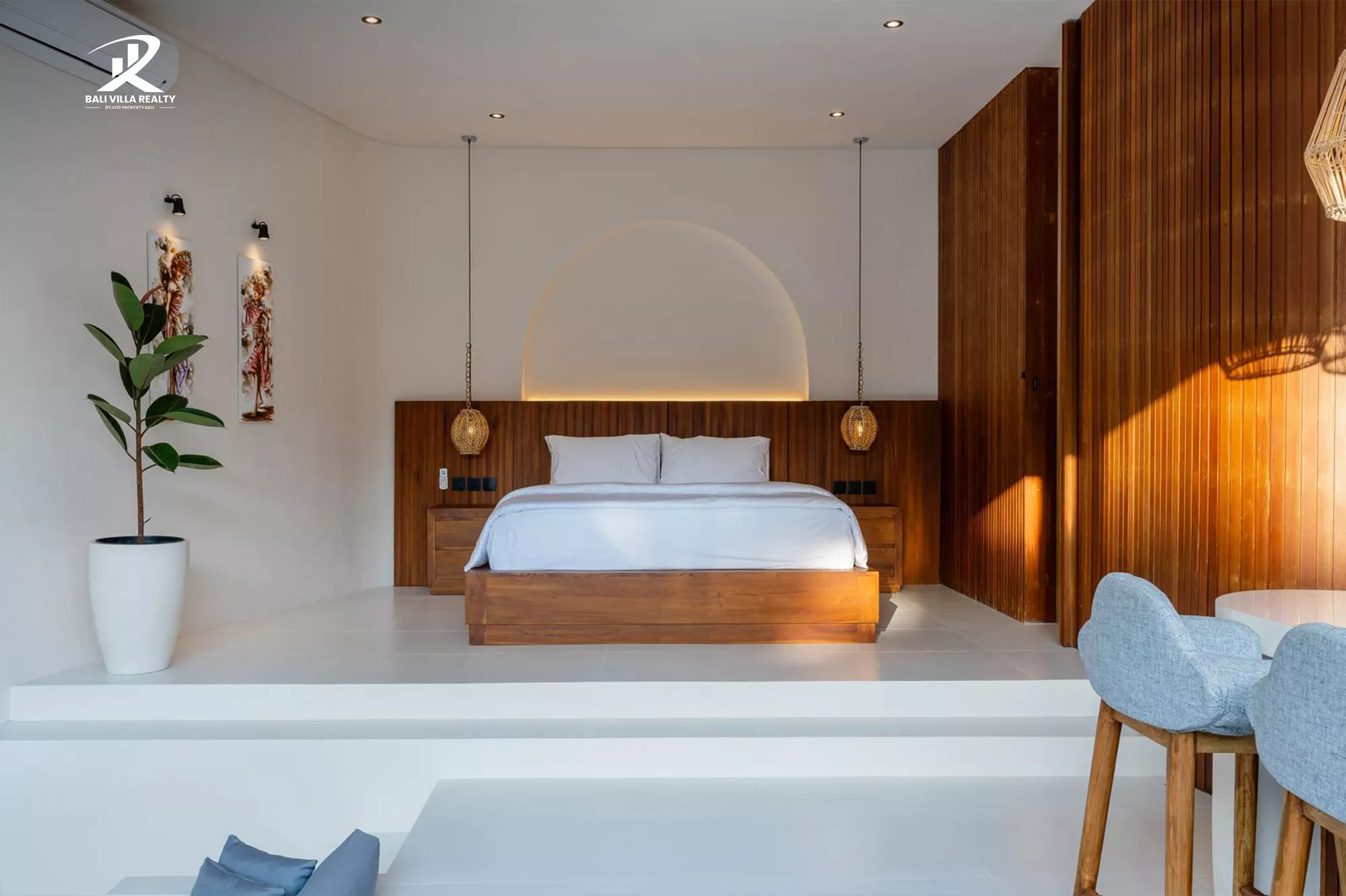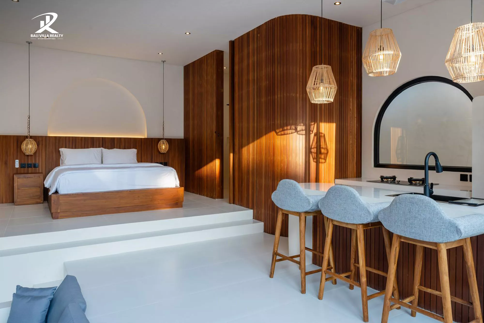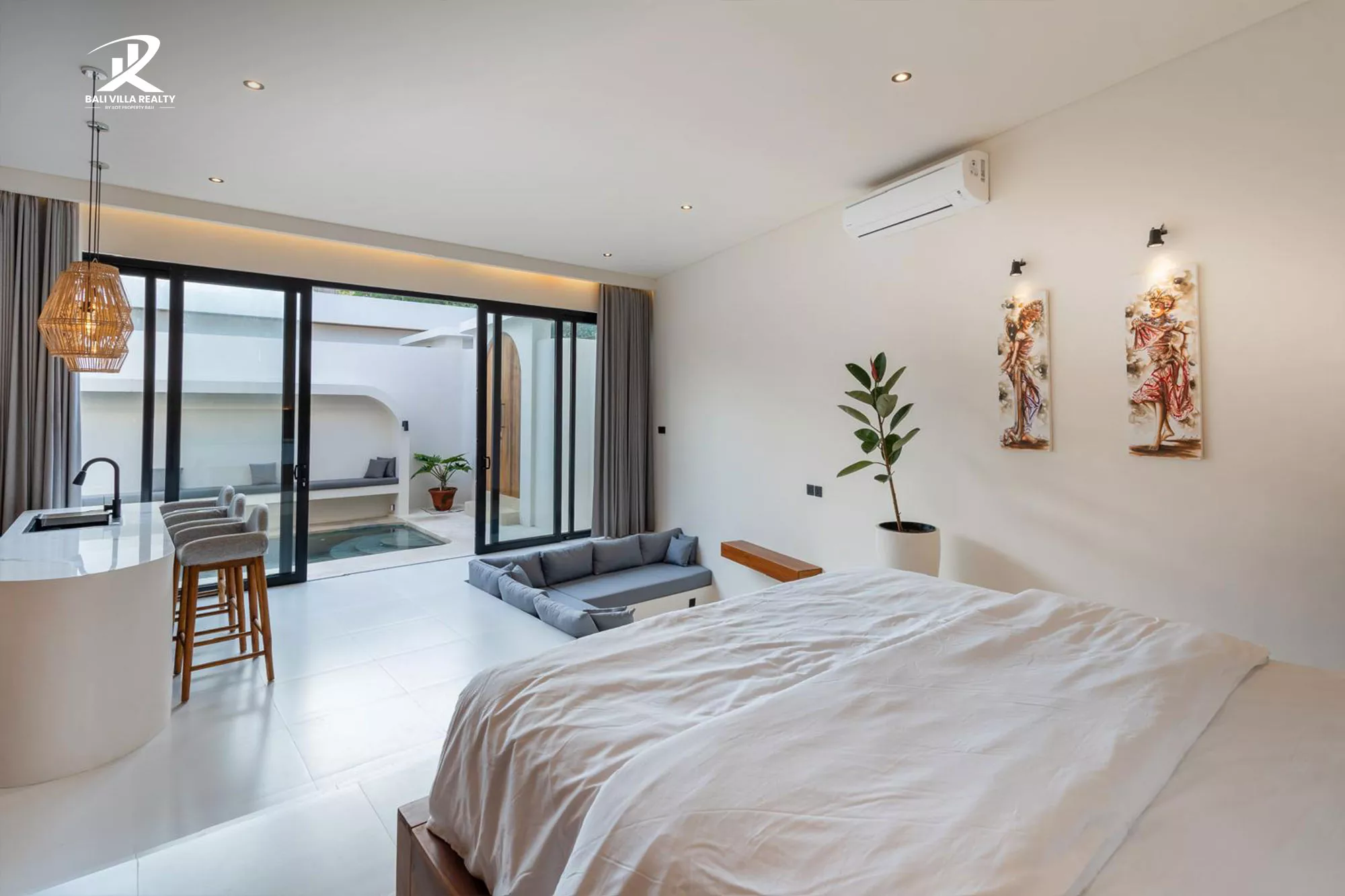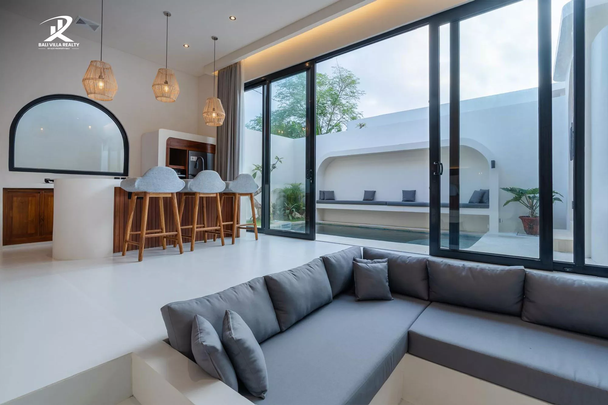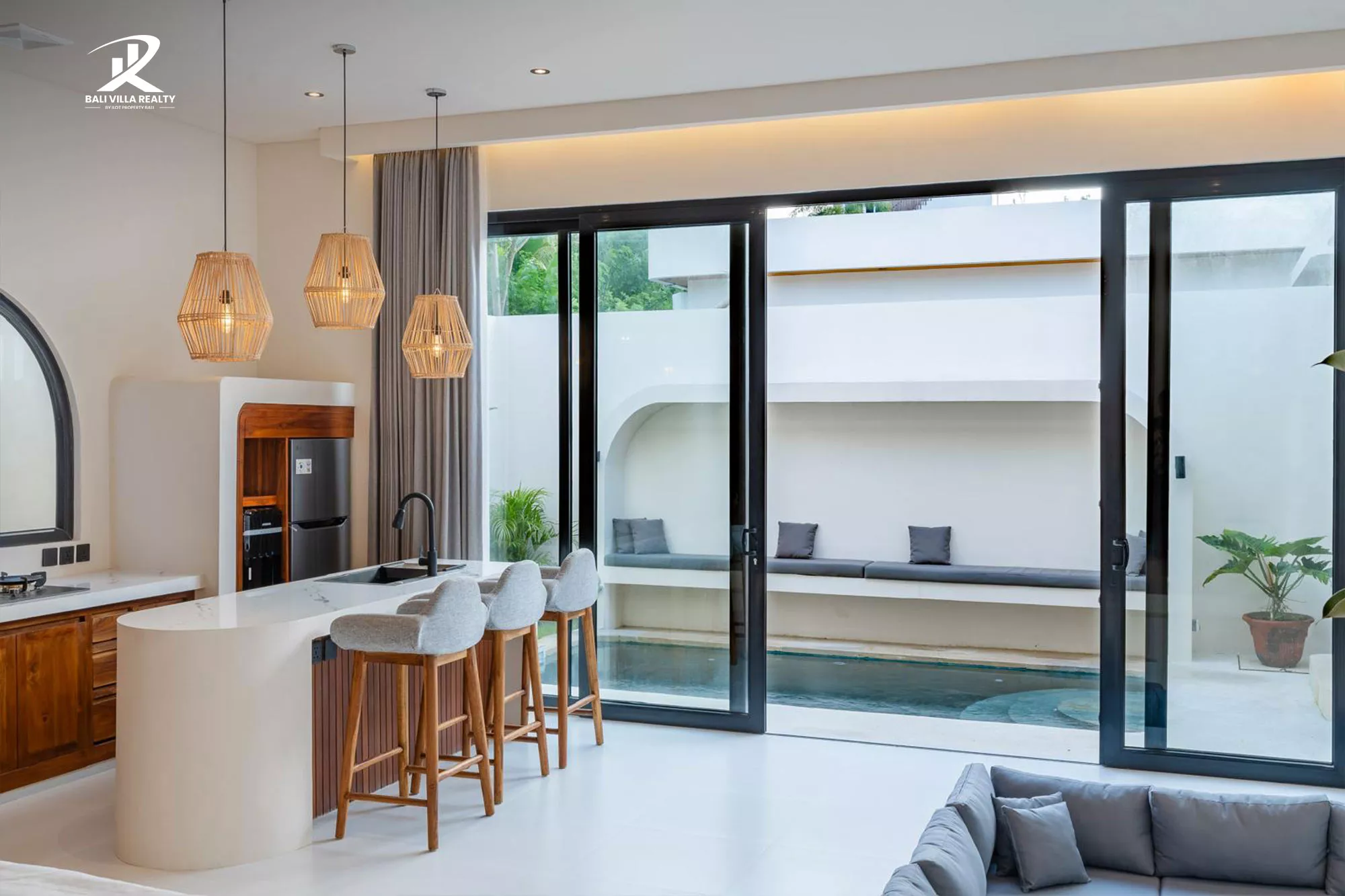 The villa features a bright open-plan layout with a sunken lounge, custom kitchen island, and seamless indoor-outdoor flow leading to a private swimming pool and tranquil outdoor seating area. The elevated bedroom area offers comfort and privacy, complete with an elegant ensuite bathroom and refined finishes throughout.