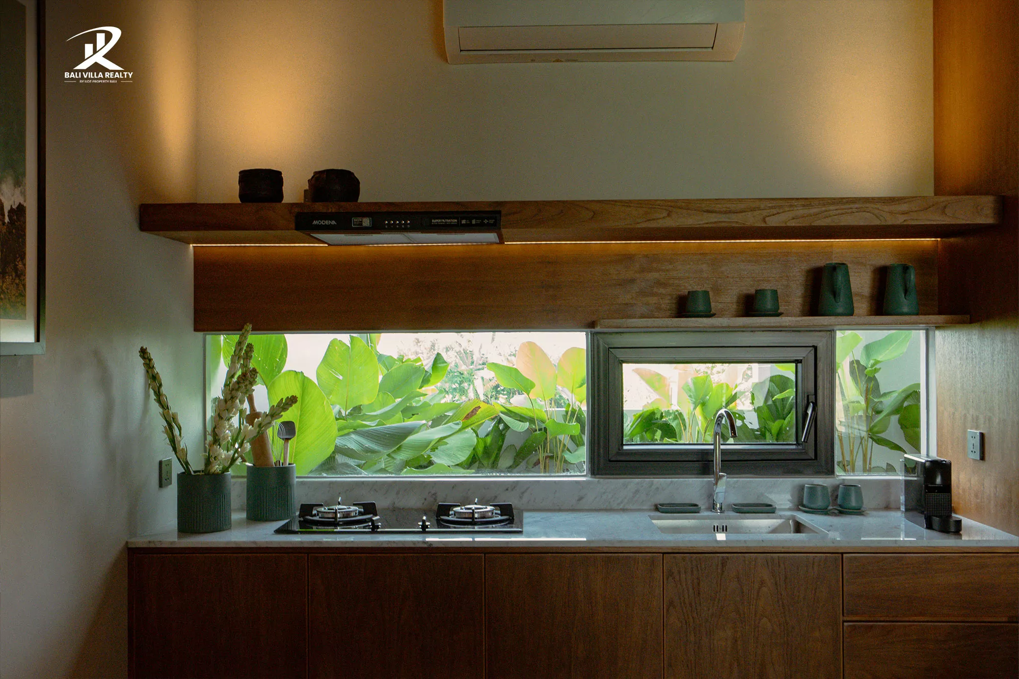 - Gourmet Kitchen & Dining: Enjoy a minimalist kitchen featuring marble countertops and a unique window backsplash that brings the garden indoors, paired with a dedicated dining area.