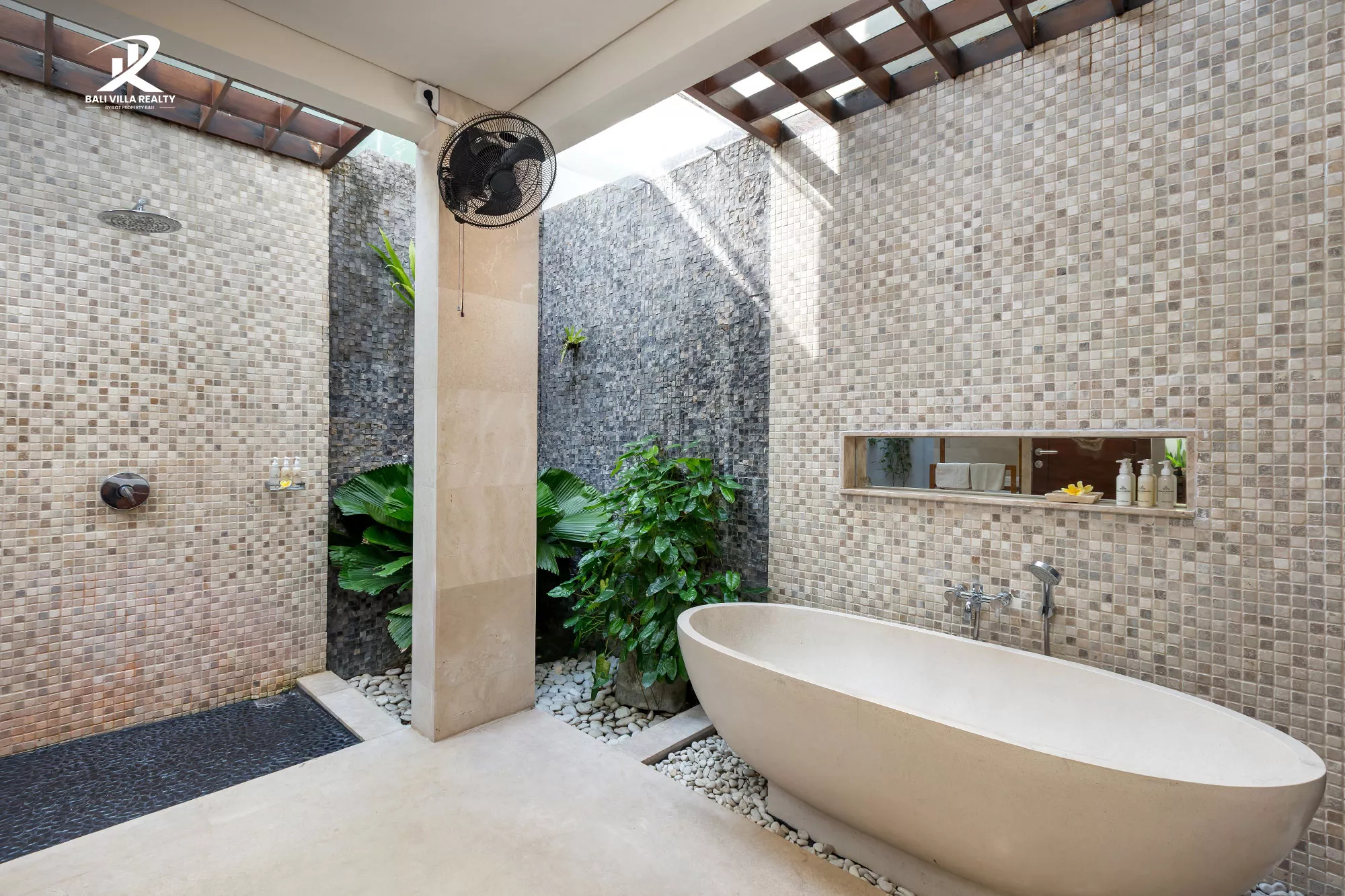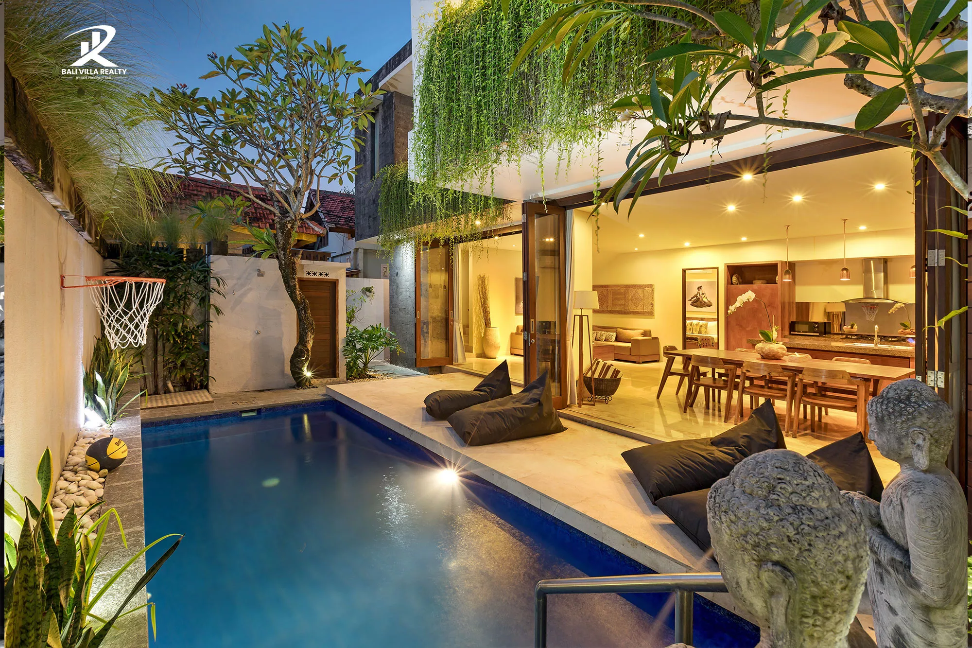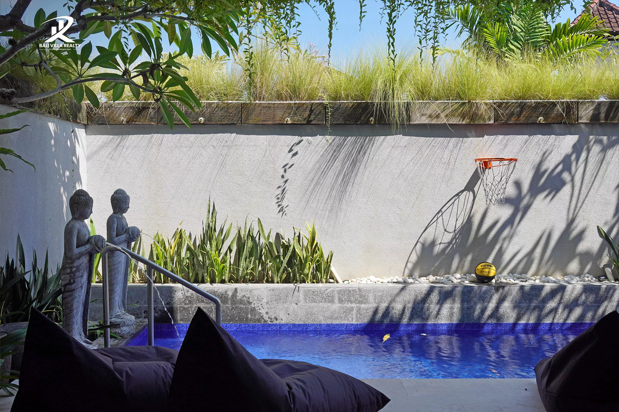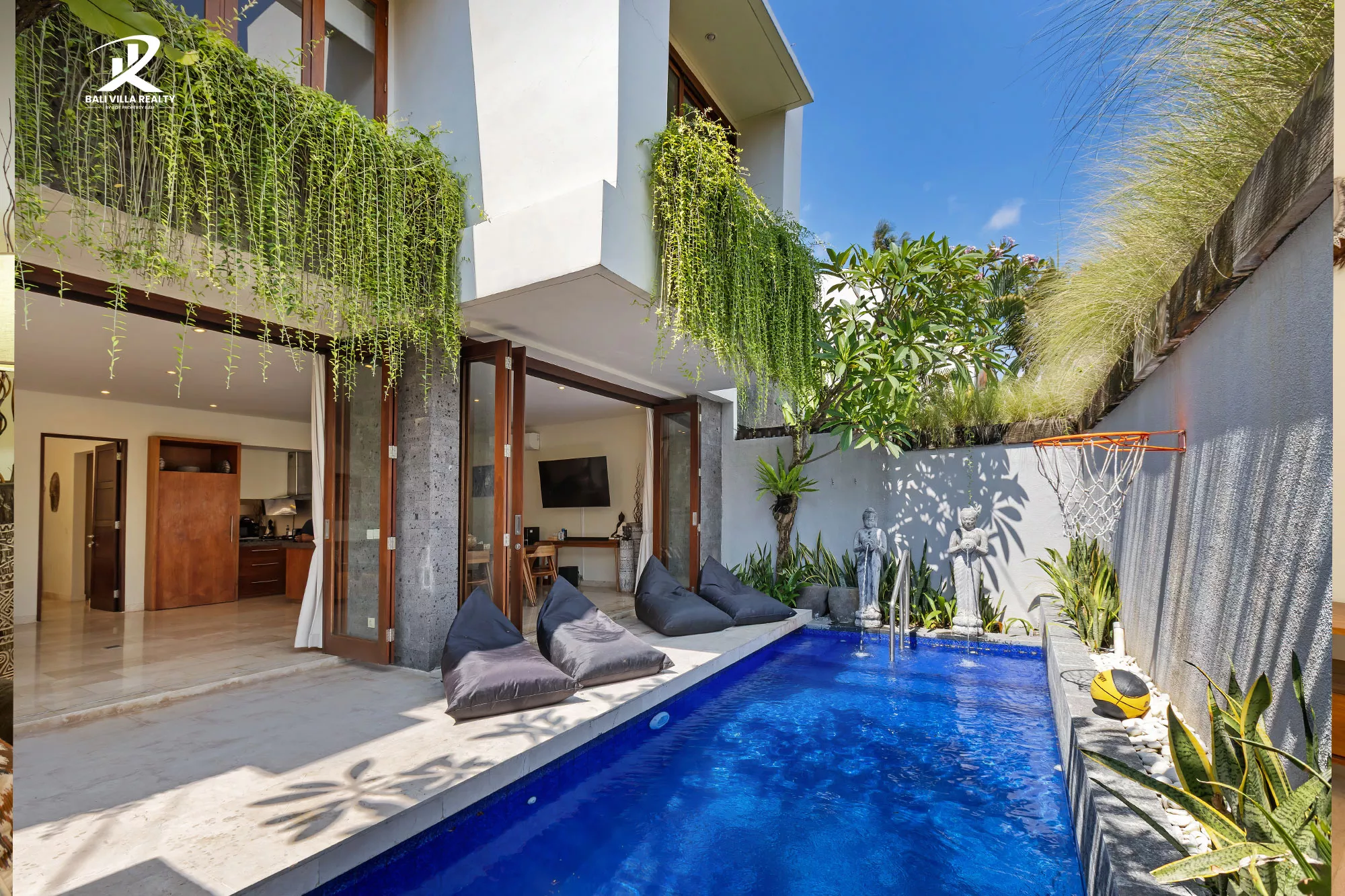 - Tropical Features: Stunning private pool with stone Buddha water features, lush hanging gardens, and an outdoor shower with a volcanic rock backdrop.