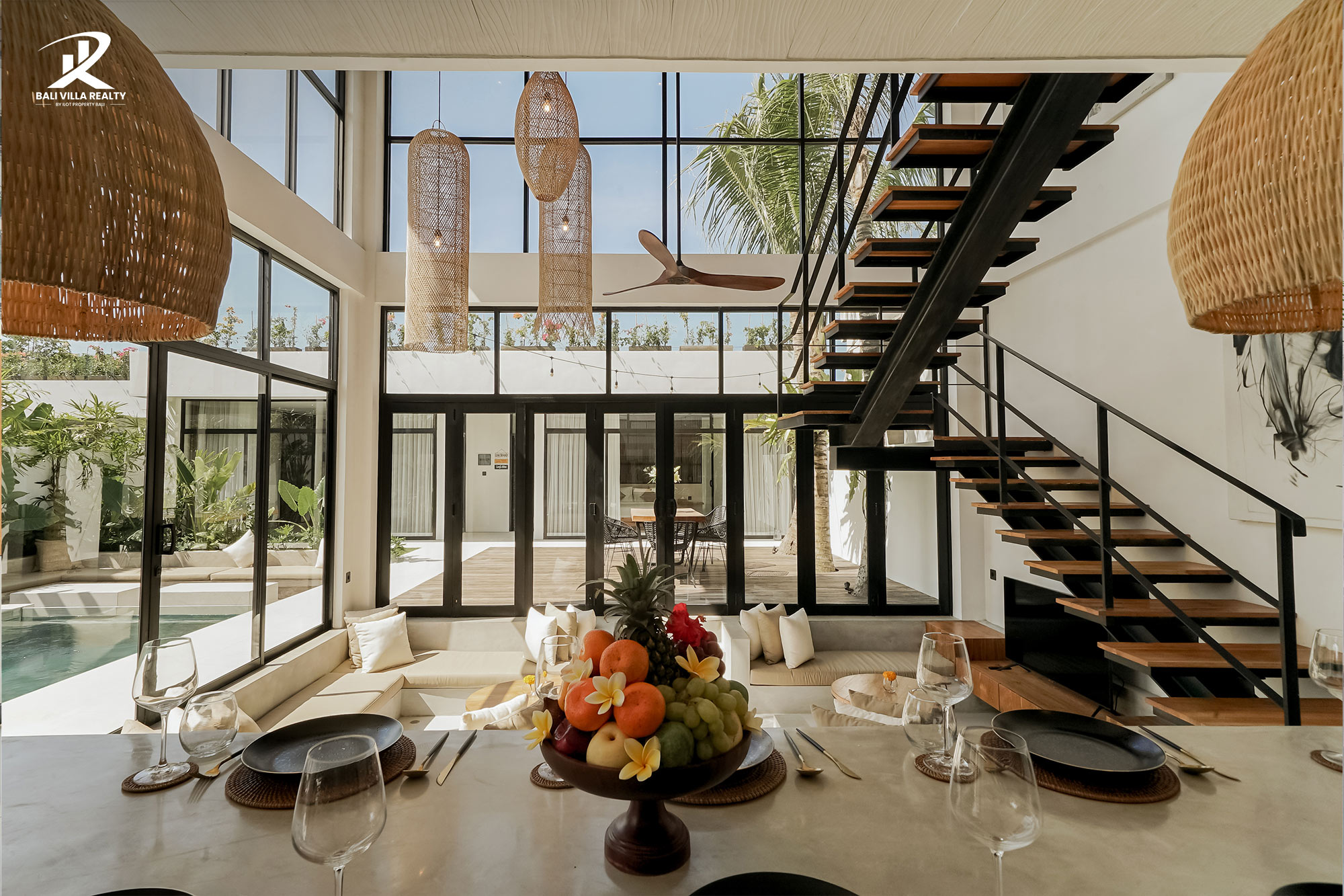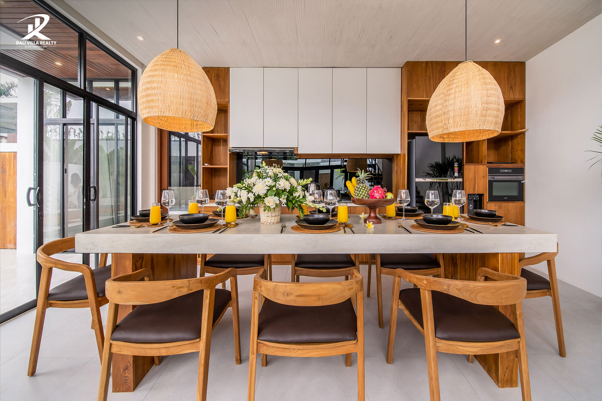 The open-plan living and dining areas are perfect for both relaxing and entertaining. Tastefully decorated with modern furnishings, these spaces flow seamlessly into the outdoor areas, creating a harmonious indoor-outdoor living experience.