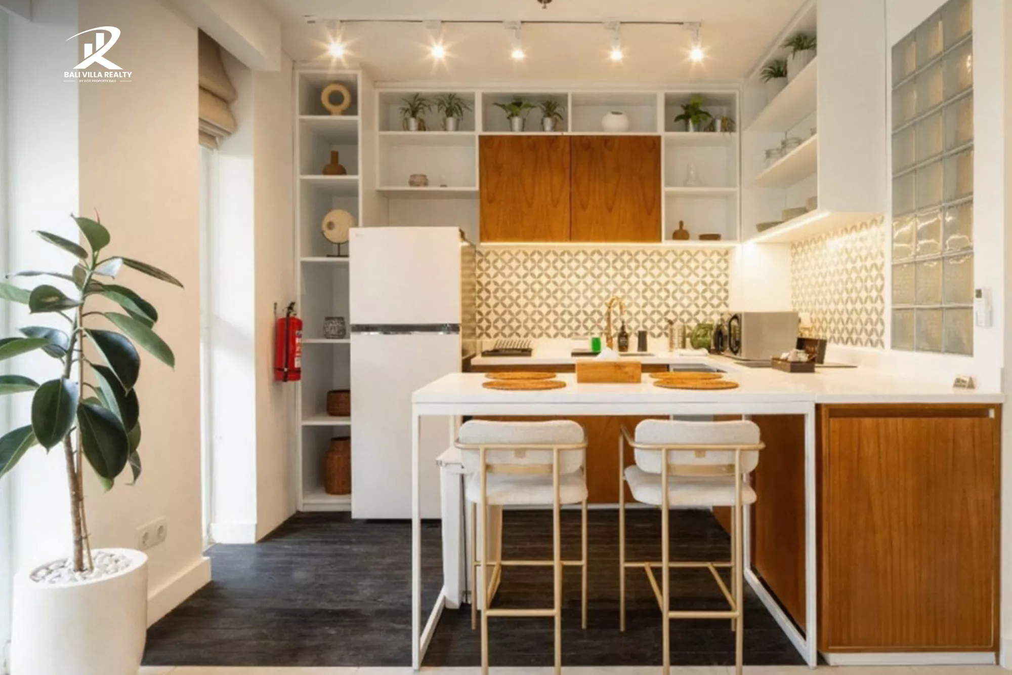 - Designer Kitchen: The fully equipped kitchen is a masterpiece of form and function, featuring white open shelving, rich wooden cabinets, and a captivating geometric tile backsplash. A high-top breakfast bar offers a perfect spot for morning coffee or co-working.