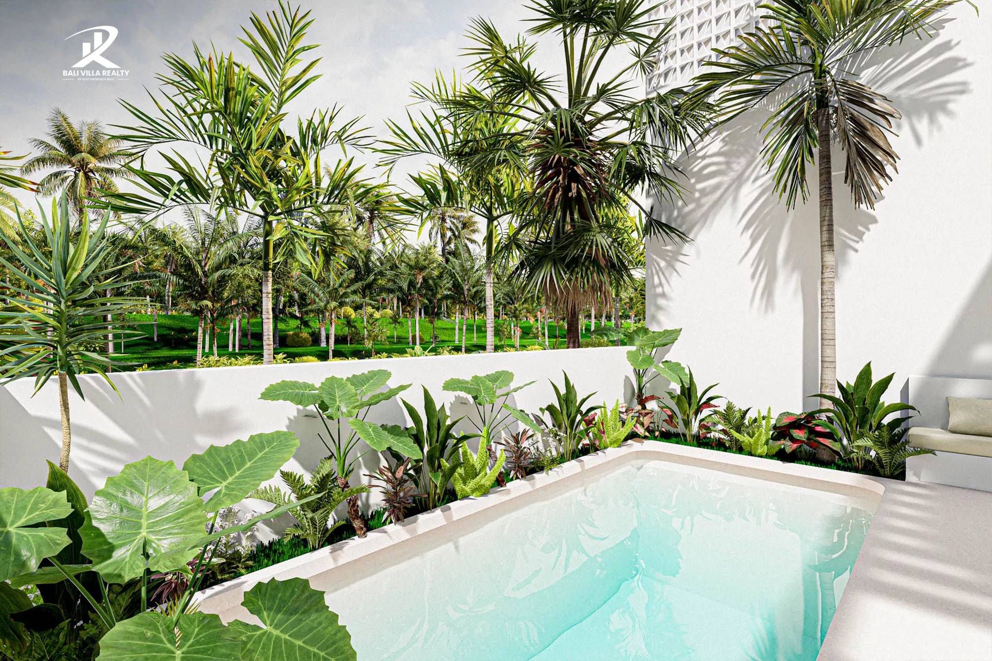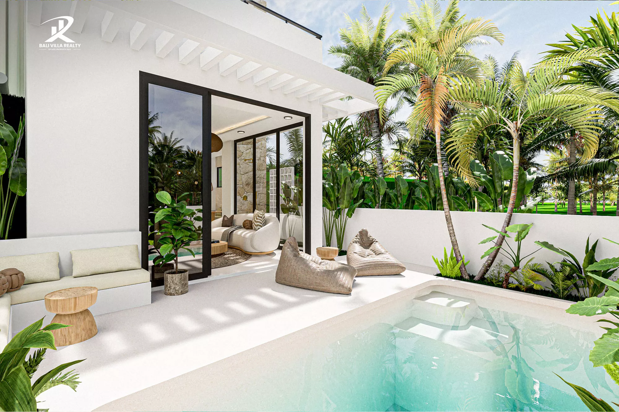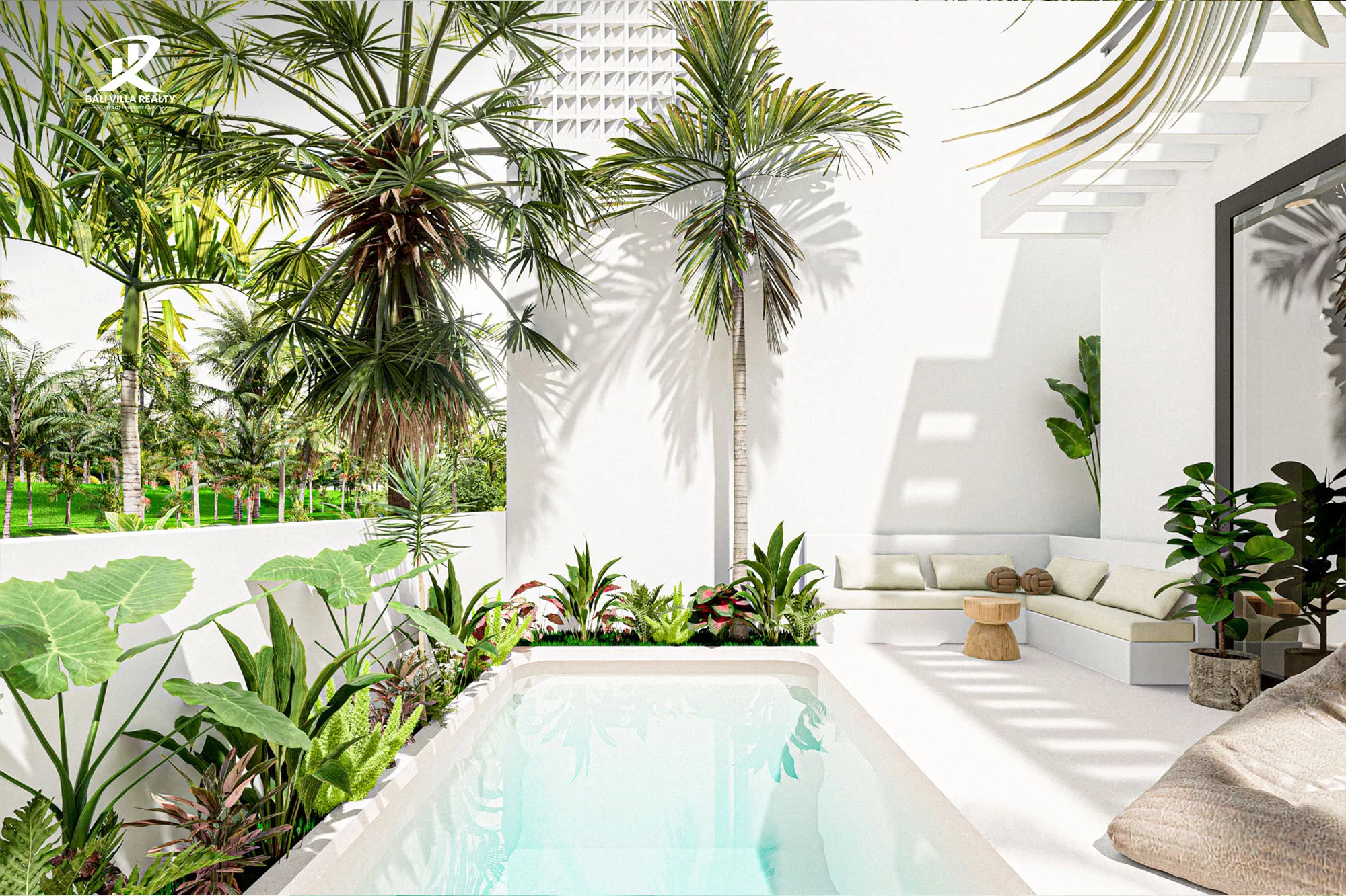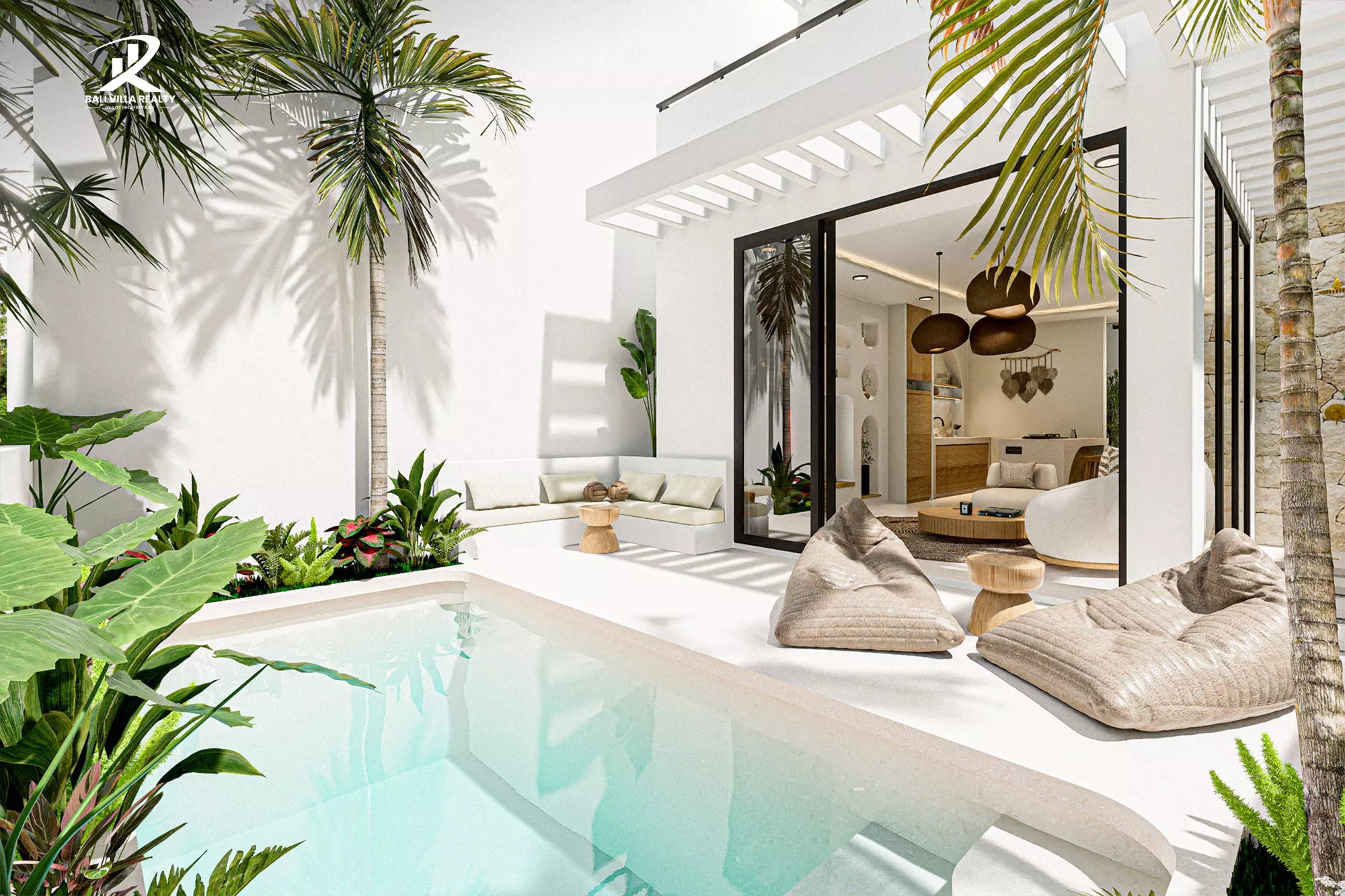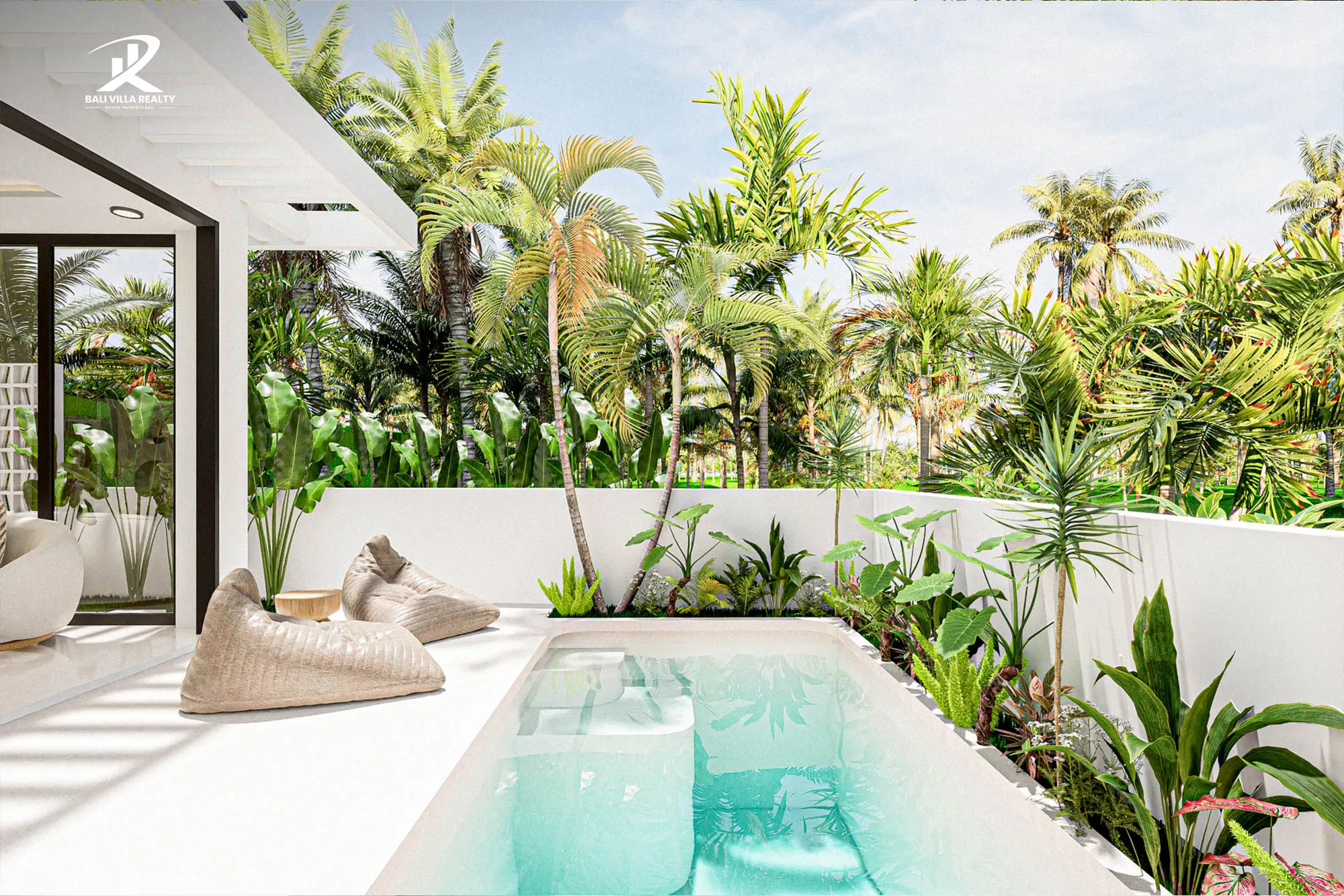 - Private Oasis: Secluded outdoor deck with a private pool, tropical landscaping, and an integrated poolside L-shaped sofa.