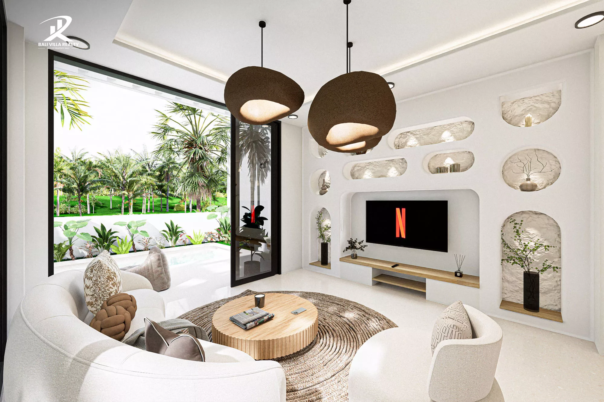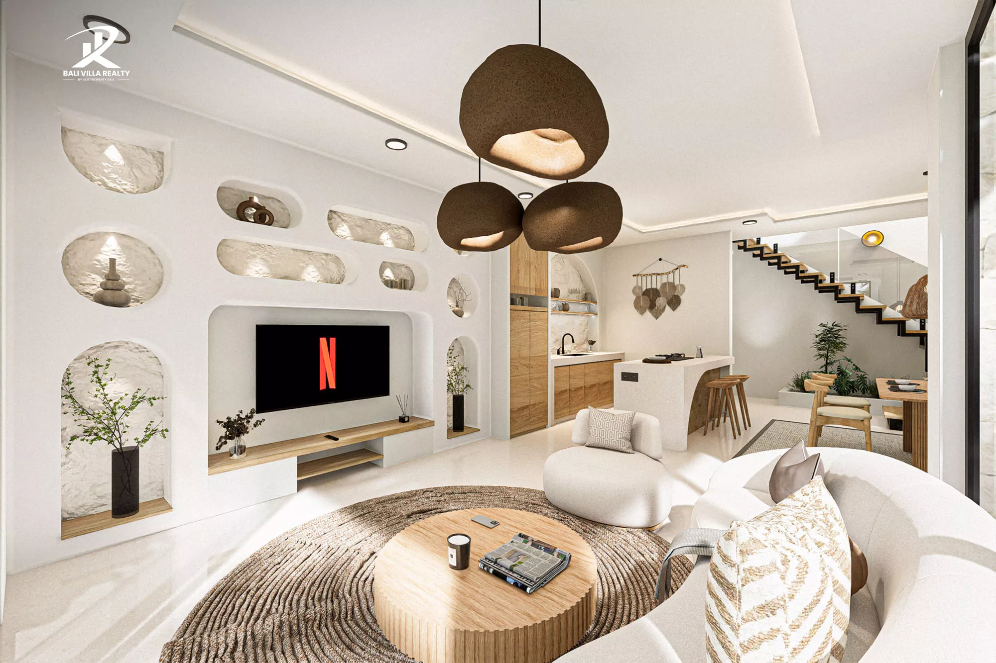 - Architectural Excellence: Stunning Mediterranean-inspired interiors with built-in arched shelving and textured stone feature walls.