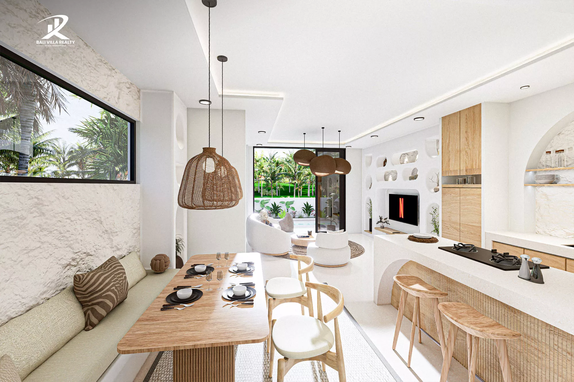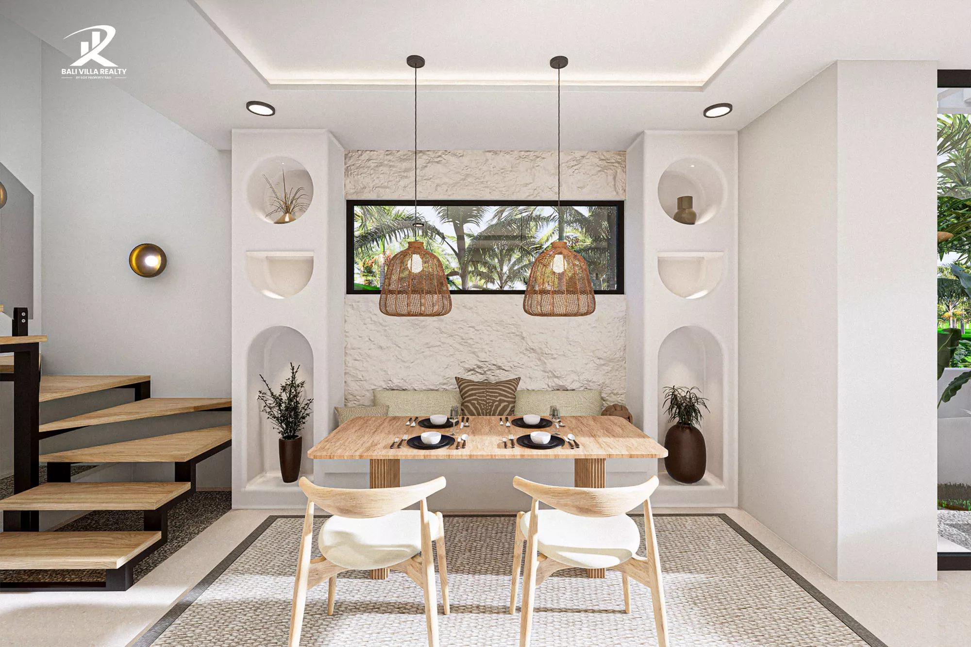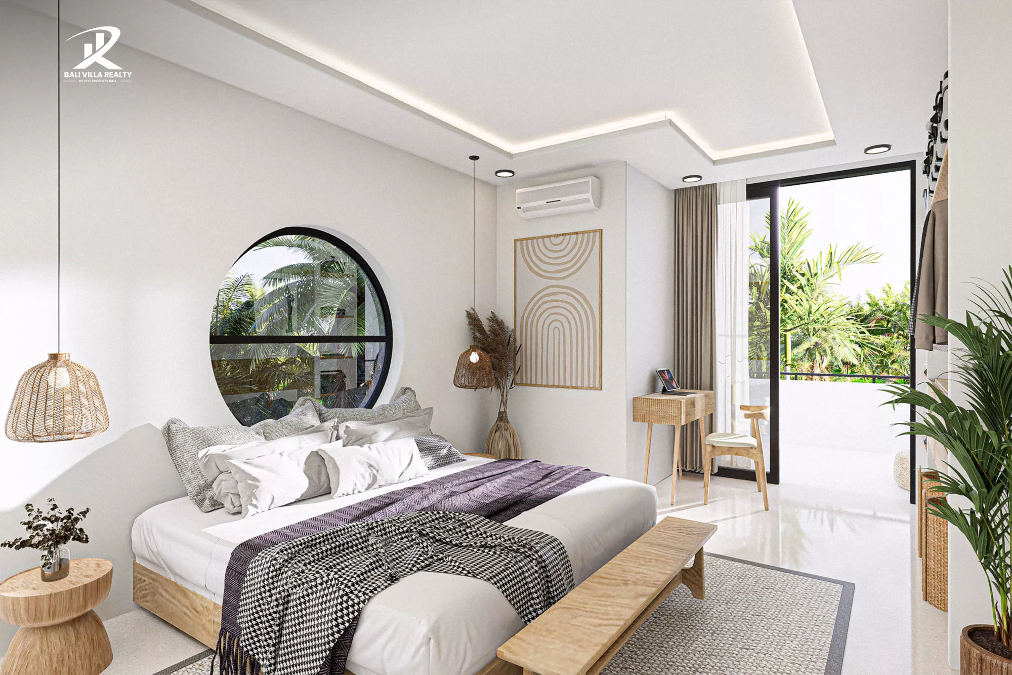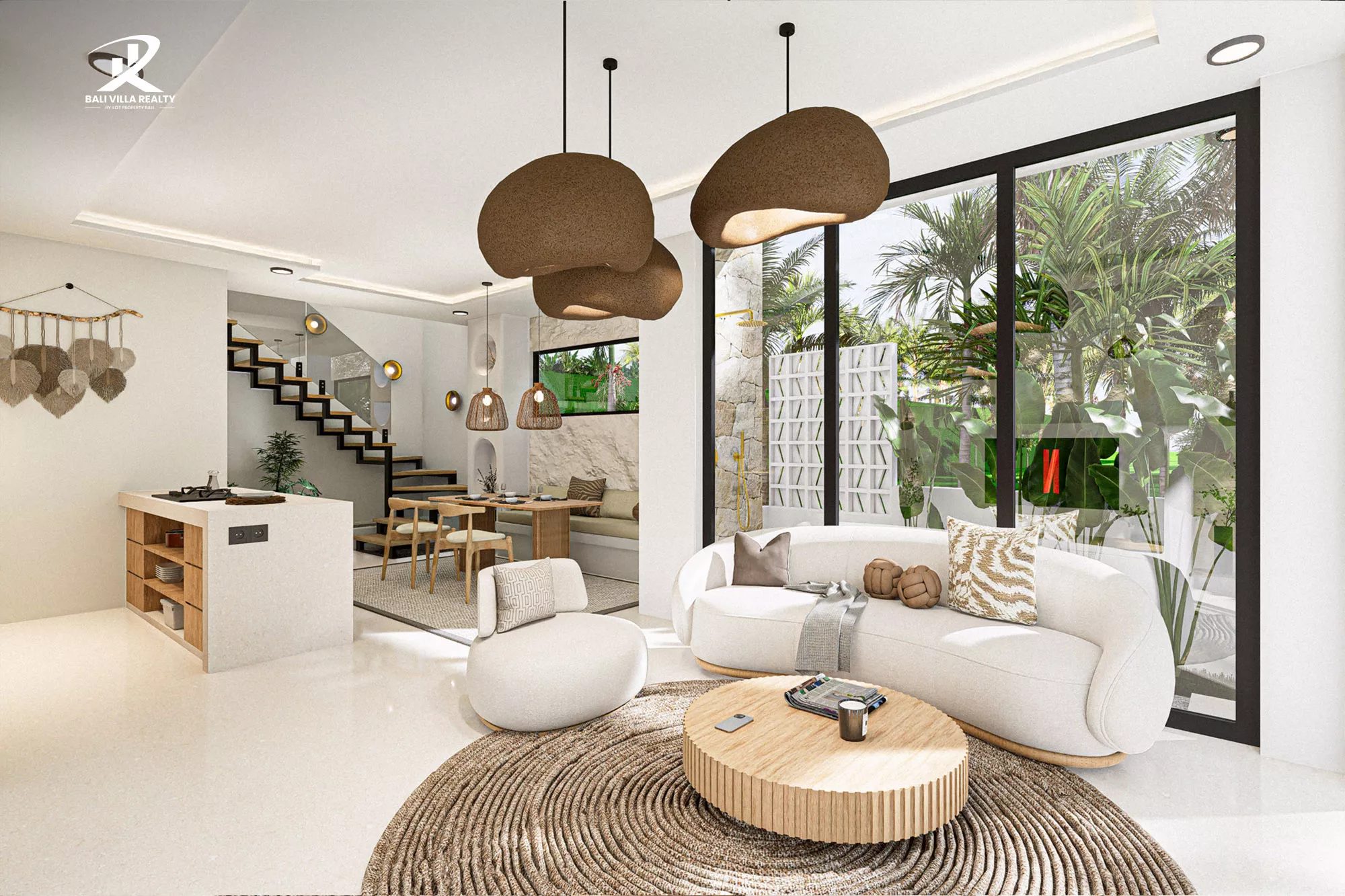 The ground floor welcomes you with an expansive open-plan living area, featuring a sunken-style lounge and a designer kitchen that flows seamlessly toward your private emerald swimming pool. Upstairs, the sanctuary continues with a master suite boasting a unique circular “moon” window, a dedicated workspace, and a private terrace overlooking the lush Balinese palms.