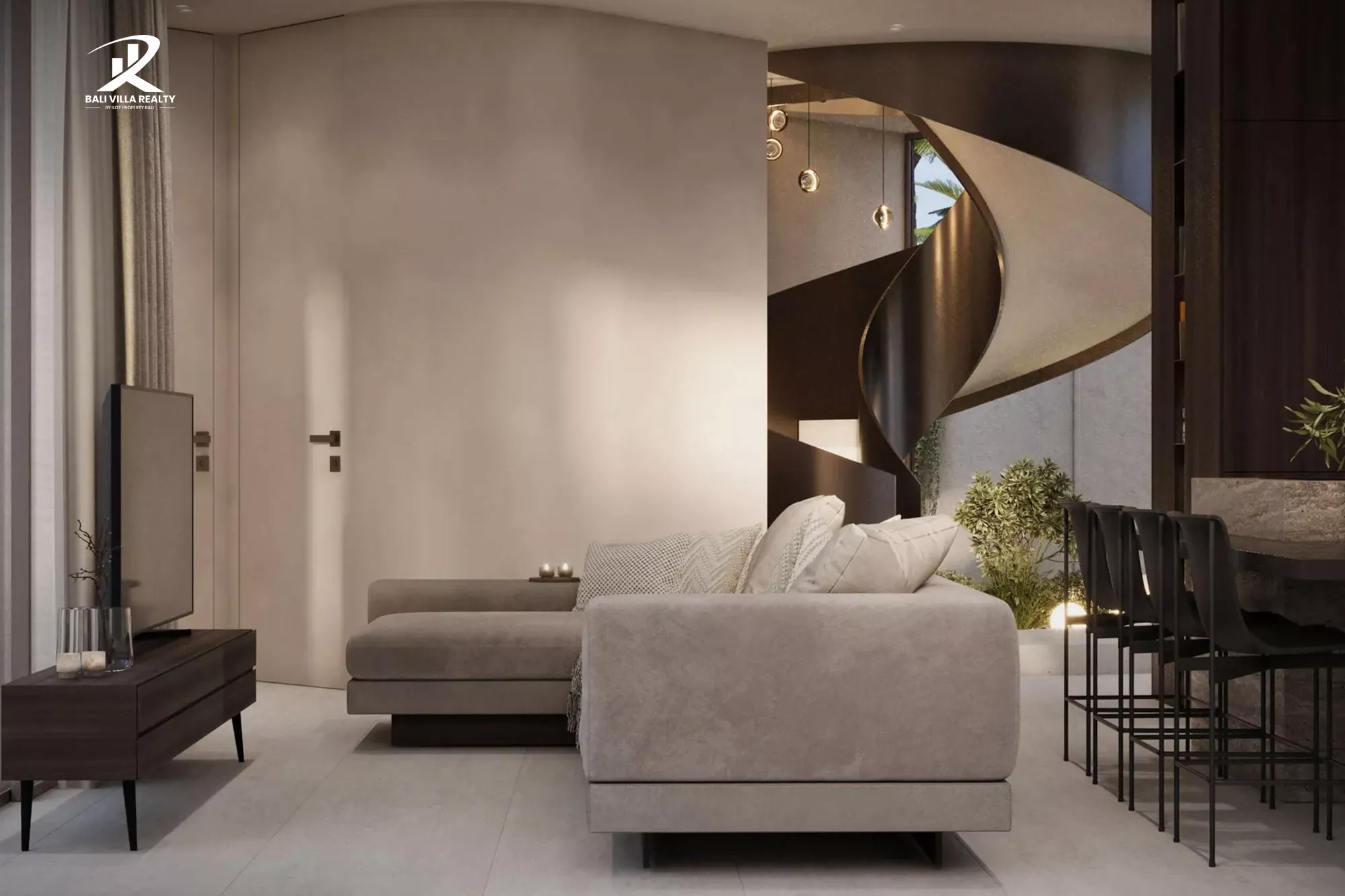 • Grand Interiors: A centerpiece spiral staircase connects the levels, while floor-to-ceiling glass walls frame the lush Uluwatu landscape.