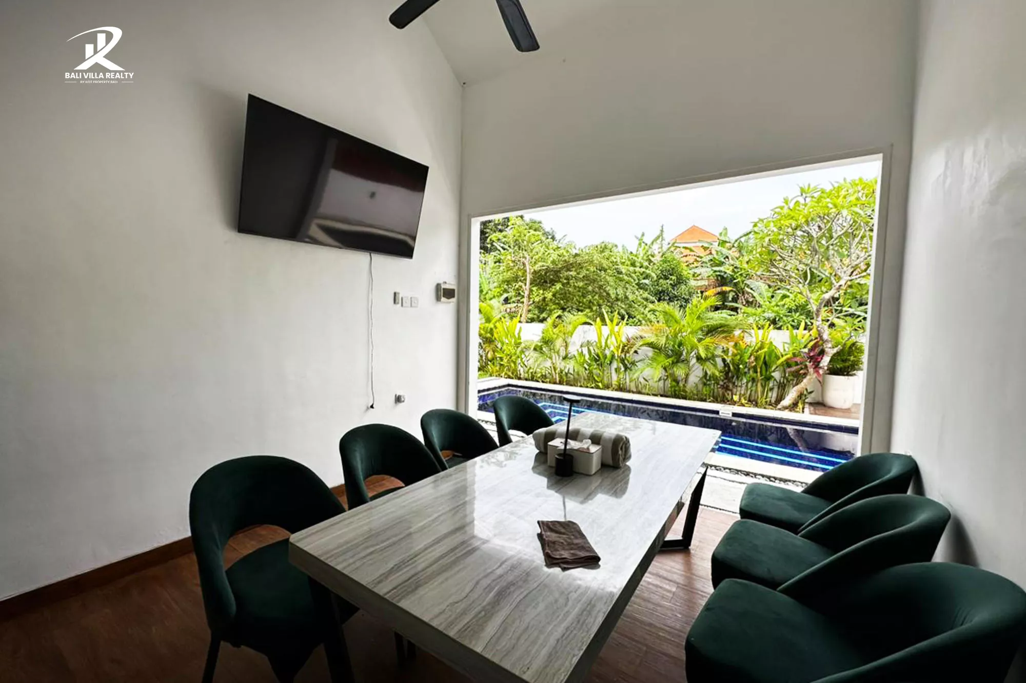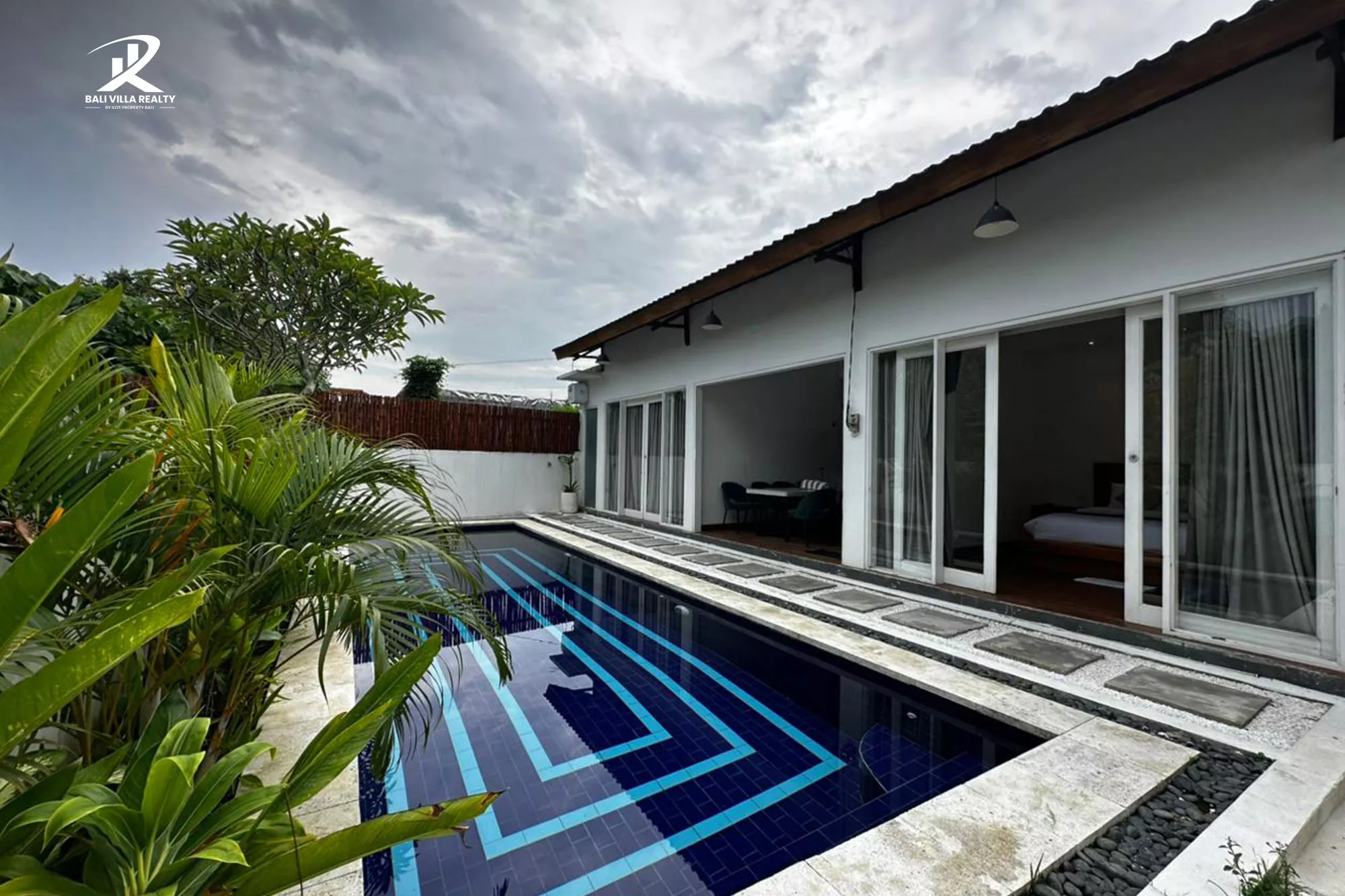 - Seamless Indoor-Outdoor Living: Large sliding glass doors connect the plush bedrooms and dining area directly to the poolside terrace.