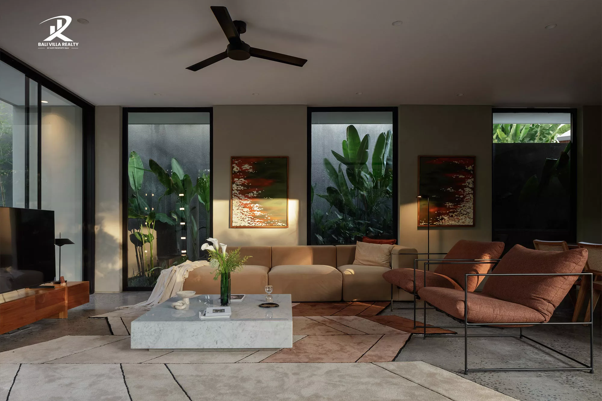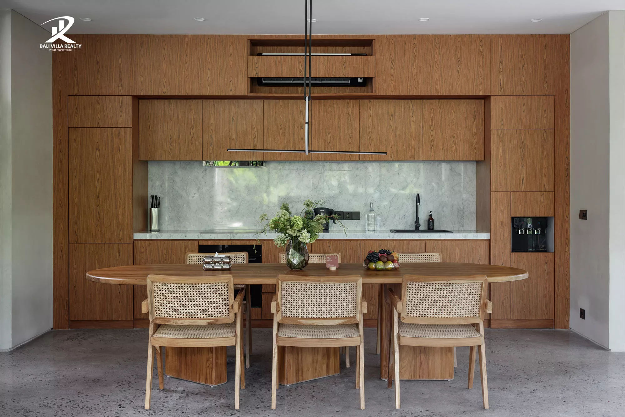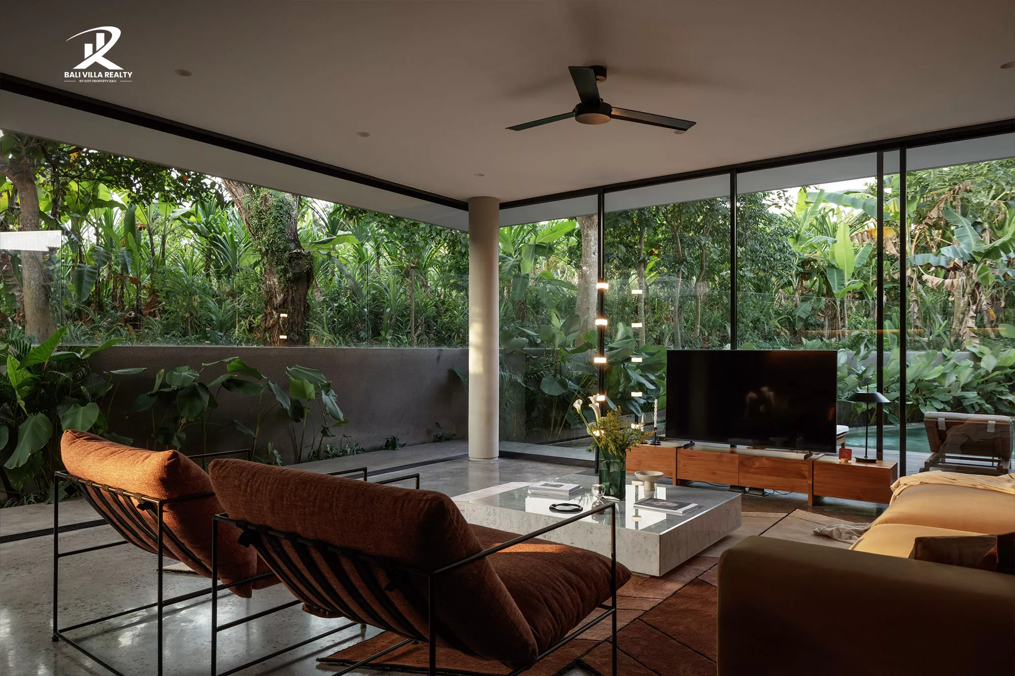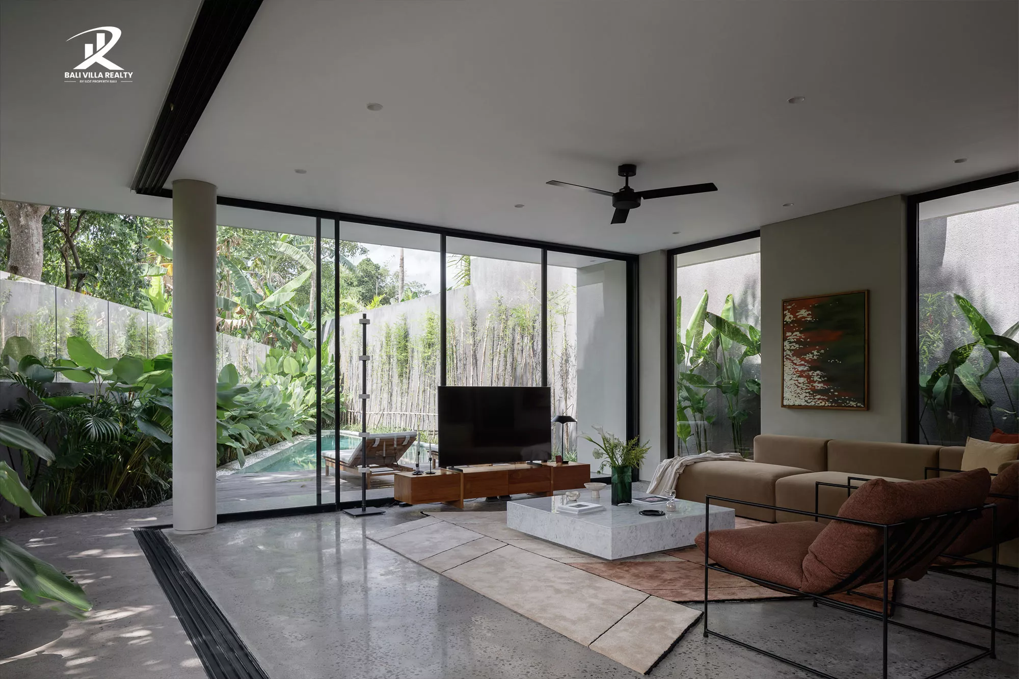 The villa features a striking “glass box” design, where floor-to-ceiling sliding walls dissolve the boundary between the polished concrete interiors and the tropical garden oasis. With its low-slung horizontal profile, warm timber paneling, and curated minimalist furniture, this home offers a level of timeless cool rarely seen in the tropics. Whether you are lounging by the emerald-green pool or enjoying the integrated designer kitchen, every moment here feels like a scene from a Hollywood retreat.