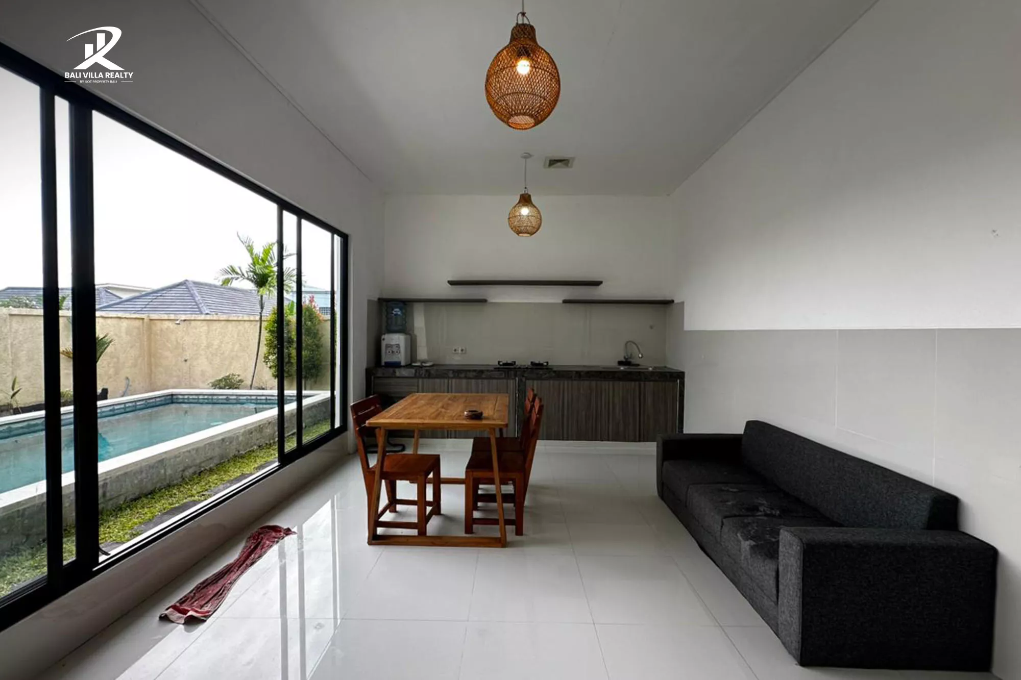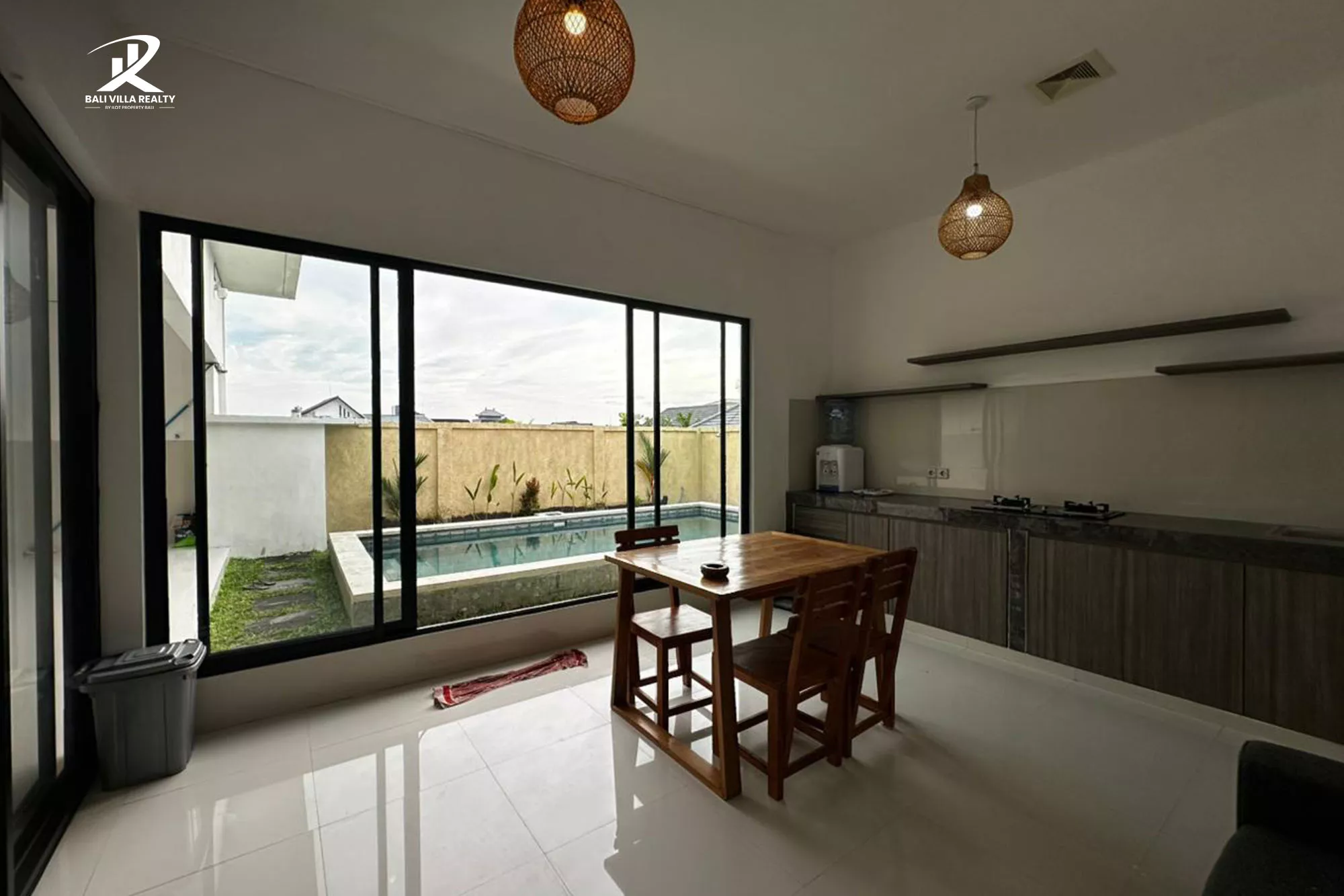 Step into a world of brightness and air. The Pavilion Tibubeneng is designed with an emphasis on “open-concept” flow, featuring massive floor-to-ceiling glass sliding doors that dissolve the boundaries between your stylish interior and your private aquatic oasis. The heart of the home is a vast, white-washed living and dining area that stays cool year-round, accented by warm wooden furnishings and traditional woven lighting.