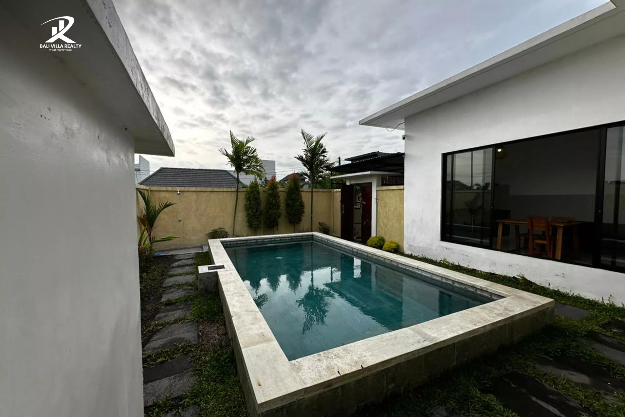Each of the two spacious bedrooms is a master-class in minimalism, designed with “sleep-sanctuary” principles in mind. Large windows overlook the turquoise pool, allowing you to wake up to the sight of shimmering water and lush garden palms. Whether you are prepping a meal in the sleek, integrated kitchenette or enjoying a sunset drink on the poolside terrace, this villa offers a quiet, refined escape just minutes away from the vibrant energy of Canggu.