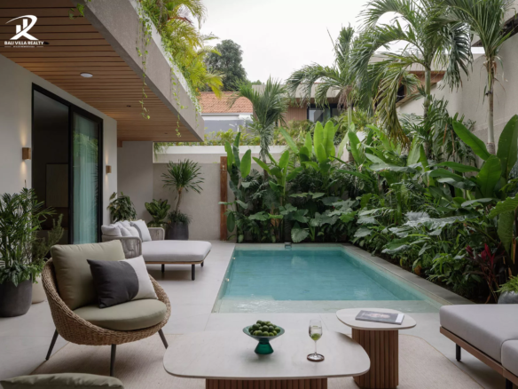 The villa’s “U-shaped” design pivots around a central crystalline pool, creating a private courtyard that feels like a hidden oasis. Inside, the aesthetic is masterfully understated: micro-cement finishes, warm timber accents, and floor-to-ceiling glass that dissolves the boundary between the chic interior and the lush gardens. Whether you are hosting a sunset gathering in the sunken lounge or finding stillness in the spa-like master suite, this residence is designed for a lifestyle of effortless elegance. Just minutes from the surf breaks and world-class dining of Pererenan Beach, it is both a serene sanctuary and a high-performance investment.
