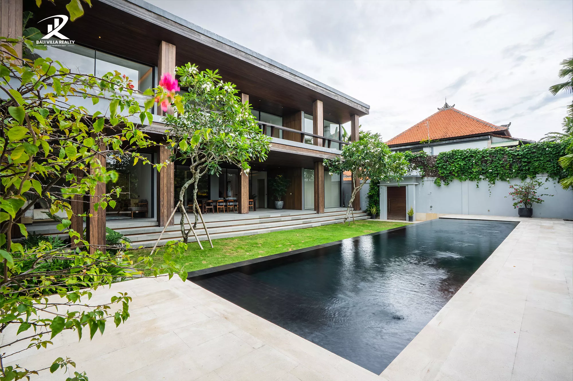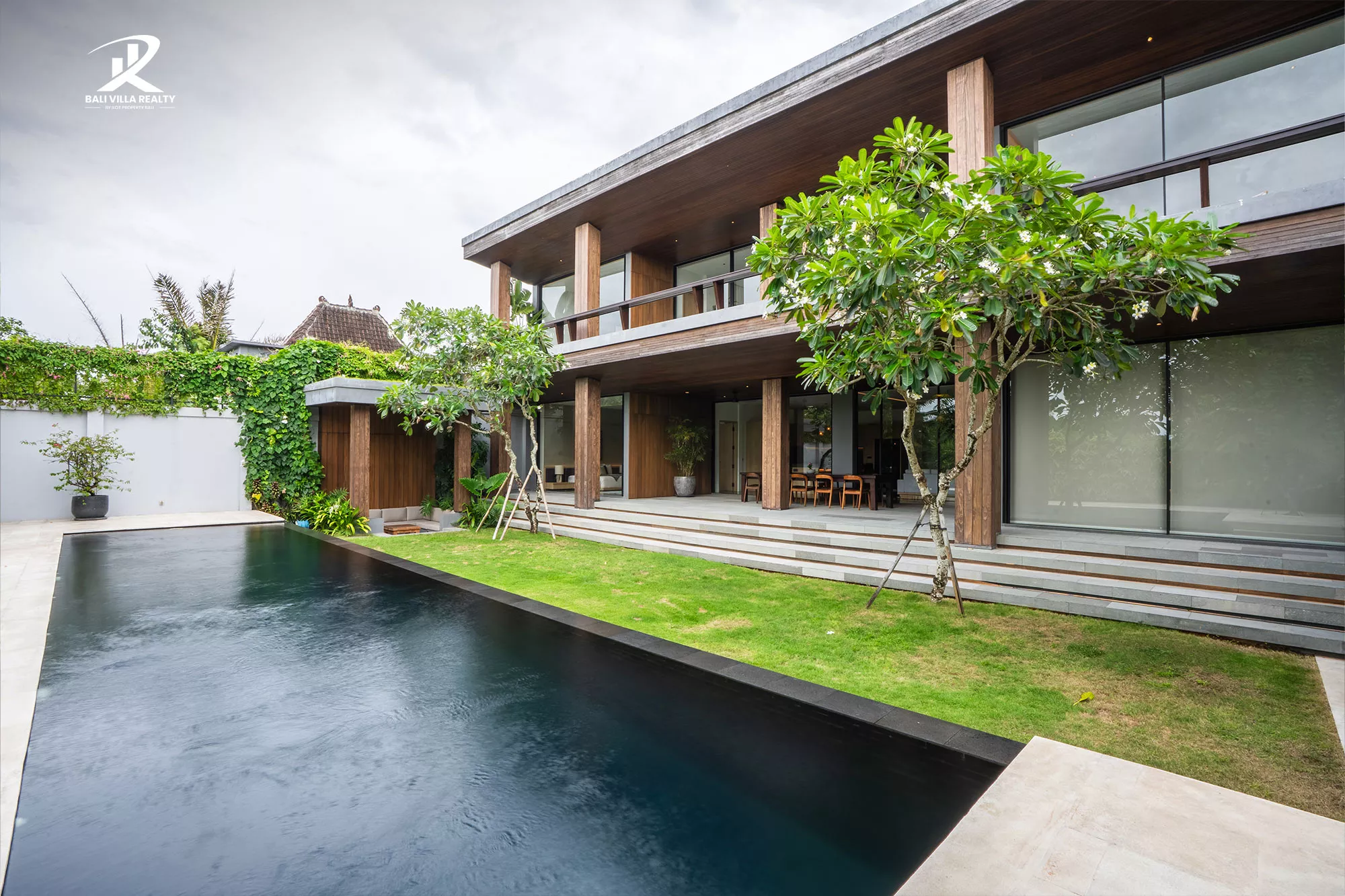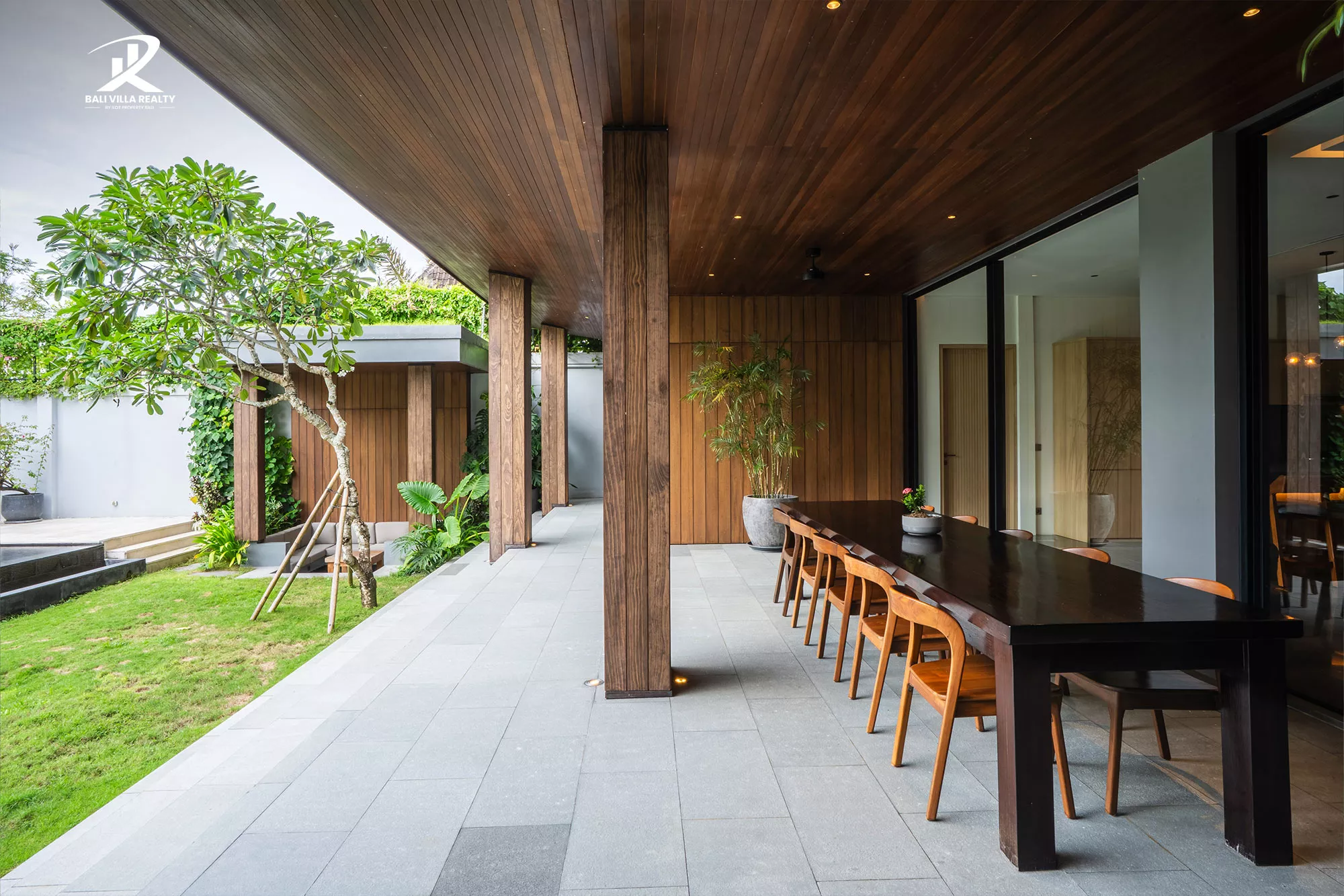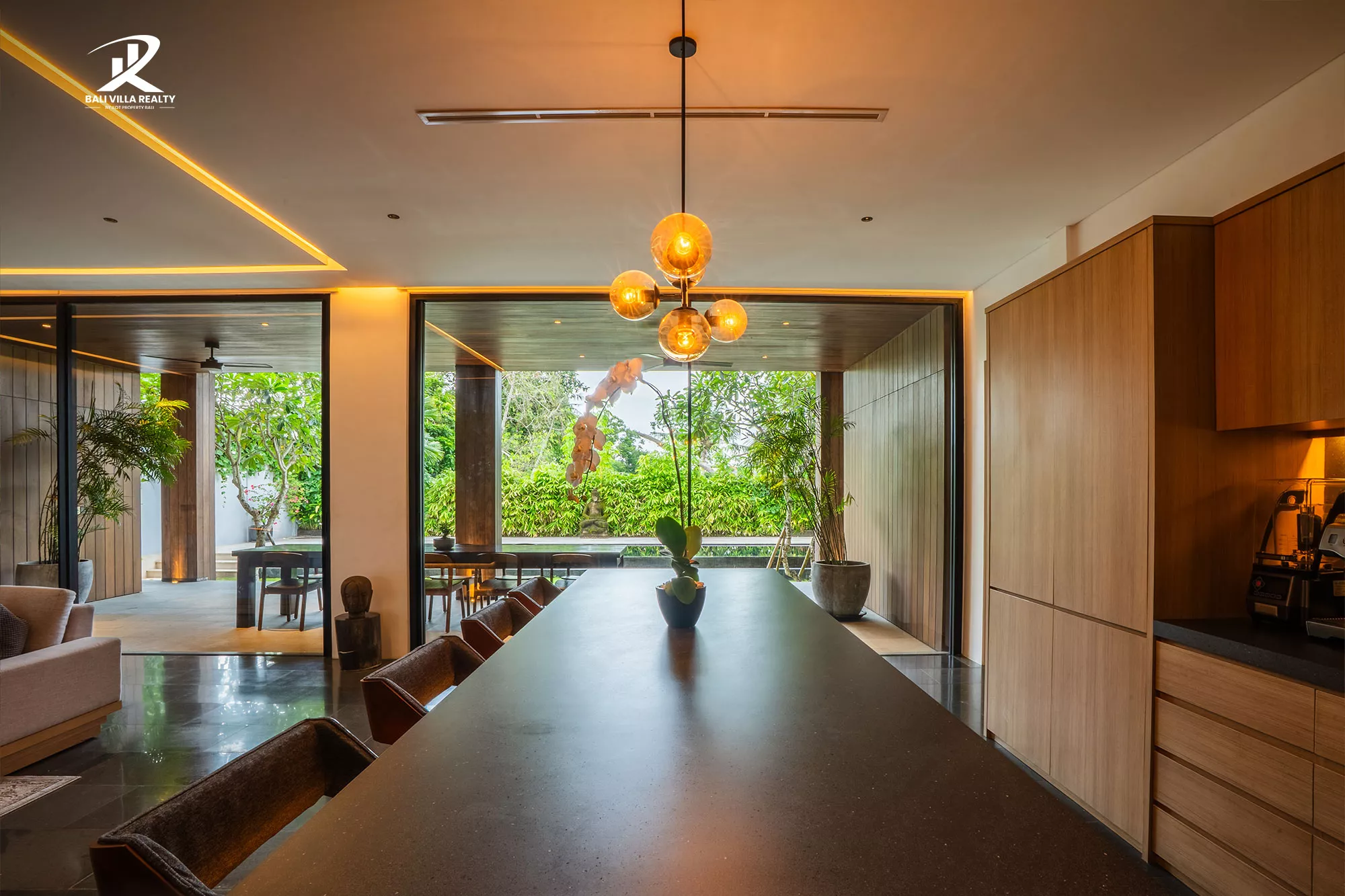 • Indoor-Outdoor Flow: Massive floor-to-ceiling glass sliders open directly onto a manicured tropical garden and an oversized swimming pool.