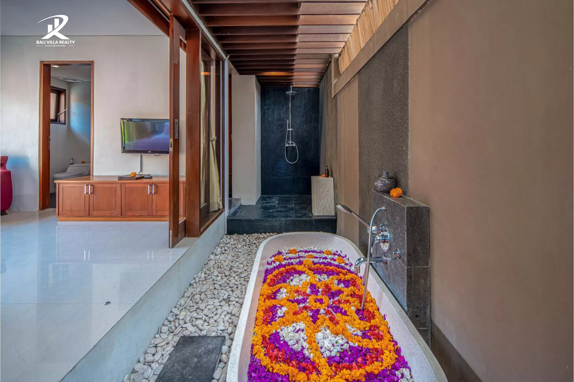 - Outdoor bathtub with flower petal setup for a serene spa ambiance