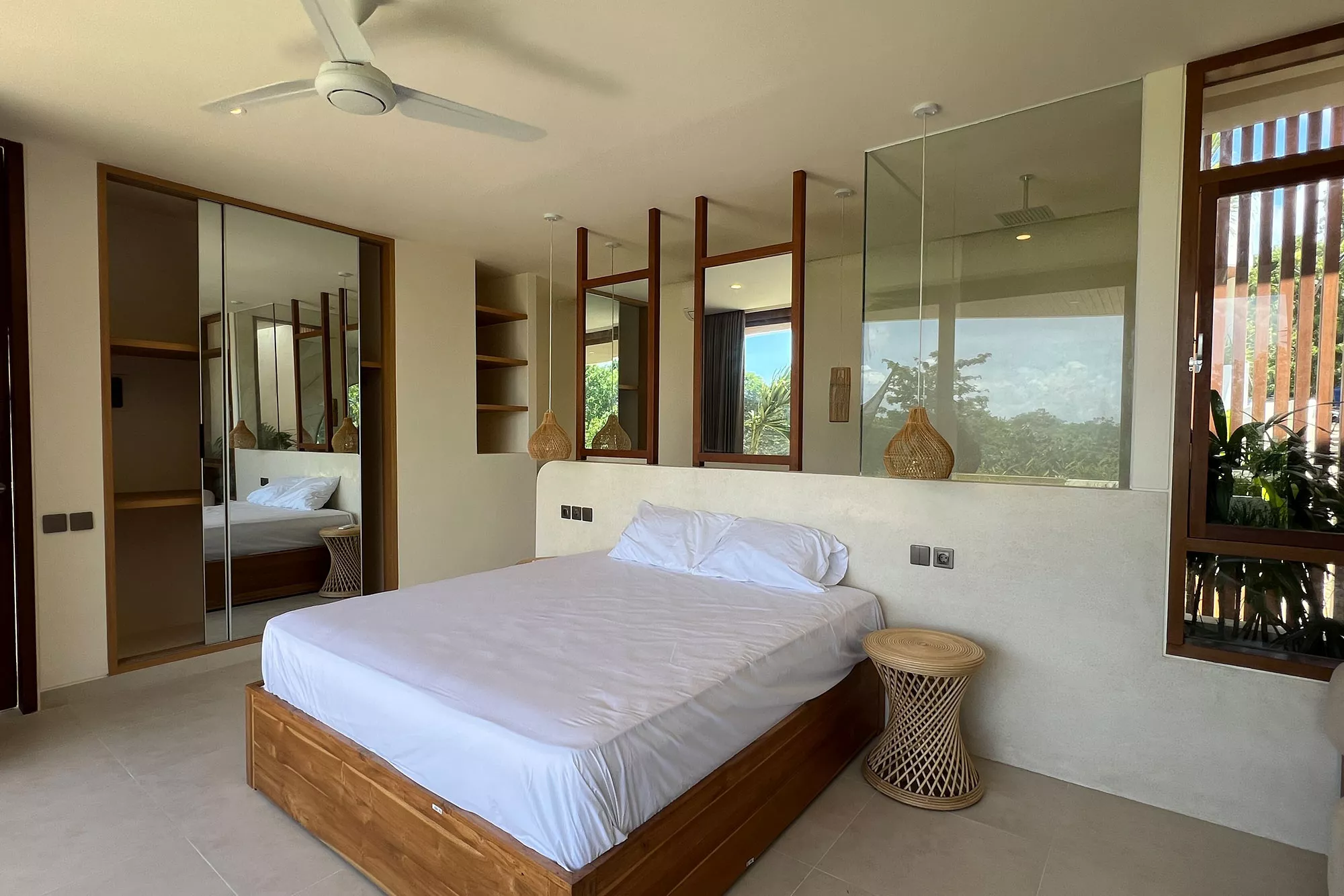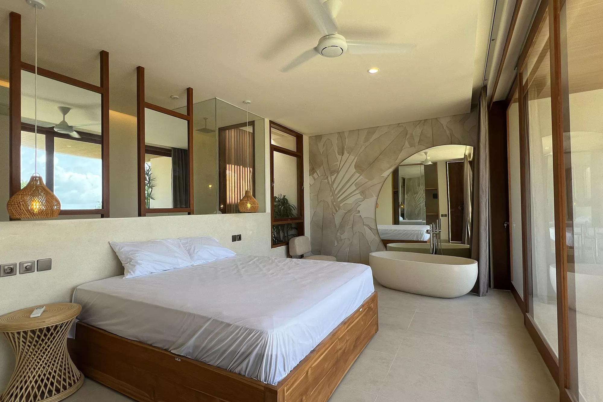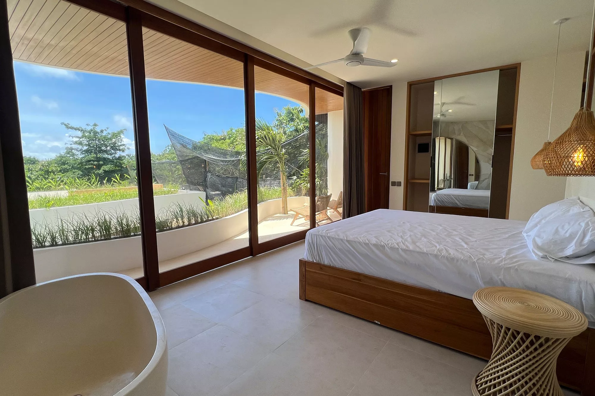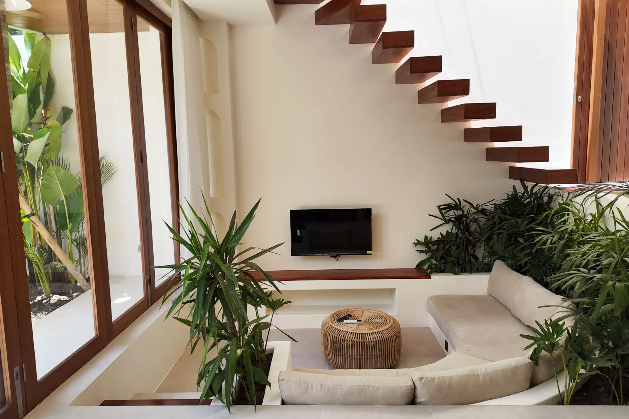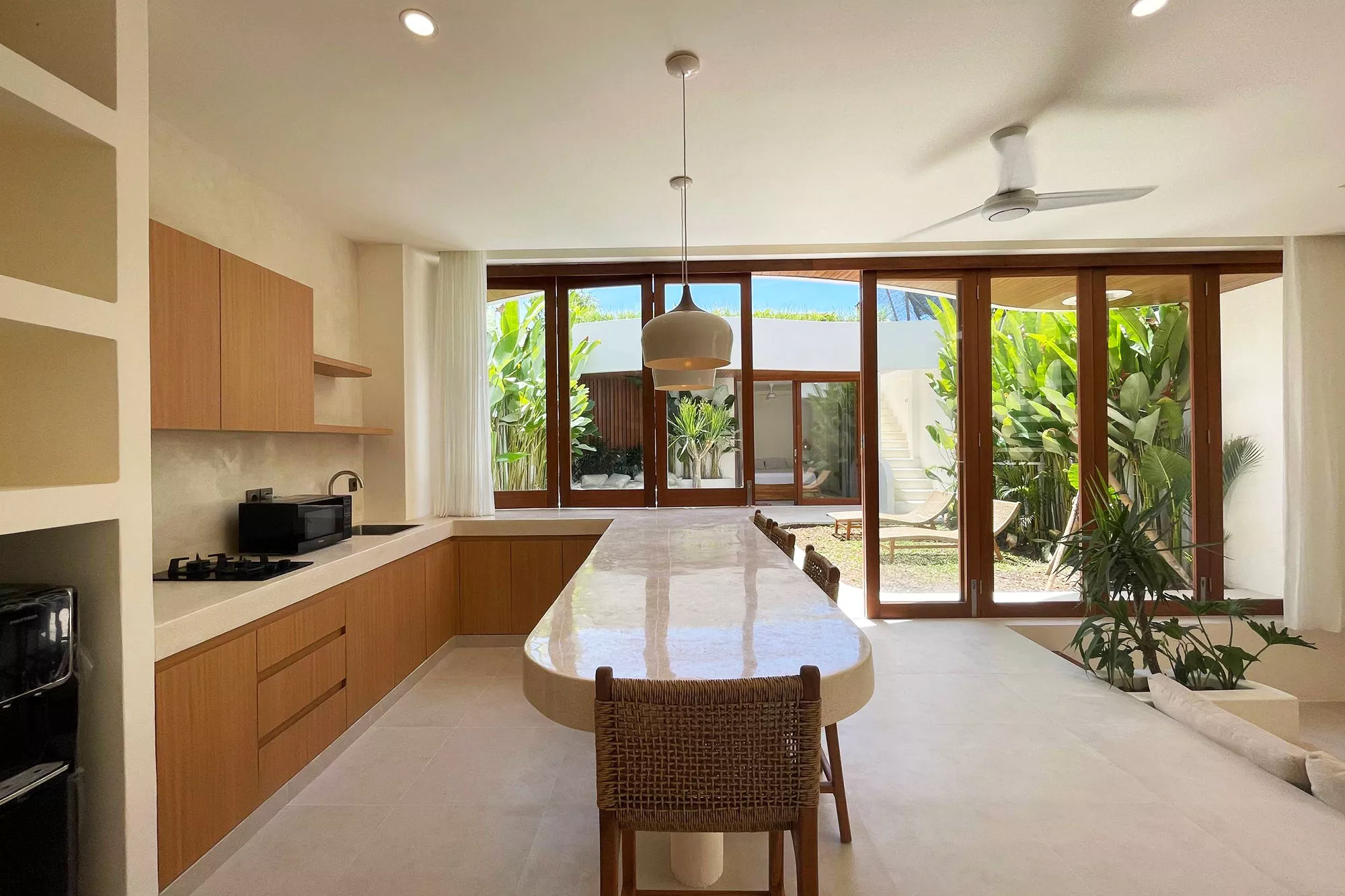 - Indoor-Outdoor Harmony: Retractable glass walls and open terraces connect the indoors with lush gardens and palm trees, creating a natural sanctuary.