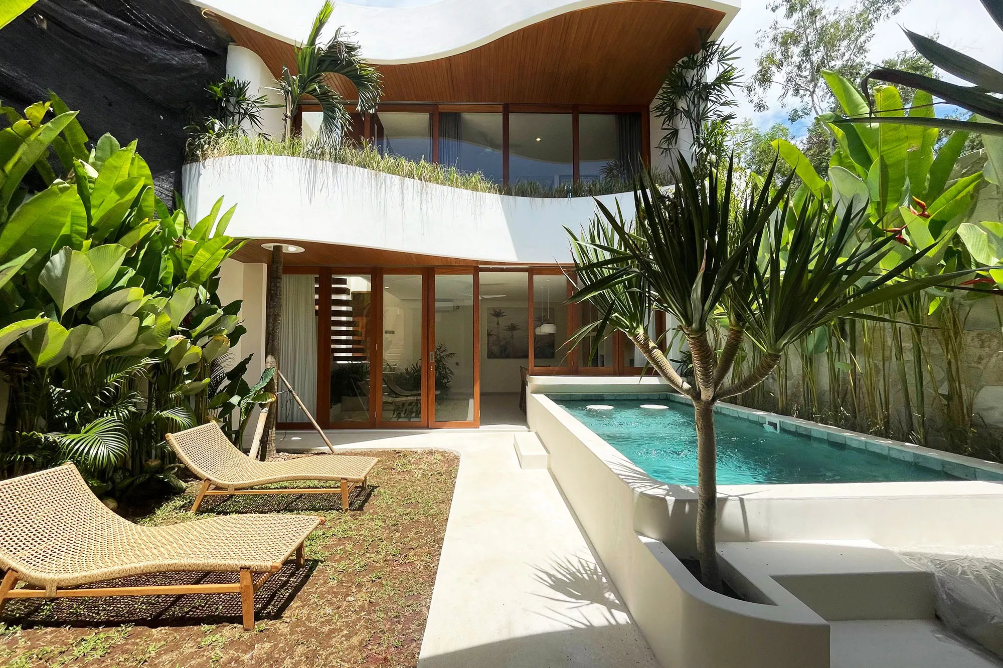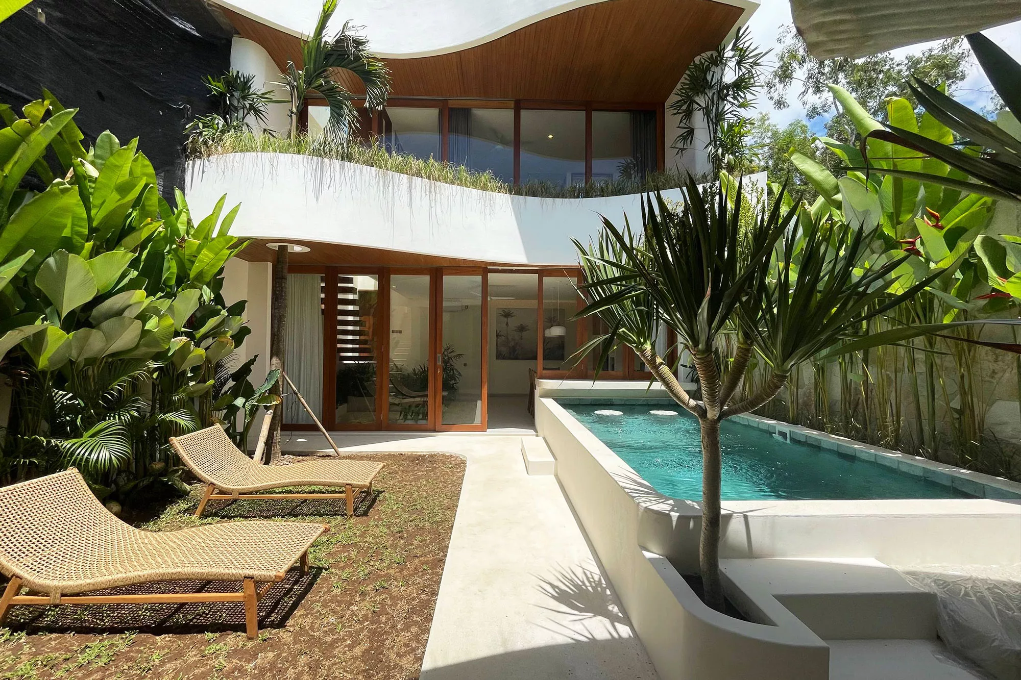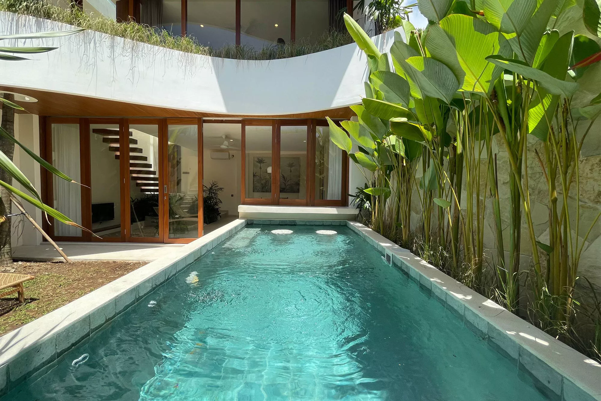 - Private Pool Oasis: A sparkling turquoise pool surrounded by tropical landscaping and sun loungers, offering a resort-style experience right at home.