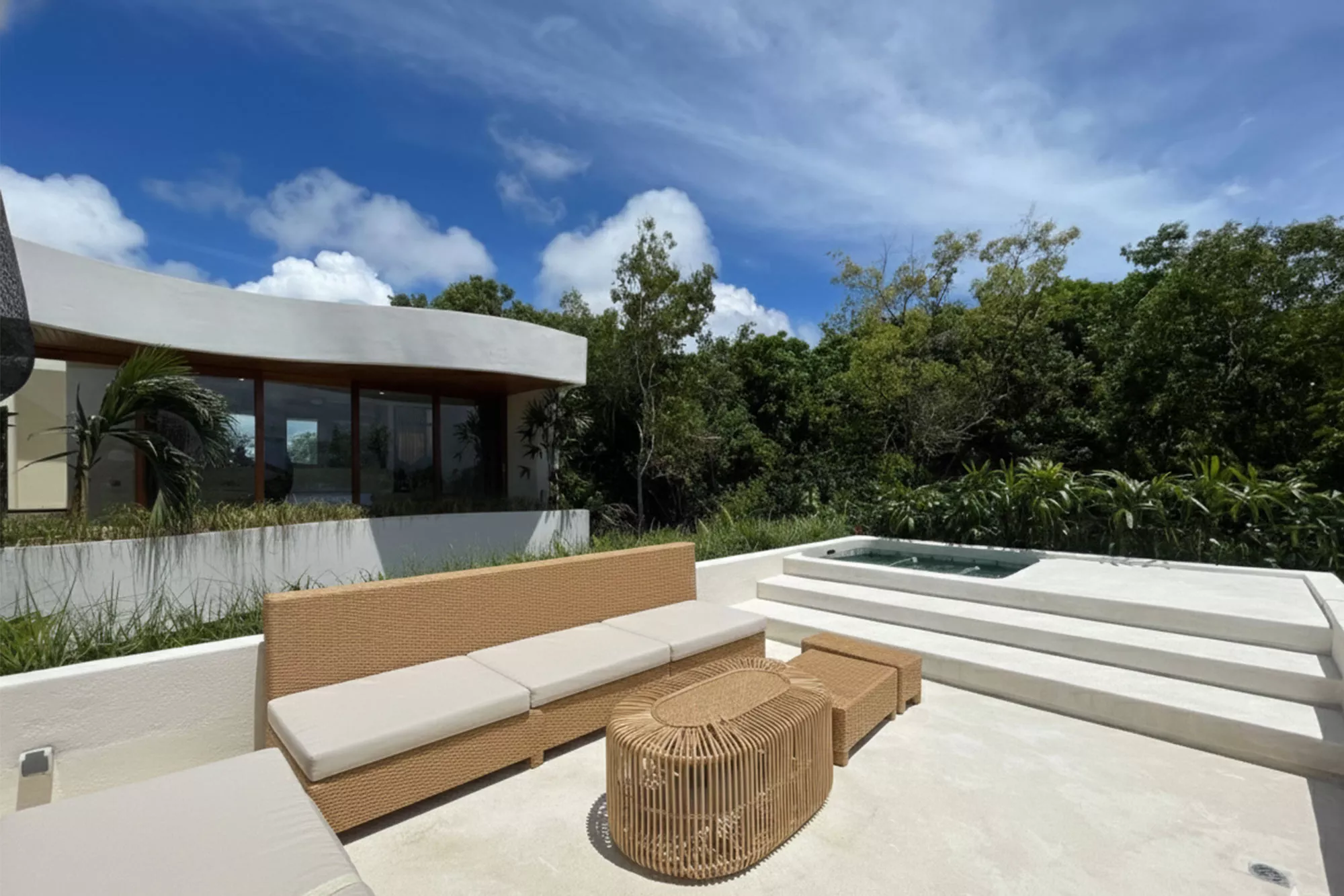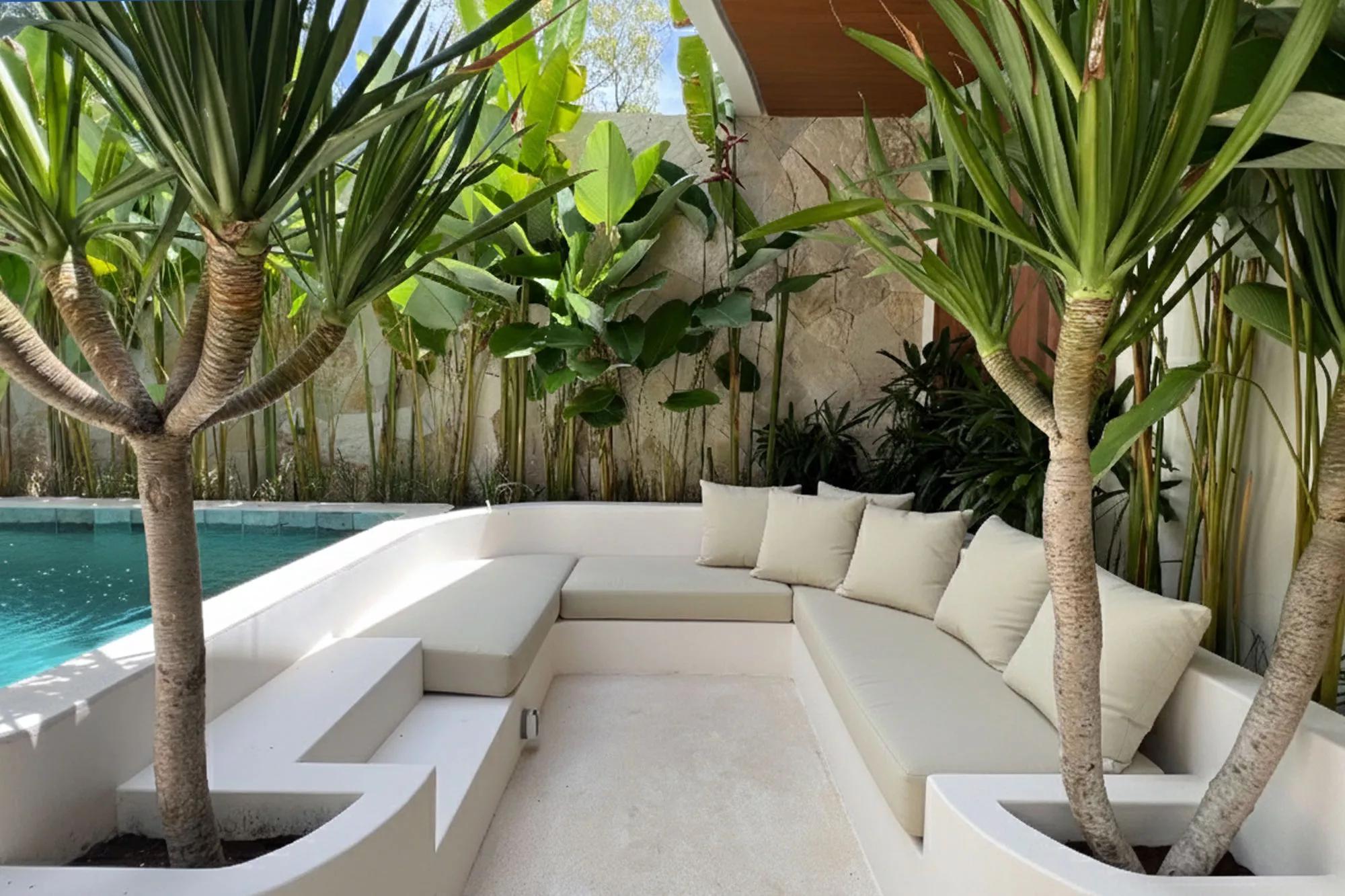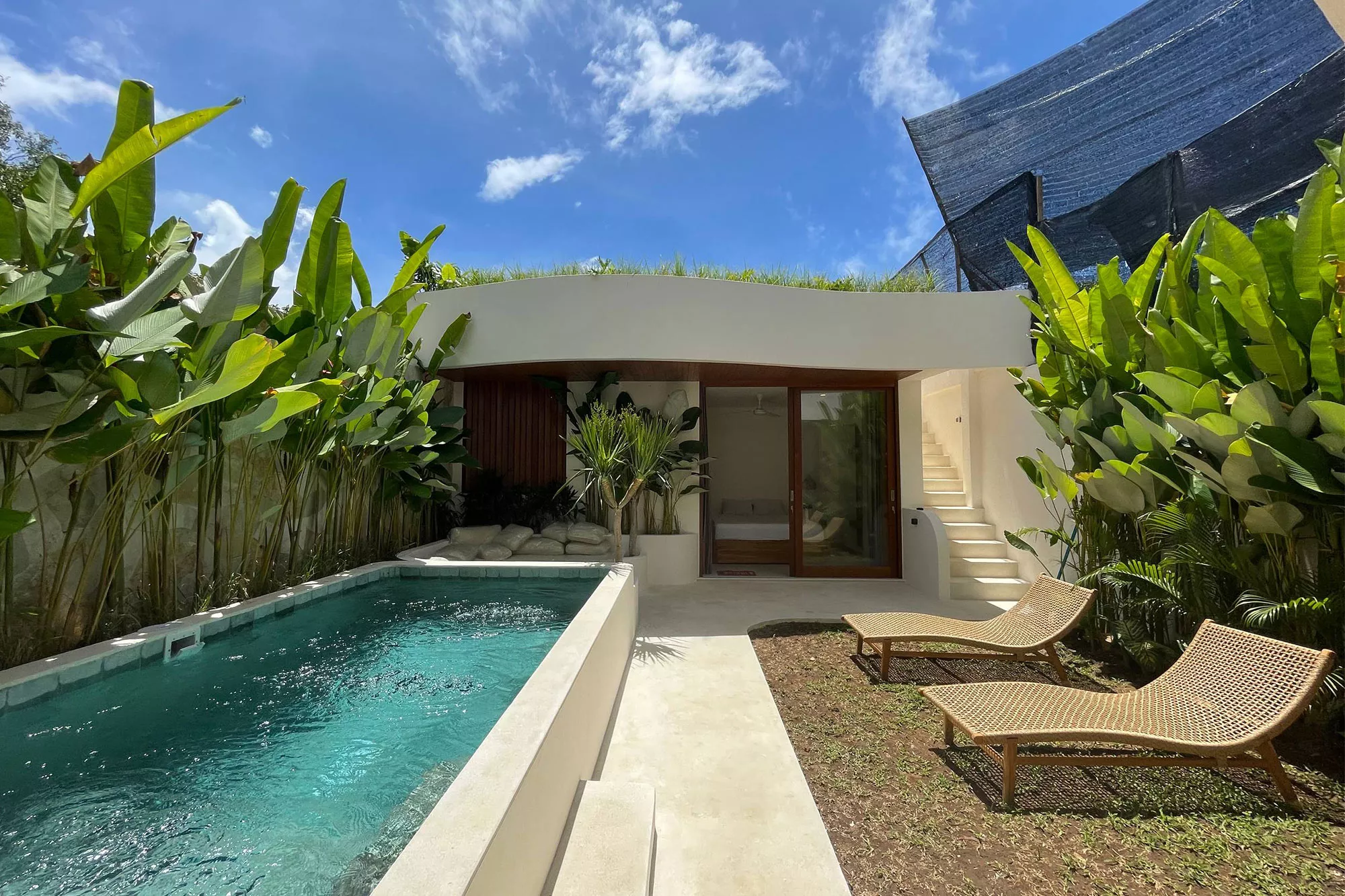 - Private Pool Oasis: A sparkling turquoise pool surrounded by tropical landscaping and sun loungers, offering a resort-style experience right at home.