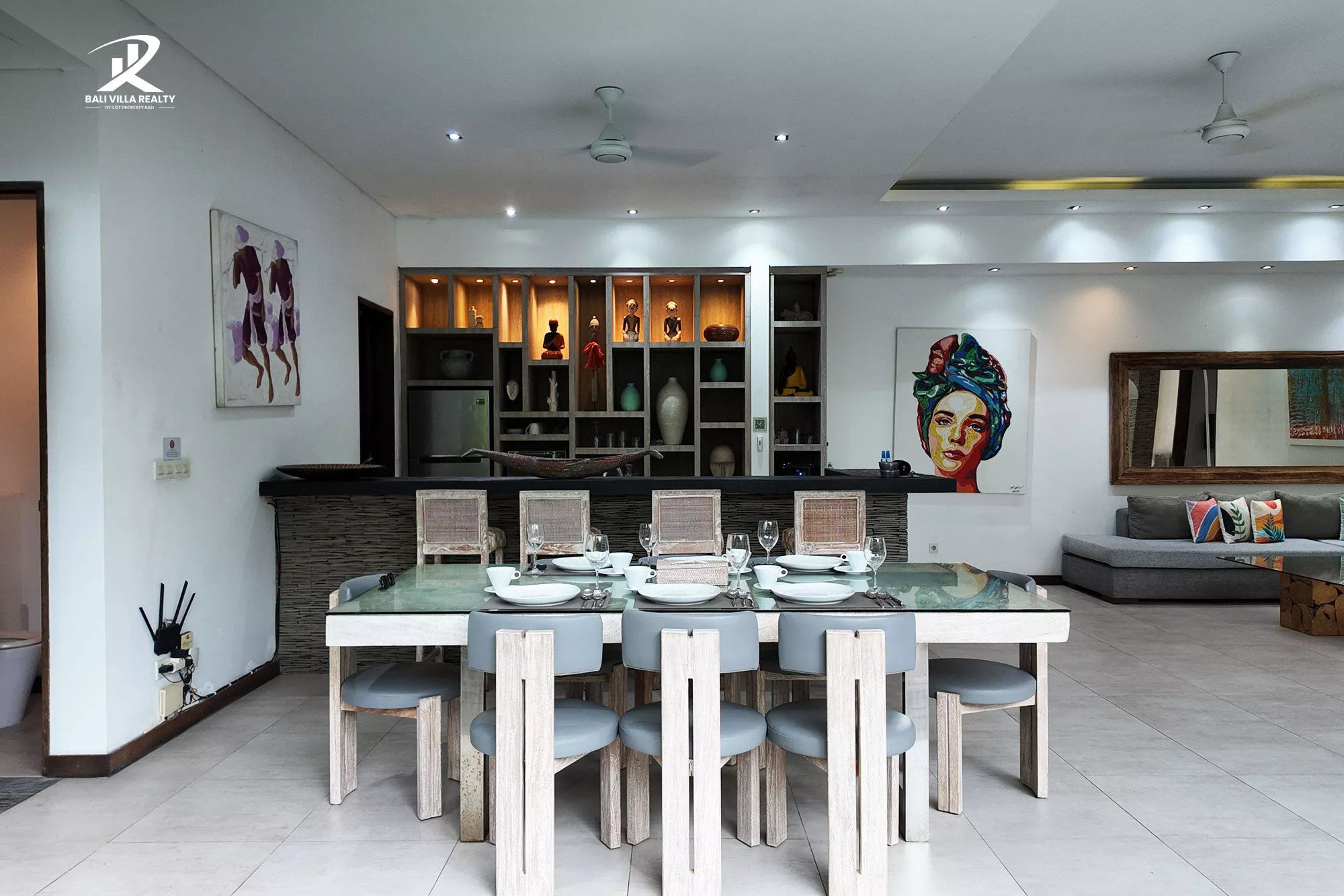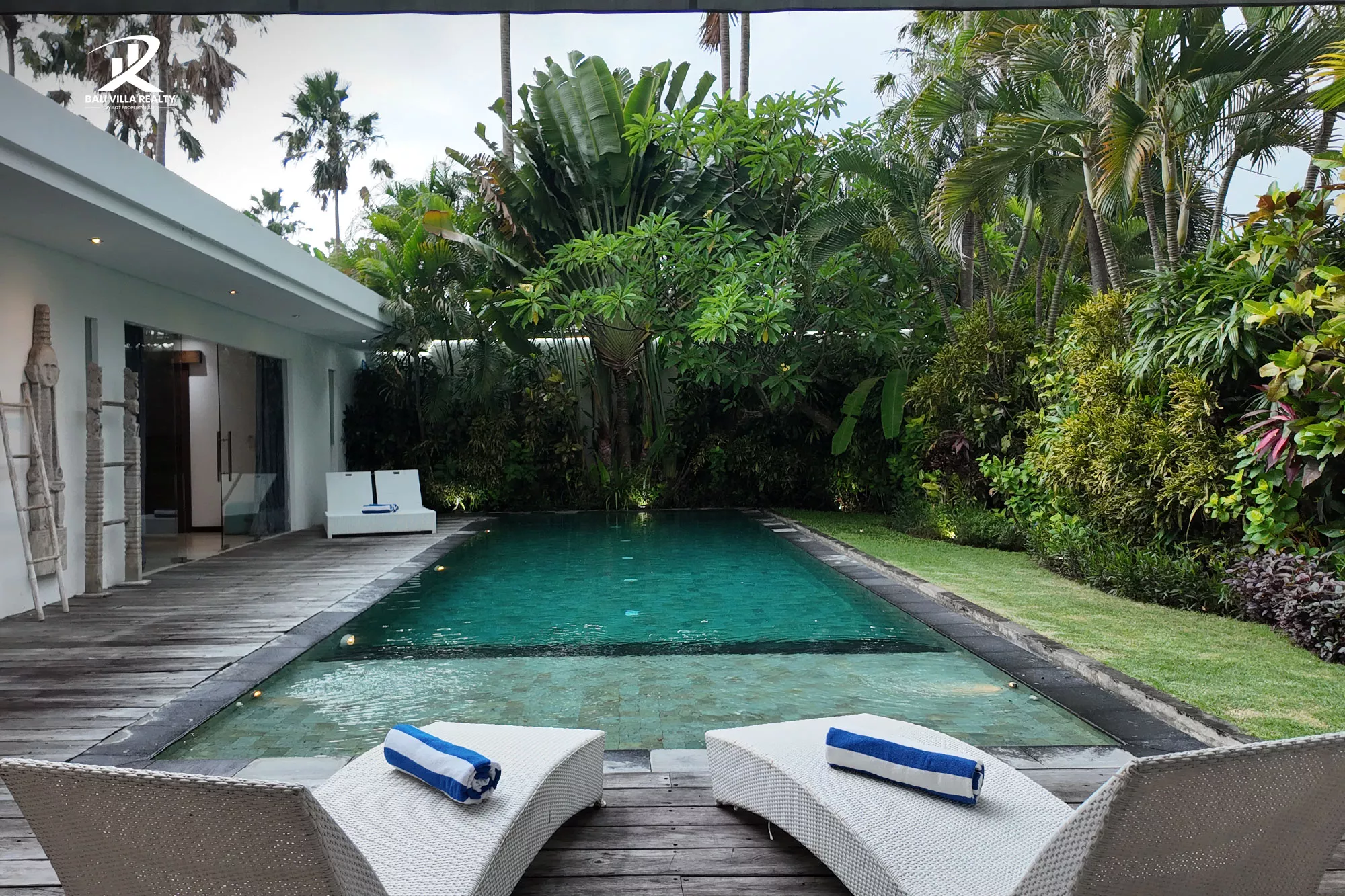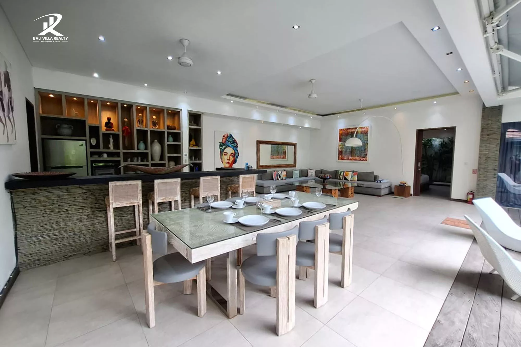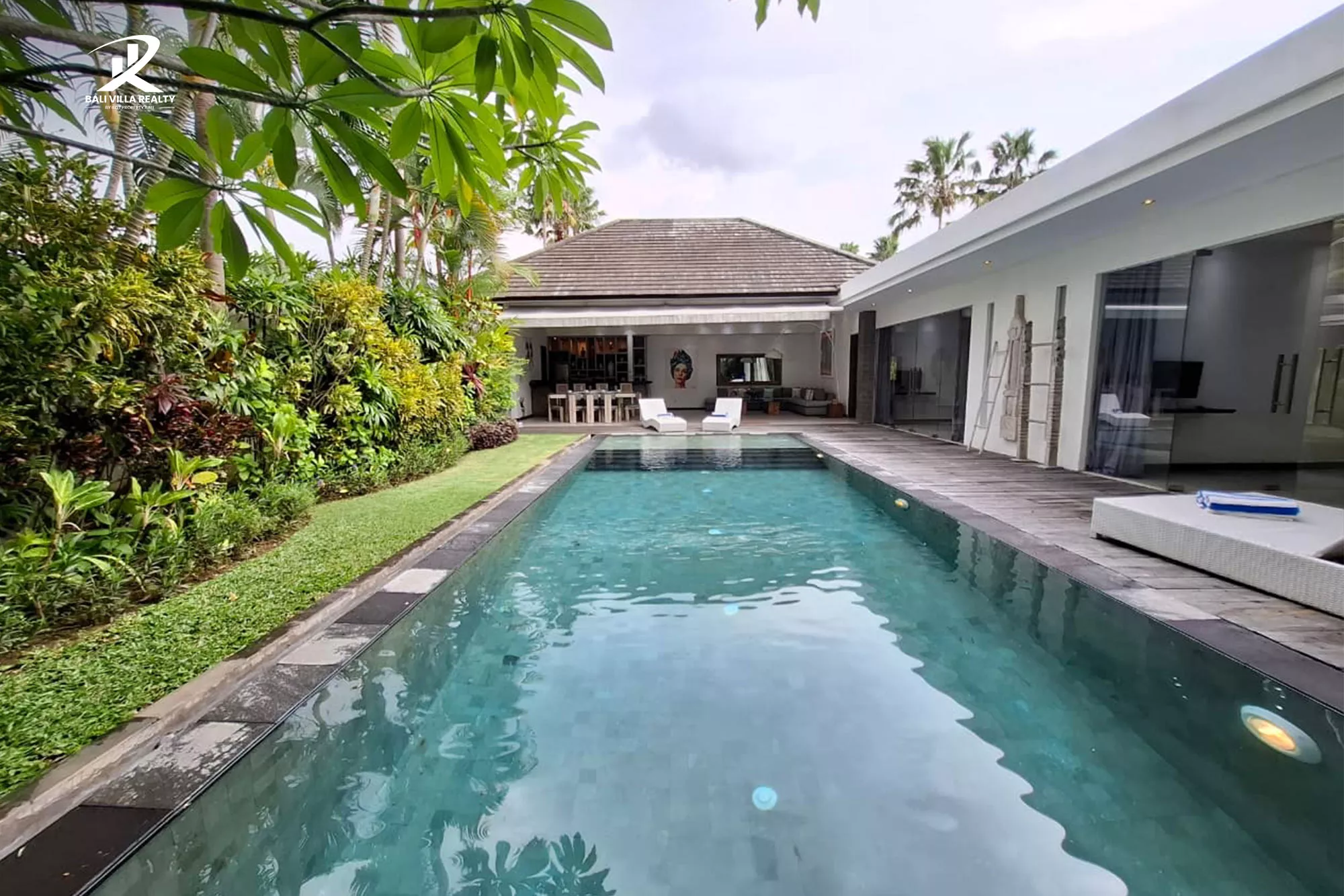 Each bedroom is generously sized and ensuite, opening to lush greenery or the pool area, offering privacy and tranquility. The open-plan living, dining, and kitchen areas flow seamlessly to the outdoor space, where a private swimming pool, sun loungers, and landscaped garden invite you to relax or entertain with ease. Bright interiors, tasteful artwork, and quality finishes complete this elegant Seminyak home.