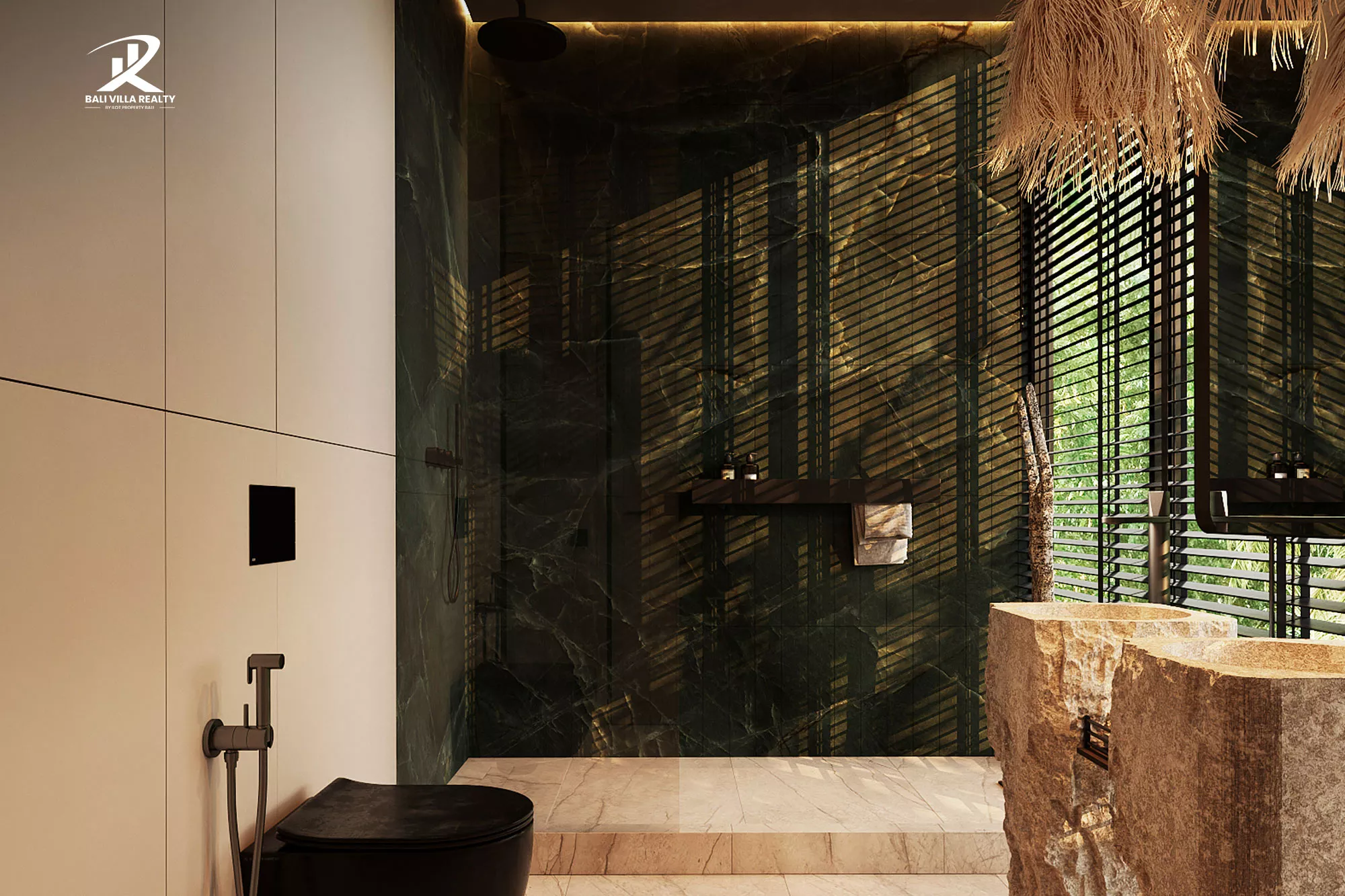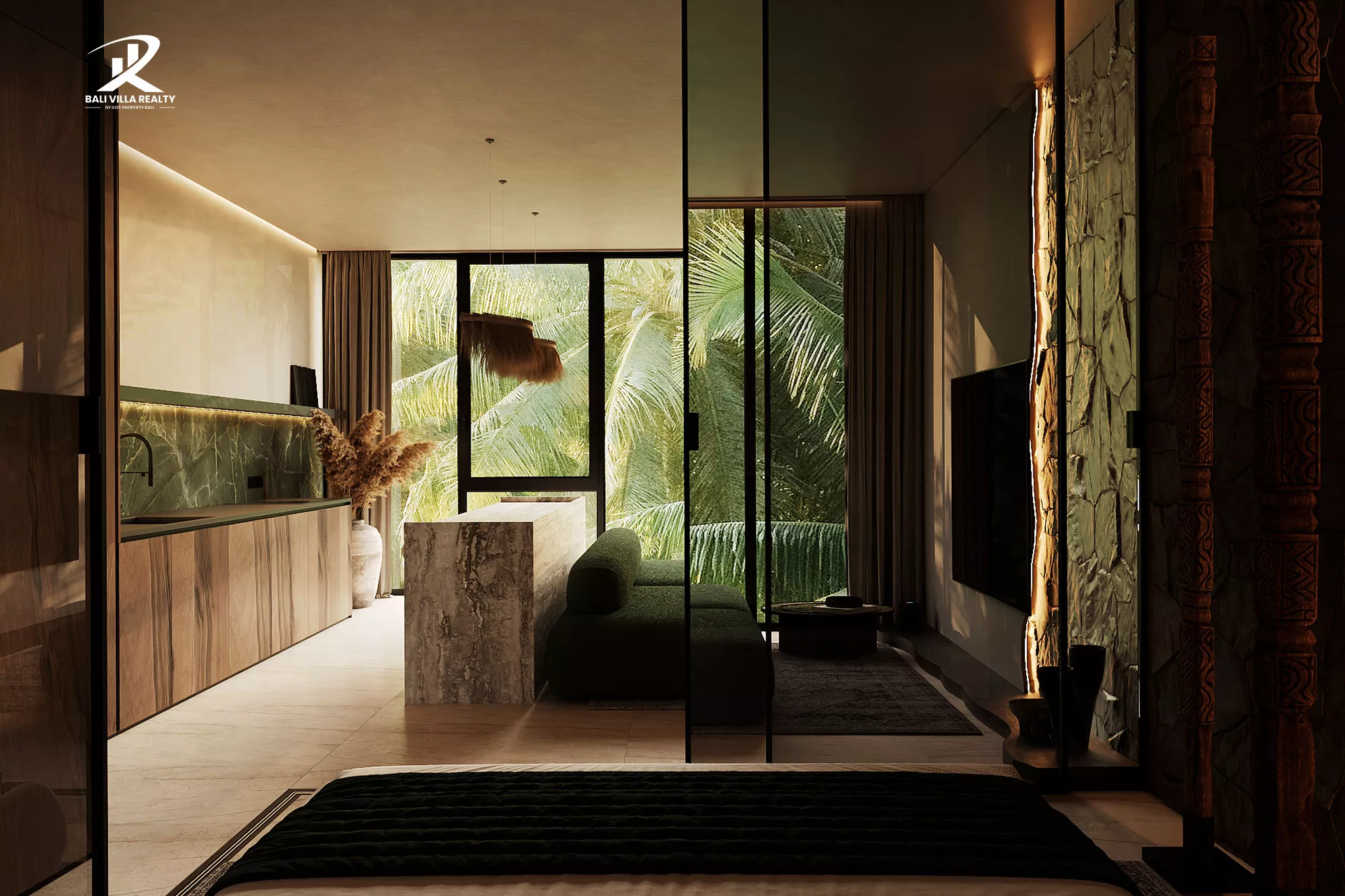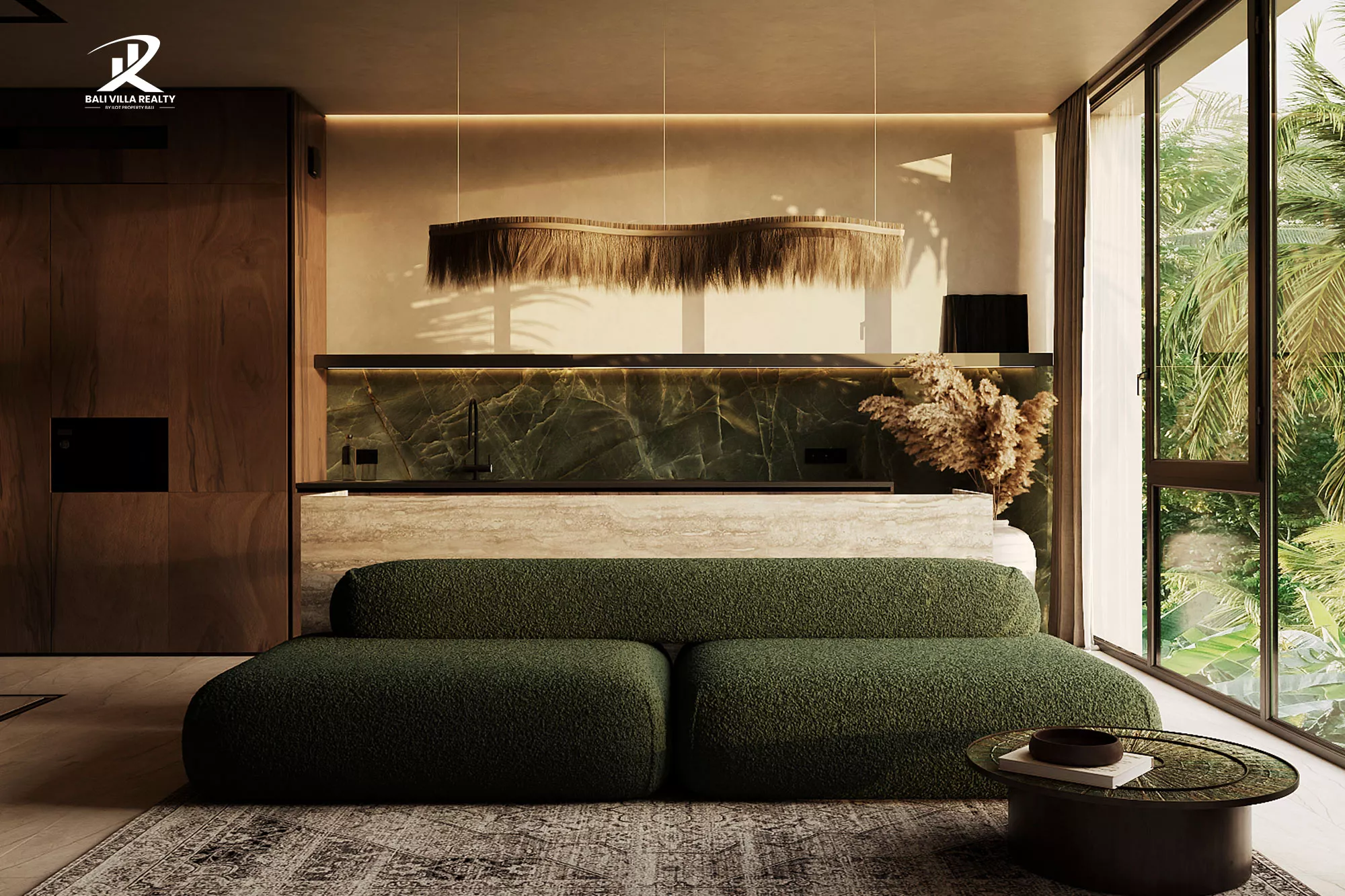 This thoughtfully curated home captures the essence of tropical contemporary living, blending natural stone textures, warm wood tones, and panoramic glass walls that open up to breathtaking jungle views. Every corner exudes calm sophistication from the bespoke green marble kitchen and custom minimalist furnishings, to the spa-inspired bathroom featuring raw stone basins and soft ambient lighting.