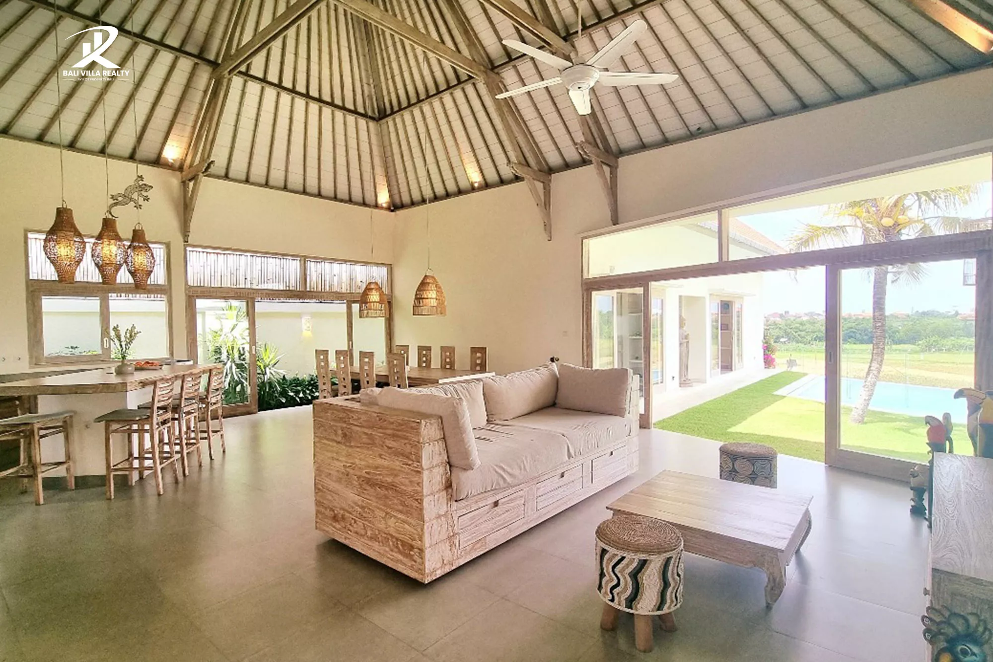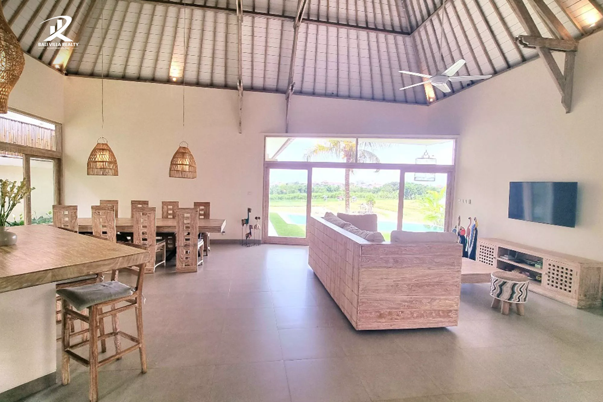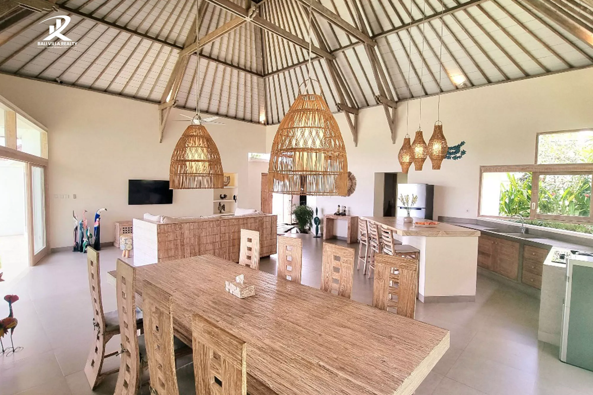 - Open-Concept Living & Dining with soaring ceilings, natural light, and stylish rattan accents