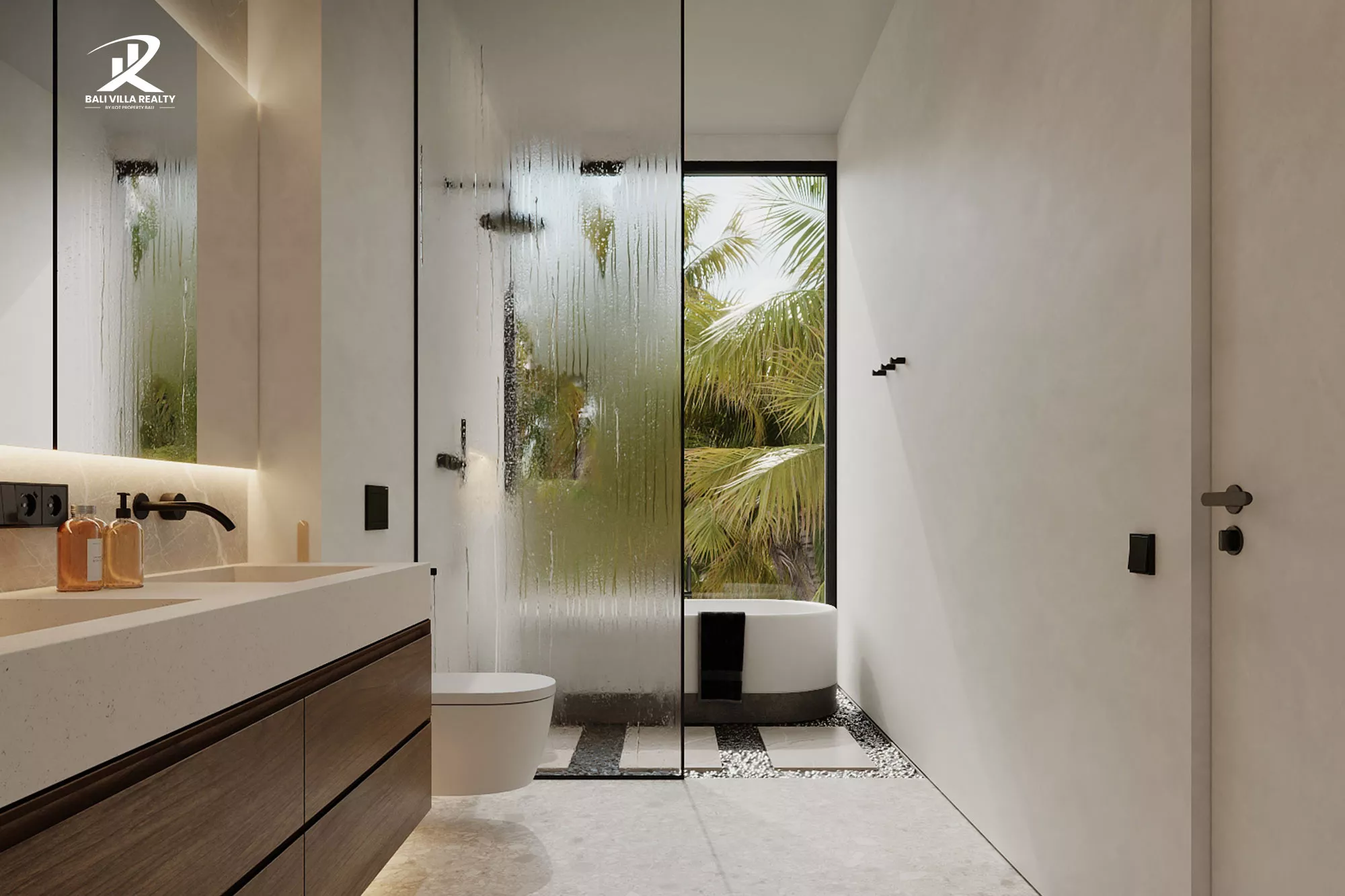 The two master bedrooms are designed as true sanctuaries, offering tranquility and direct access to outdoor views upon completion. Experience spa-like luxury in the bathrooms, featuring sleek modern vanities, immersive rain showers, and stunning freestanding bathtubs with floor-to-ceiling windows overlooking the palm trees.