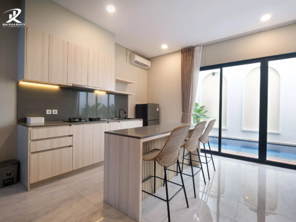Designed with high-quality materials, the villa comes fully furnished, ensuring a luxurious living experience. The enclosed kitchen features sleek, modern finishes, creating a stylish and functional space for cooking and dining.
