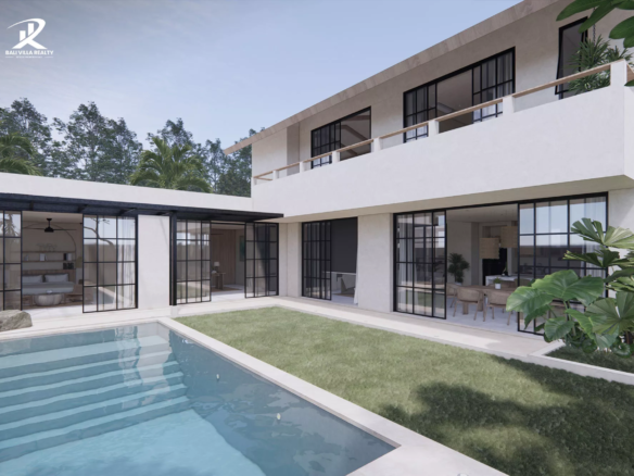 The villa showcases a clean, minimalist architectural design with sharp lines, expansive glass doors, and a well-balanced mix of indoor and outdoor living. On the ground floor, the open-plan layout seamlessly connects the living, dining, and kitchen areas to the private outdoor space. Here, you’ll find a compact yet inviting pool, sun loungers, and a dining set beneath a modern umbrella—perfect for entertaining or relaxing under the Bali sun.