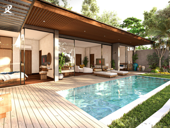 Step outside to discover a sparkling swimming pool, embraced by lush landscaping that enhances the villa’s serene atmosphere. Whether you’re basking in the Bali sun or enjoying a refreshing dip, this outdoor oasis is designed for pure indulgence.